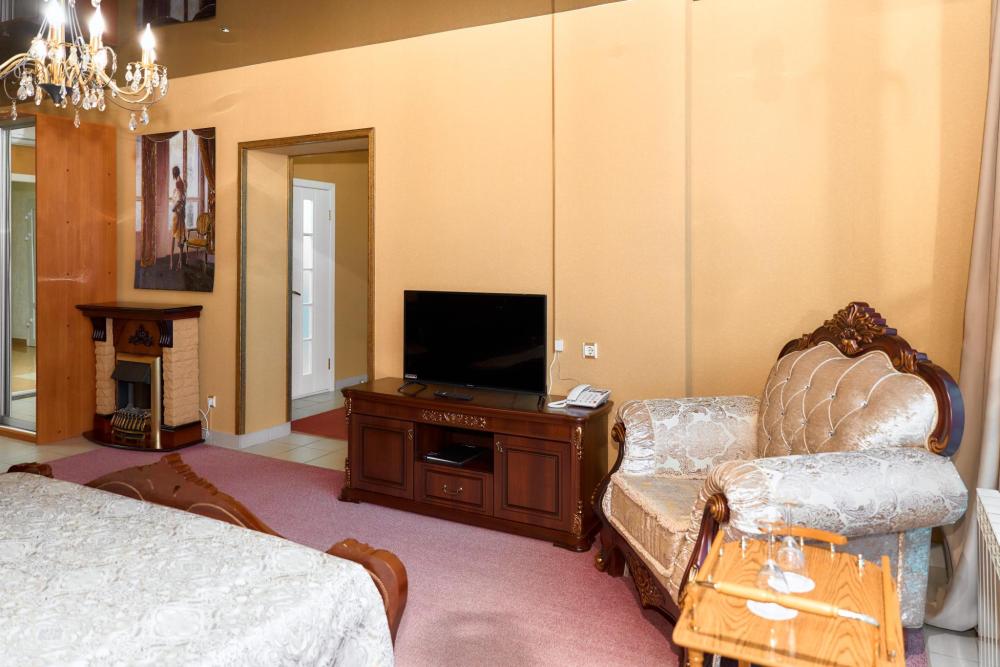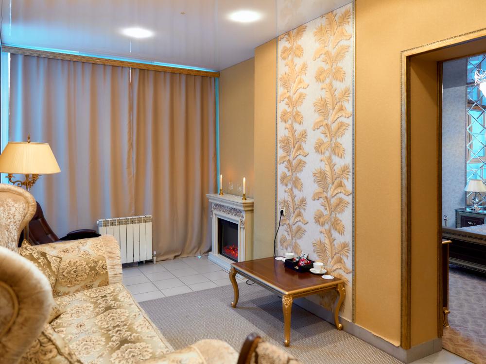Площадь номера составляет 60 м.кв. В номере: 2-х спальная кровать, диван, кресло, телевизор, камин, туалетный стоик с зеркалом, холодильник, телефон, кондиционер, сейф, сервировочный столик, журнальный столик, шкаф-купе, халат (мужской, женский), тапочки, чайник, чайный набор, мини-бар (пополняемый ежедневно). Ванная комната:душевая кабина, унитаз, фен, косметика Премиум класса,набор полотенец.