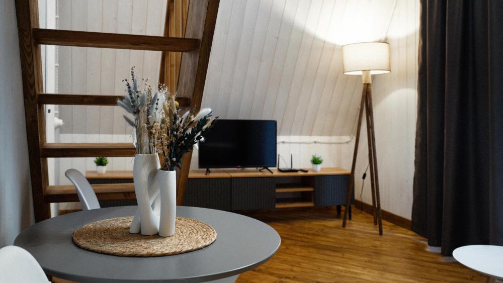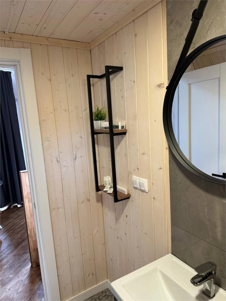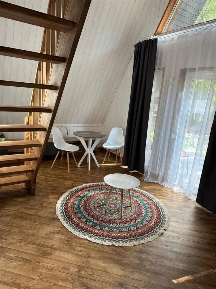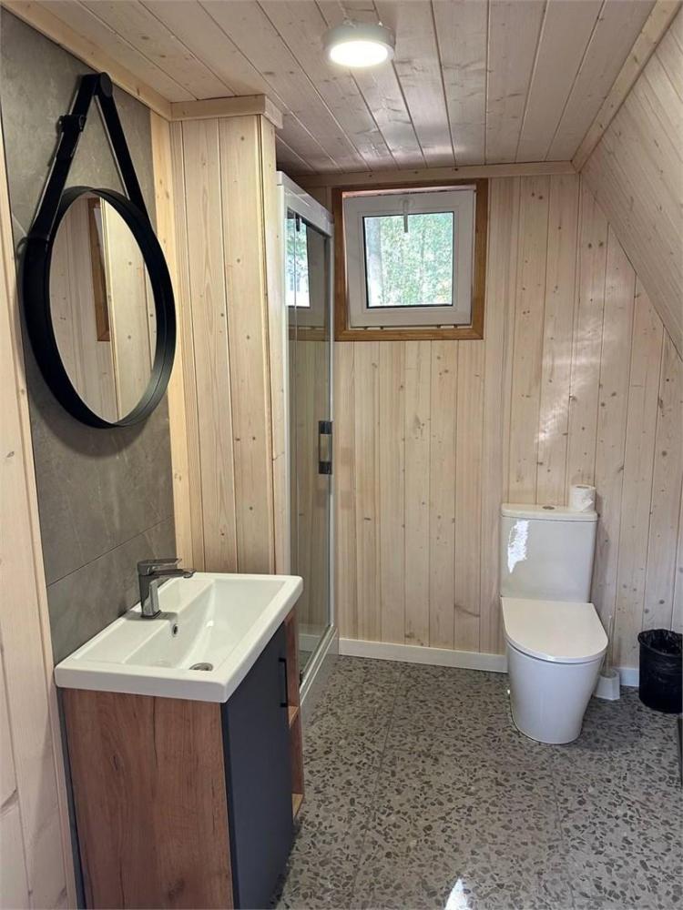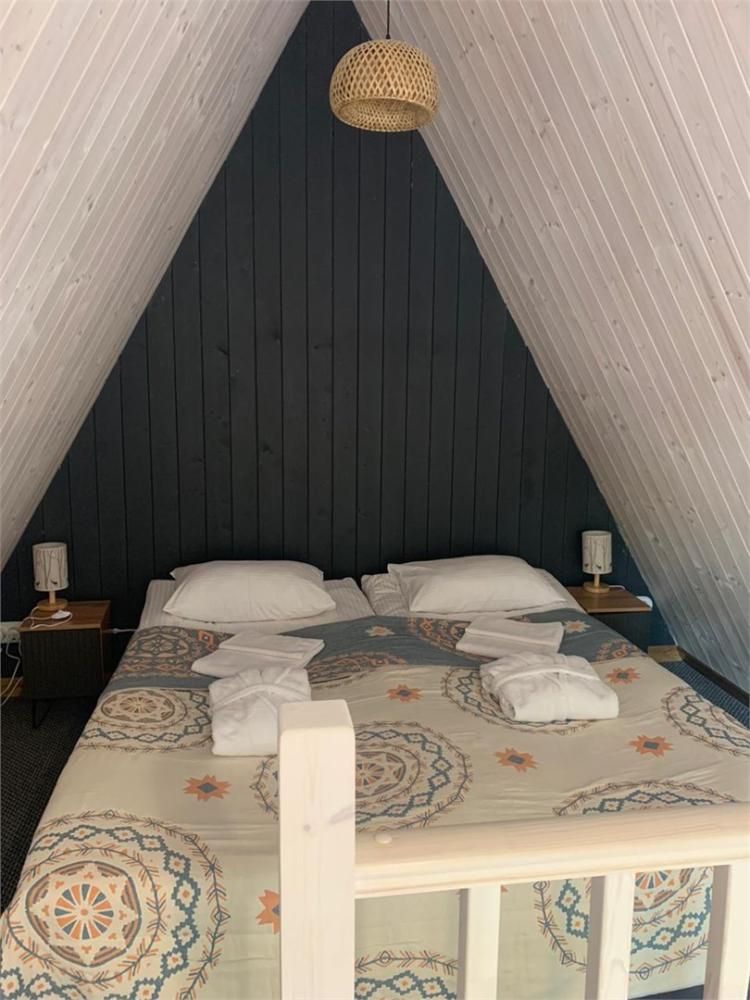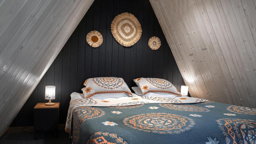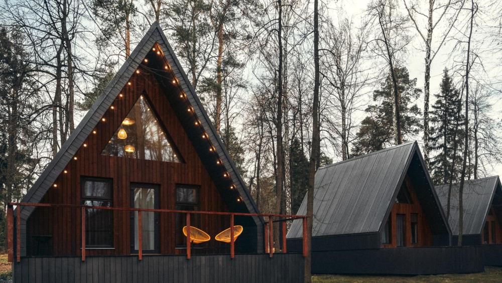 Двухуровневый треугольный домик в стиле A-Frame для размещения до 4-х гостей. Часть домов оборудована электрической сауной или кухней, которые создаёт уютную атмосферу зимой и осенью. В доме есть балкон-патио со столом и стульями. В гостиной на нижнем уровне — раскладной диван, телевизор, холодильник, набор посуды, чайник, обеденный стол со стульями. На верхнем уровне — две односпальные кровати размером 90х200 см или одна двуспальная кровать 180х200 см с матрасами COMFORT PLUS. Санузел с душевой кабиной, феном, набором косметических принадлежностей и комплектом полотенец.