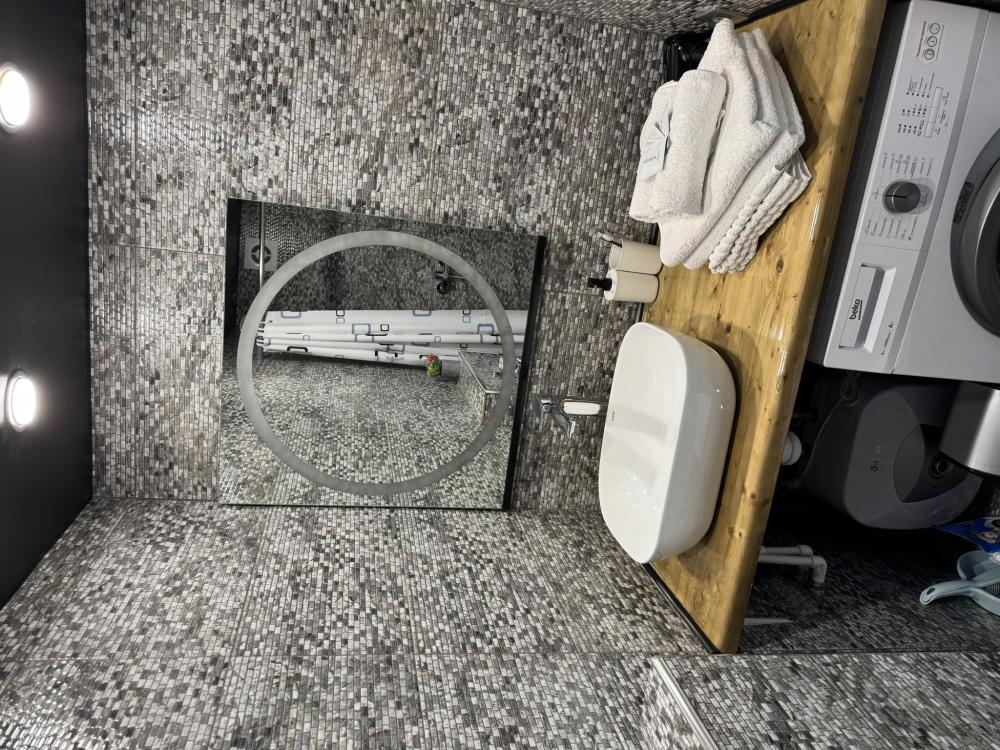 Двухуровневые апартаменты. Первый этаж - просторная гостиная - обеденный стол, диван, смарт TV, зона кухни, ванная комната. Второй этаж - двуспальная кровать. Также в номере - посудомоечная и стиральная машина, холодильник, микроволновая печь, варочная панель, набор посуды и приборов для приготовления и приёма пищи, кондиционер, wi-fi.