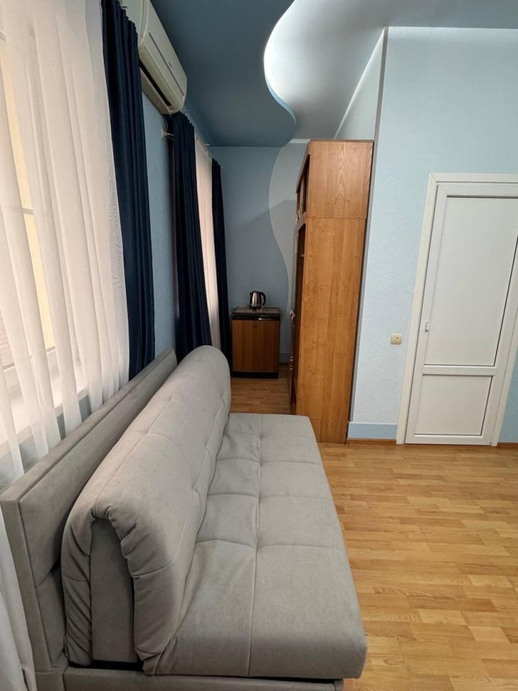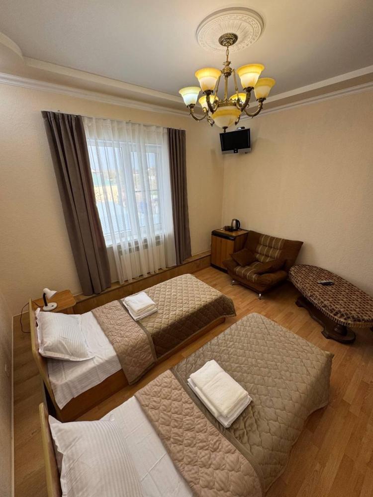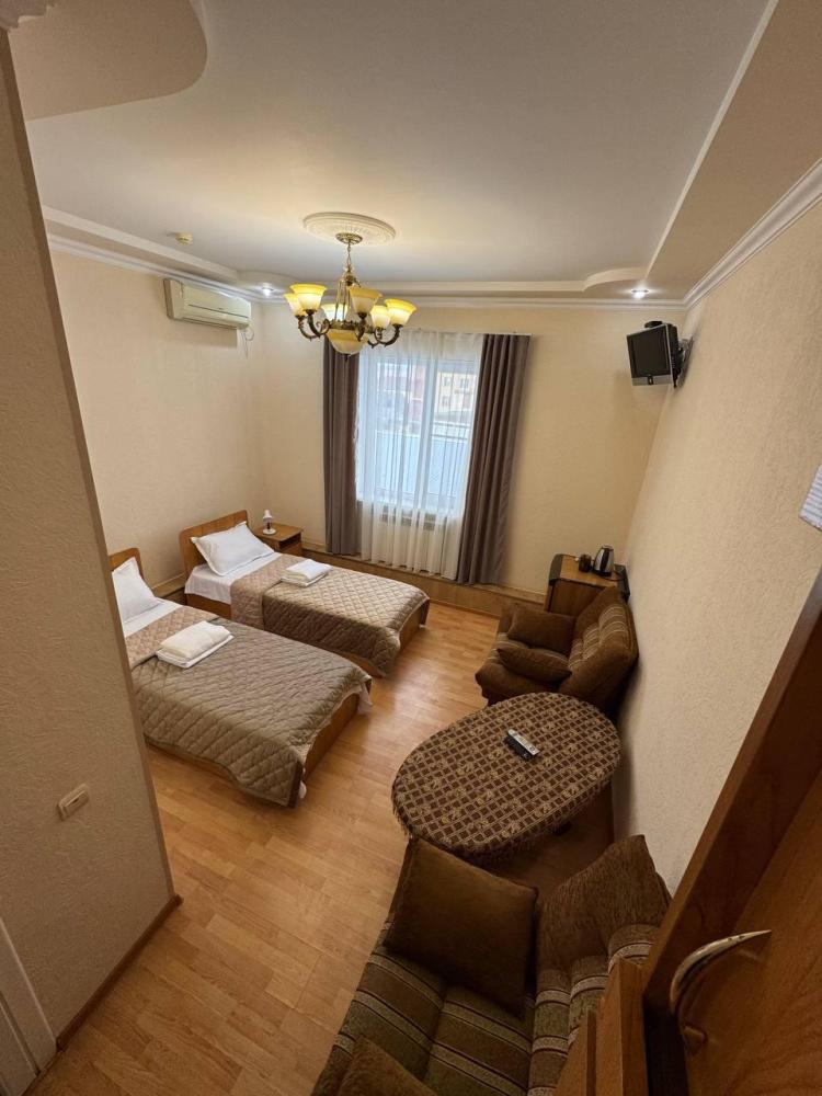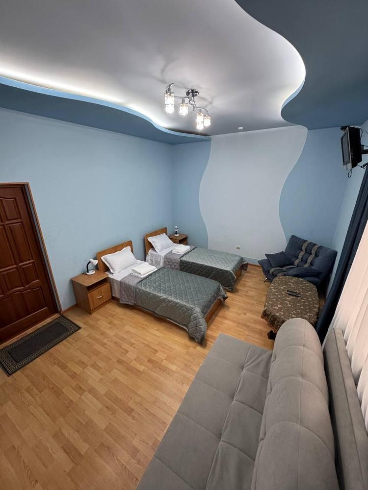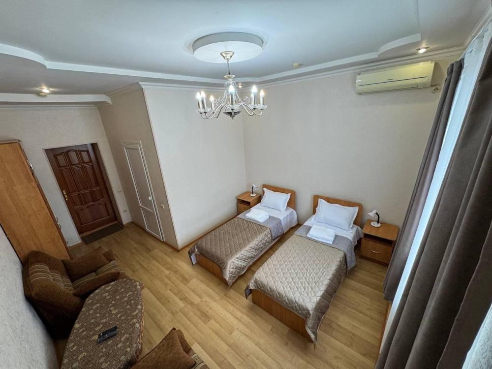 Номер с 2 односпальными кроватями,а так же мягкой зоной: диван, два кресла, оснащен кондиционером, телевизором с плоским экраном и холодильником.