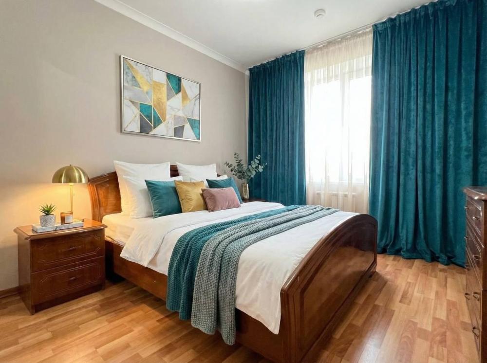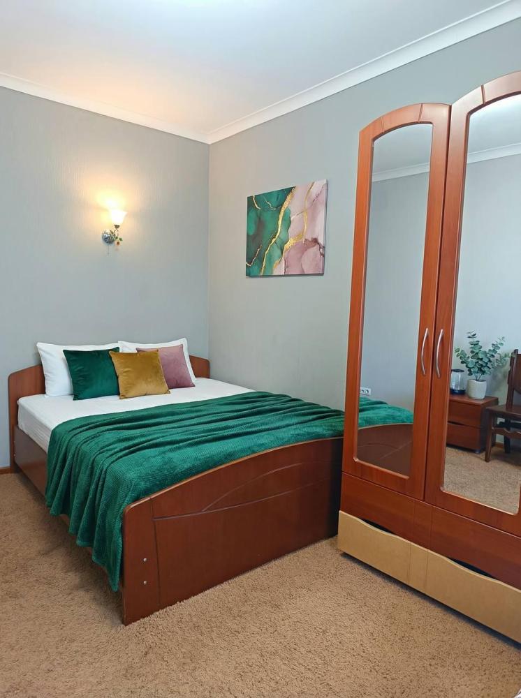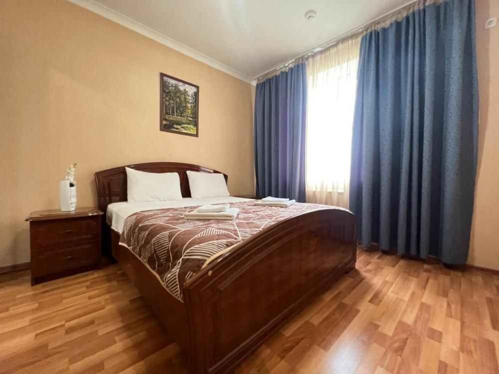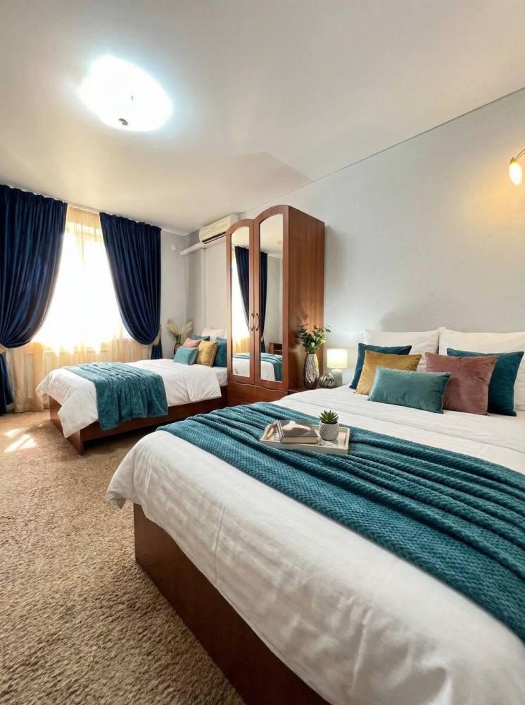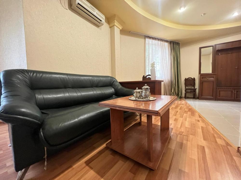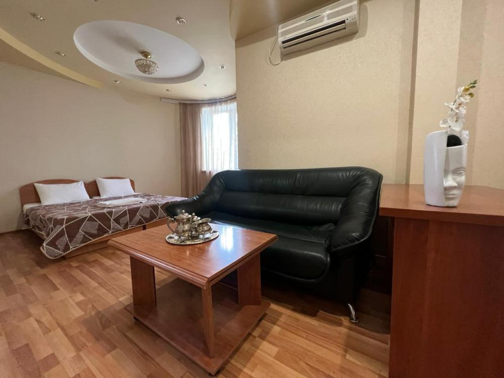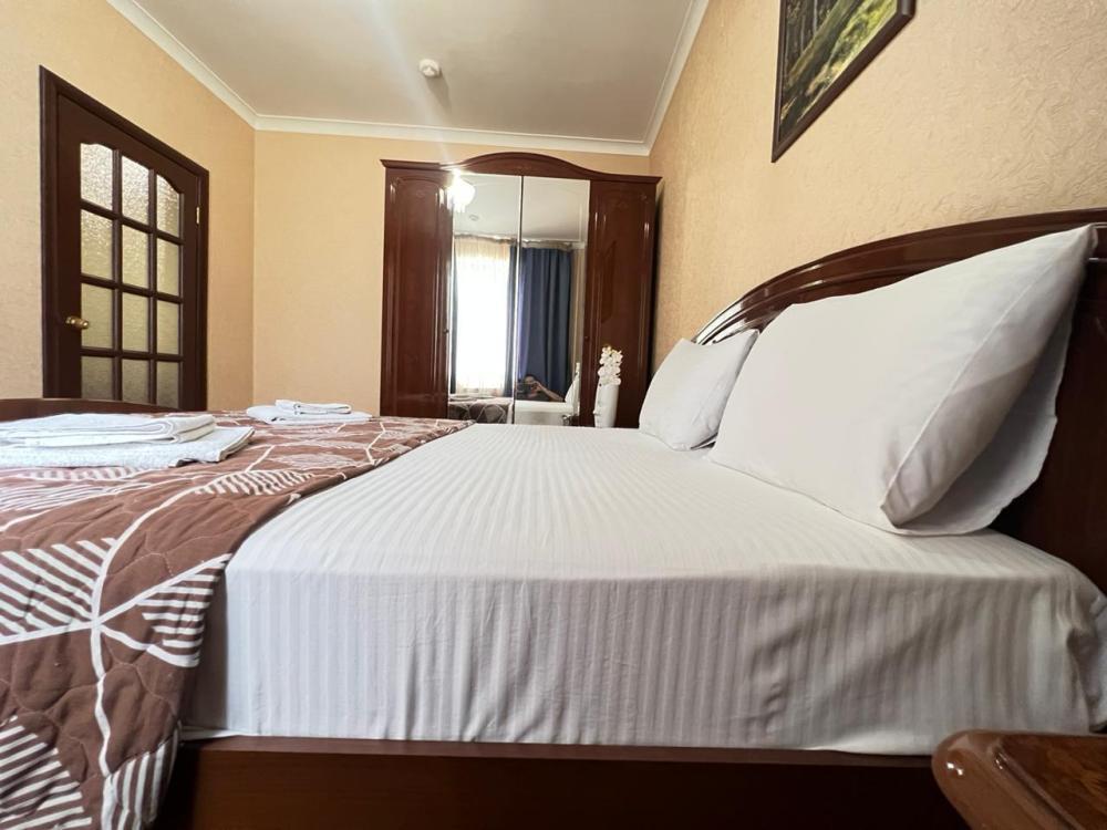 Просторный двухкомнатный номер с большой двуспальной кроватью и комфортным диваном. Идеально подойдет для комфортного размещения семьи из 4-х человек. Есть возможность поставить доп. место. В номере есть все самое необходимое для комфортного проживания: вместительный шкаф и прикроватная тумб, кондиционер, телевизор, холодильник, чайник. Ванная комната оснащена душем, феном. Каждому гостю выдаются по 2 мягких полотенца, гигиенический набор, халат и тапочки