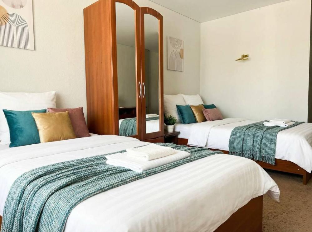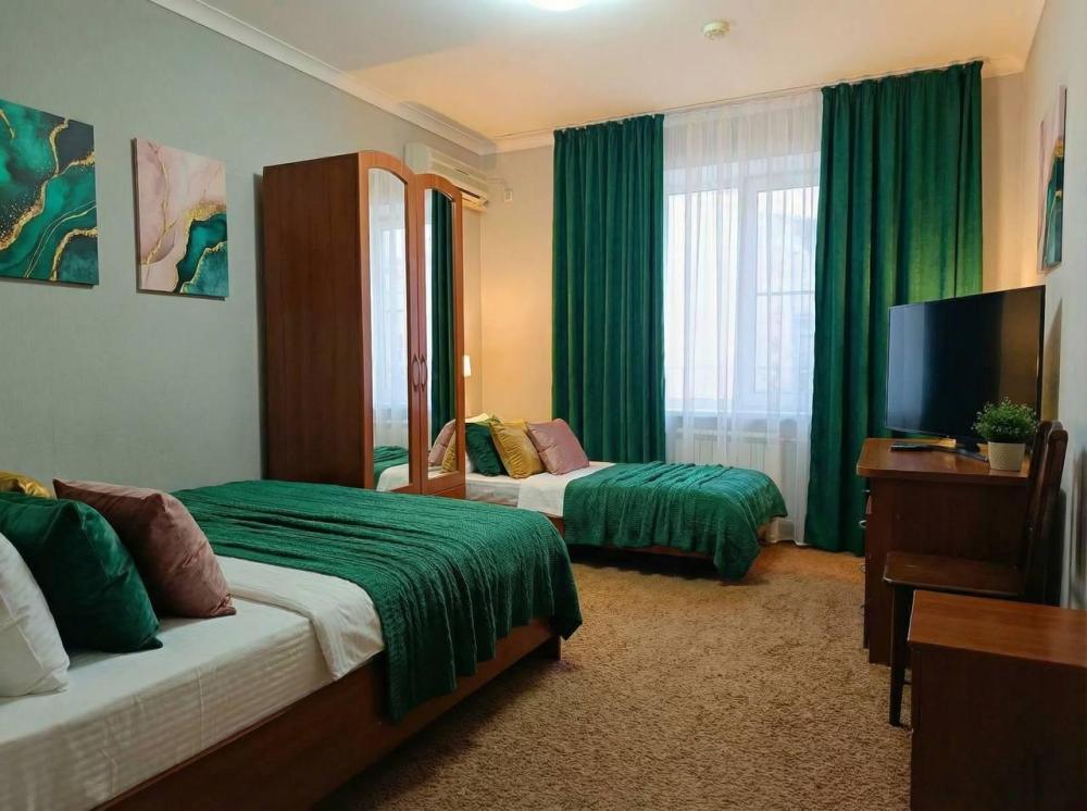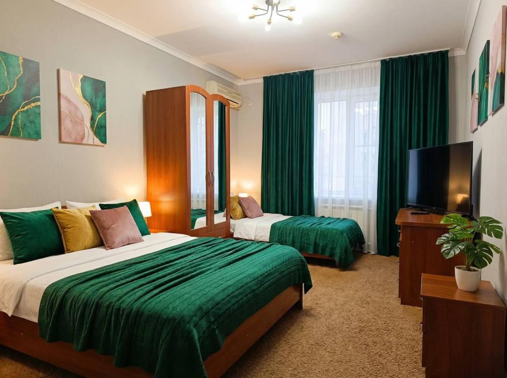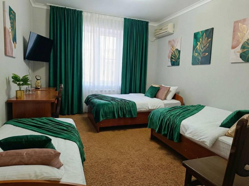 Вместительный трехместный номер с тремя раздельными кроватями (альтернативный вариант большая двухспальная кроватью и односпальная) заправленные чистым постельным бельем. В номере есть все самое необходимое для комфортного проживания: вместительный шкаф и прикроватная тумба, кондиционер, телевизор, холодильник. Ванная комната оснащена душевой кабиной, феном. Каждому гостю выдается мягкое полотенце и гигиенический набор