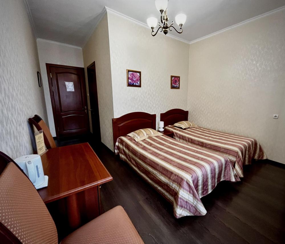Двухместный номер стандарт общей площадью 20 кв.м. Оснащение номера: две односпальные кровати, телевизор, кондиционер, мини-холодильник, чайник, рабочая зона, ванная комната с душем, набор полотенец, туалетно-гигиенические принадлежности.
