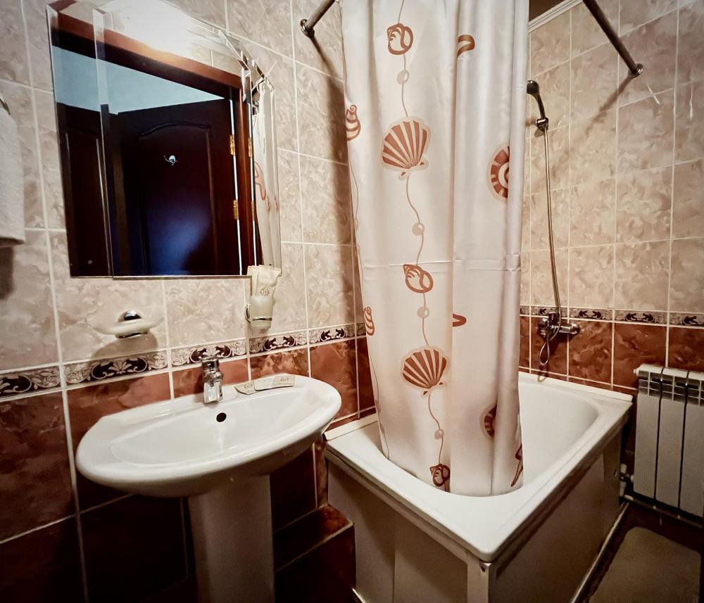 Трехместный номер стандарт семейный общей площадью 27 кв.м. Оснащение номера: двухспальная кровать, диван, телевизор, кондиционер, мини-холодильник, чайник, рабочая зона, ванная комната с душем, набор полотенец, туалетно-гигиенические принадлежности.