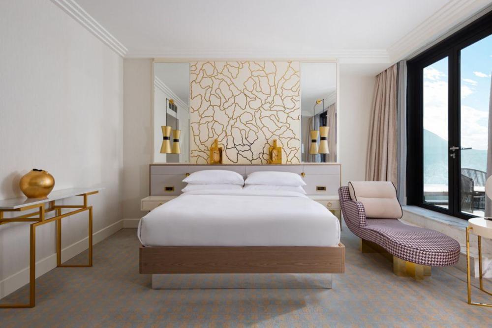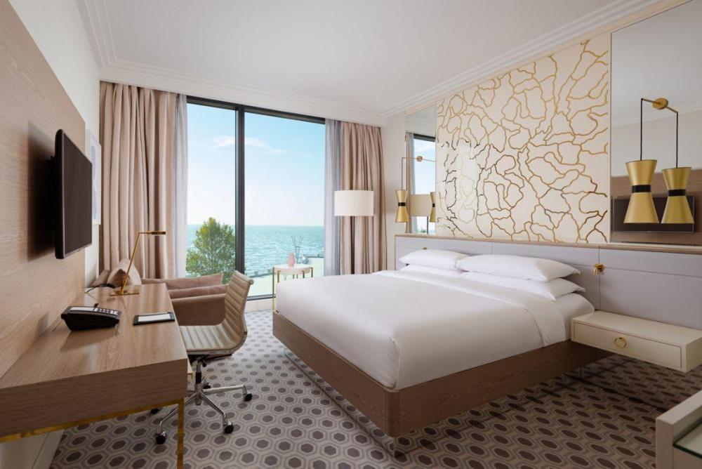 Двухместный номер с 1 кроватью размера king-size площадью 32 кв.м. и хорошо оборудованной собственной ванной комнатой с ванной, душем, биде, феном и тапочками. В числе удобств этого просторного номера с видом на море — кондиционер, звукоизоляция, телевизор с плоским экраном и спутниковыми каналами, бесплатный WI-FI, кофемашина и принадлежности для чая/кофе. Гости могут посещать представительский лаундж.