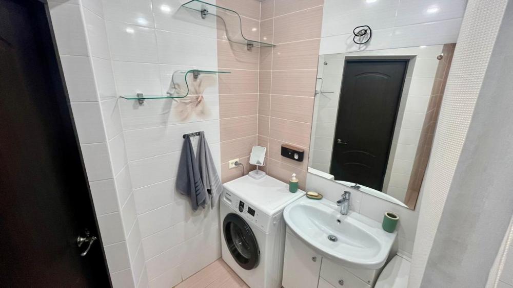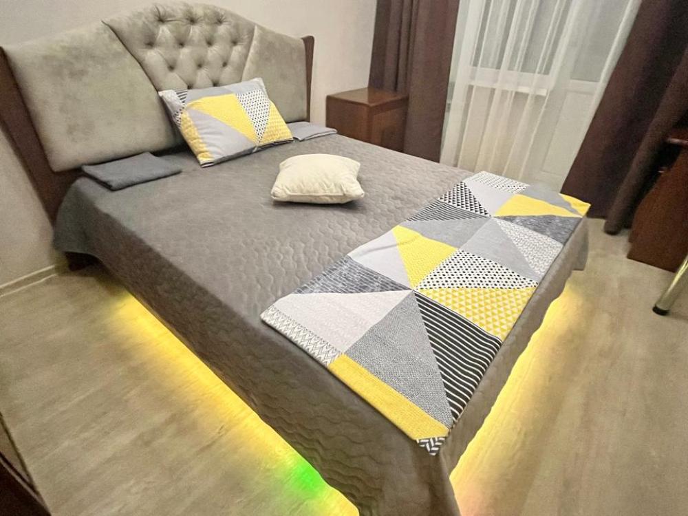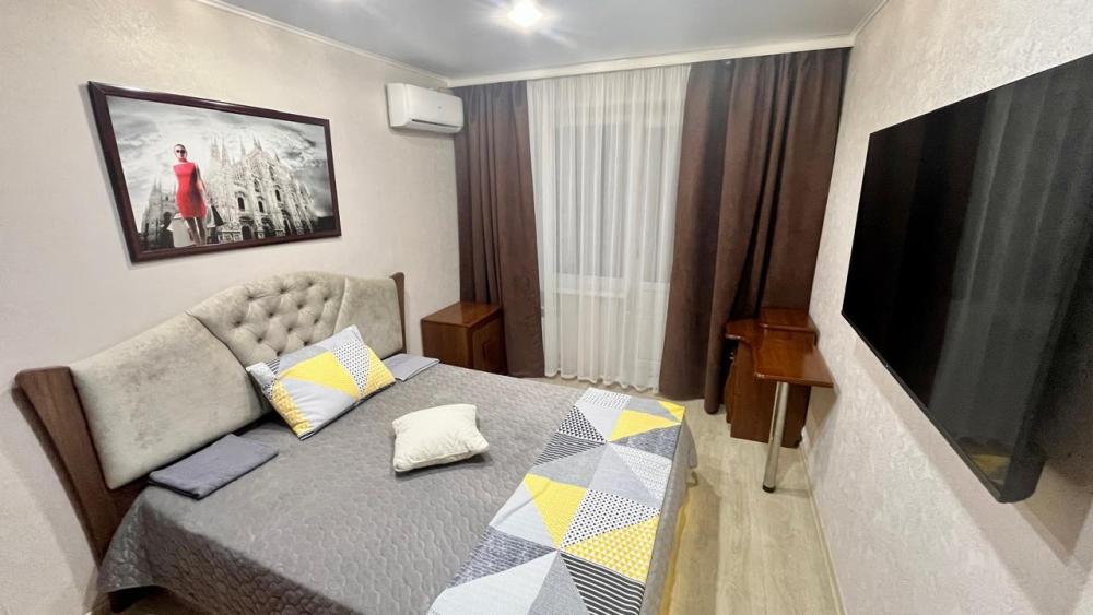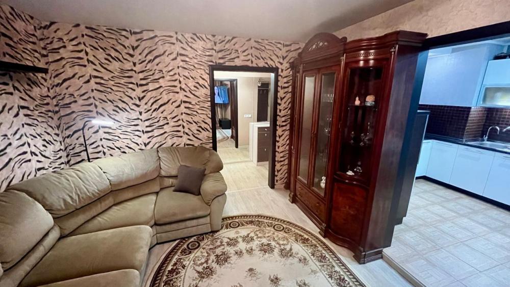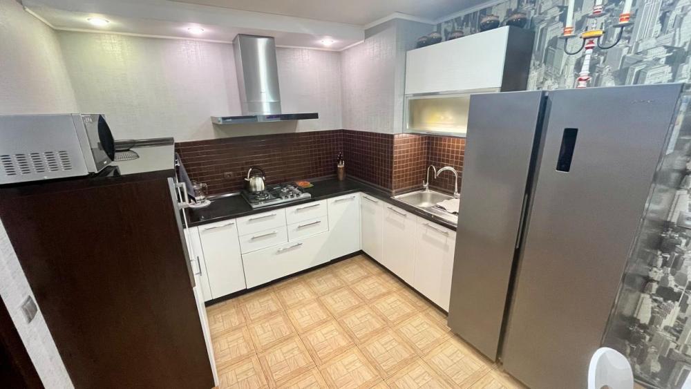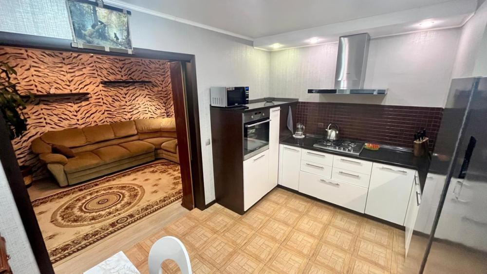 Квартира обладает продуманным пространством, включающим три изолированные комнаты, что позволяет разместиться большой семье или компании друзей. В каждой комнате установлены удобные кровати, шкафы для одежды и другие необходимые предметы мебели. Гостиная оборудована мягкой мебелью, телевизором и обеденной зоной, создавая атмосферу домашнего тепла и уюта. Современная кухня оснащена всем необходимым для приготовления пищи: плита, холодильник, микроволновая печь, электрочайник и набор посуды. Санузел совмещенный, оснащен душевой кабиной, что обеспечивает дополнительное удобство для гостей.