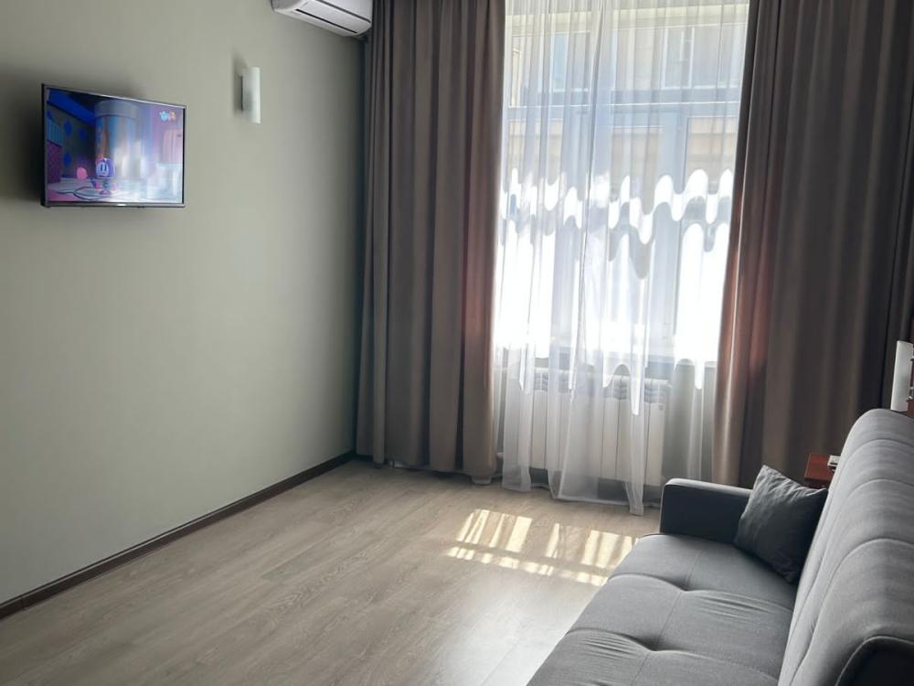 В номере 1 двуспальная кровать, телевизор, рабочая зона.