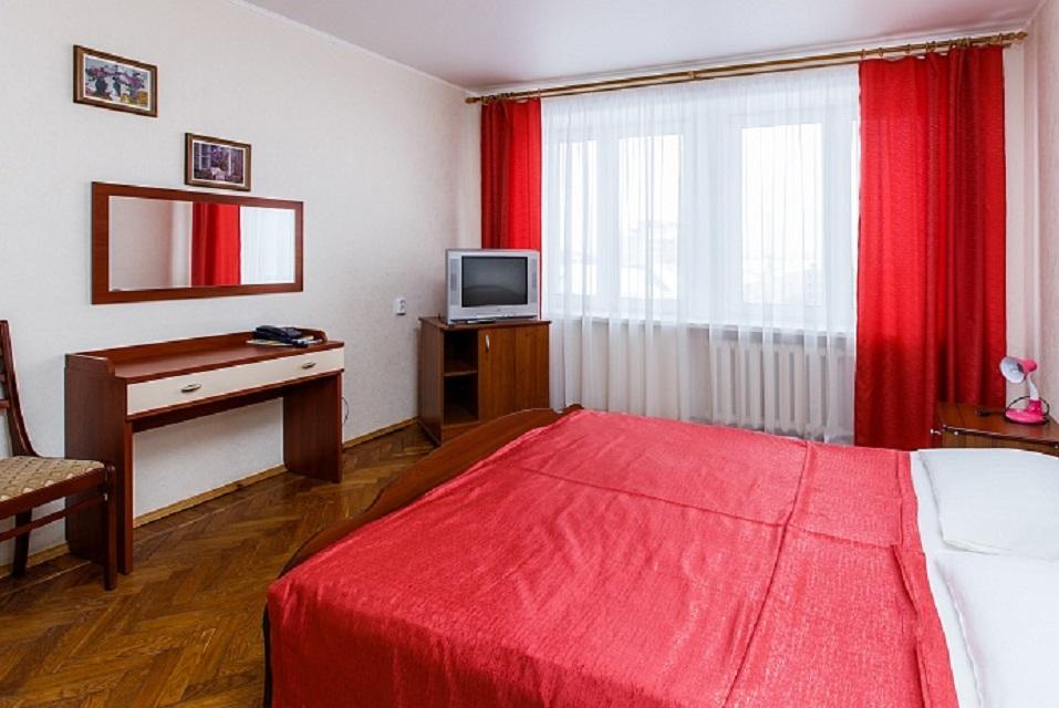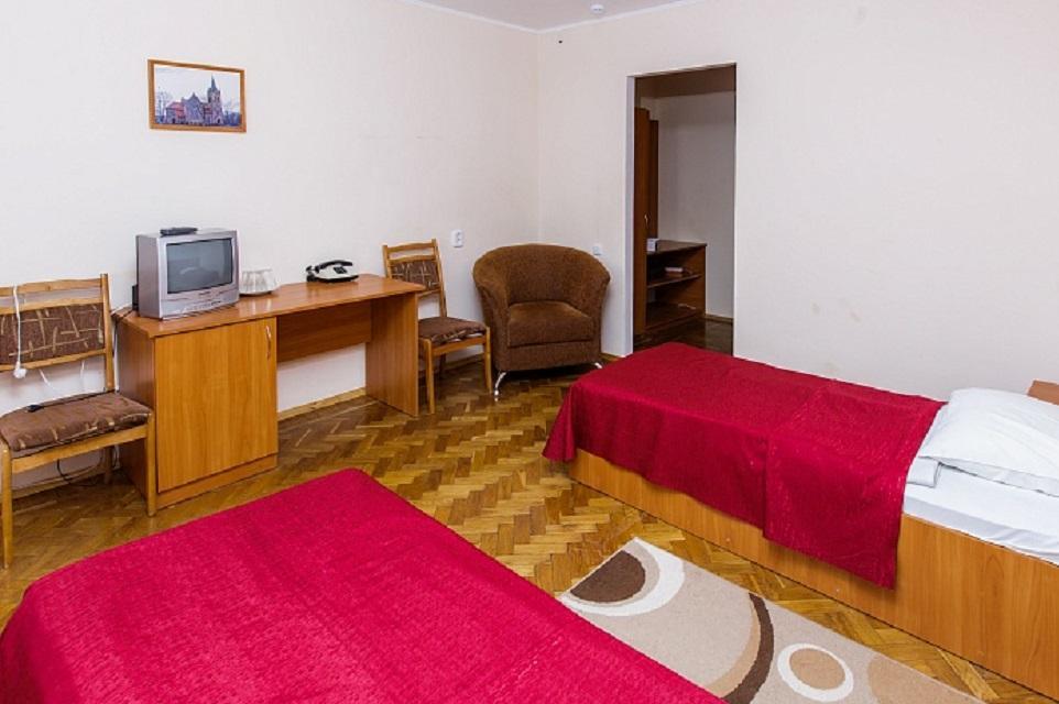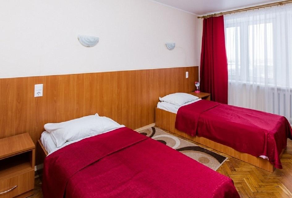 Двухместный однокомнатный номер ТВИН «СТАНДАРТ» с двумя односпальными кроватями (90x200). Общая площадь номера — 23 м2. В номере рабочий стол, телевизор, ванная комната (душ, туалет, умывальник, косметические принадлежности), кабельное телевидение, холодильник, Wi-Fi, телефон, чайник, фен (по запросу), просторный шкаф для багажа и предметов гардероба.
