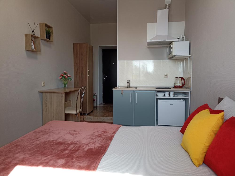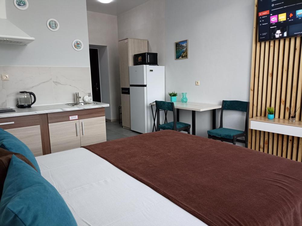 В апартаментах имеется своя полностью укомплектованная кухня с бытовой техникой (холодильник, СВЧ, Эл. чайник, варочная панель, вытяжка) и посудой. Smart TV, Wi-FI, двухспальная кровать, шкаф для одежды, фен. Собственная ванная комната с душем.и теплым полом.