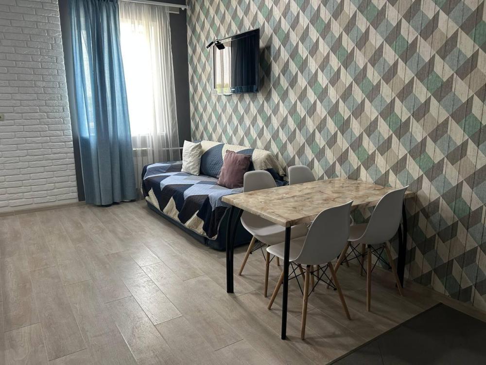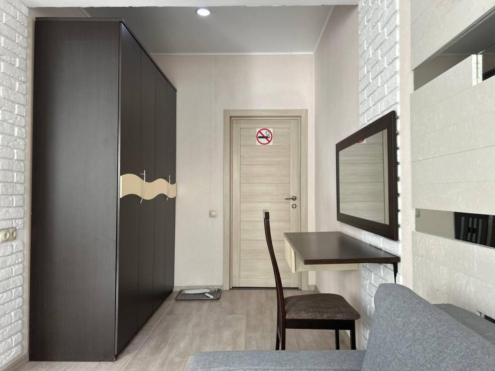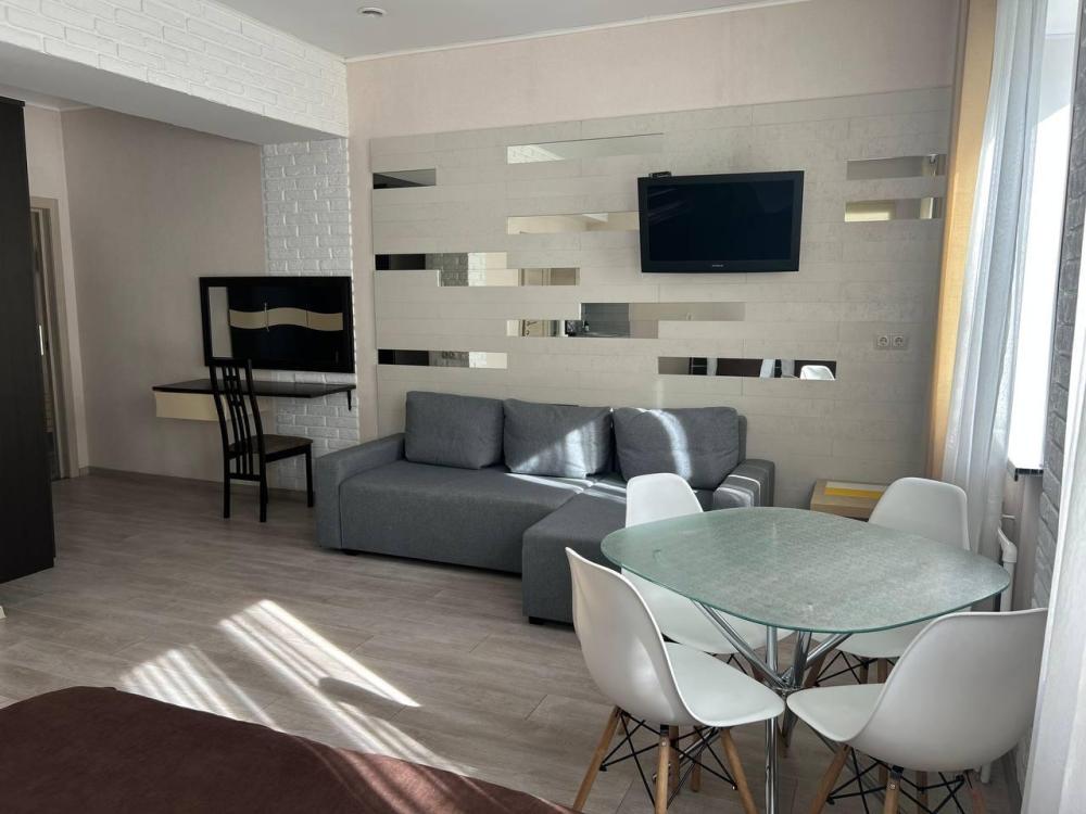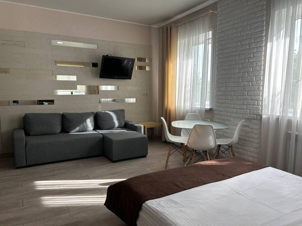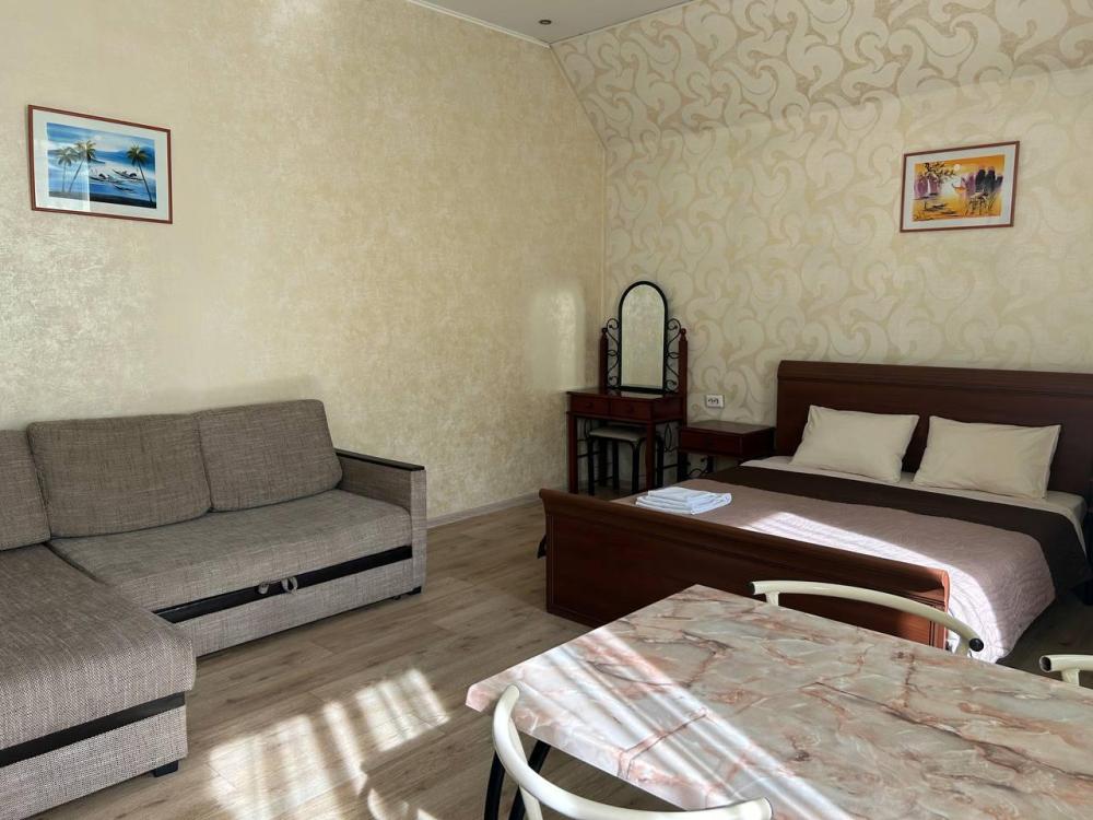 Улучшенный номер с двухместной кроватью и белым постельным бельем , диваном (раскладывается), телевизор, обеденный стол, кухонная зона, чайник, посуда, чай, вместительный шкаф-купе, собственная ванная комната с душем и туалетом, холодильник.