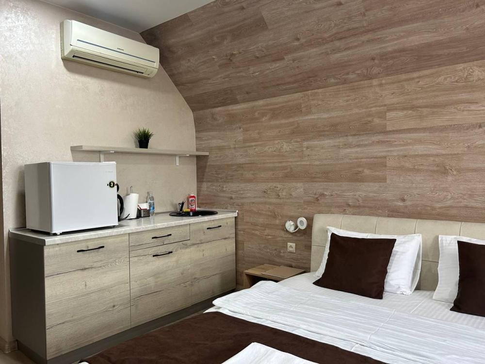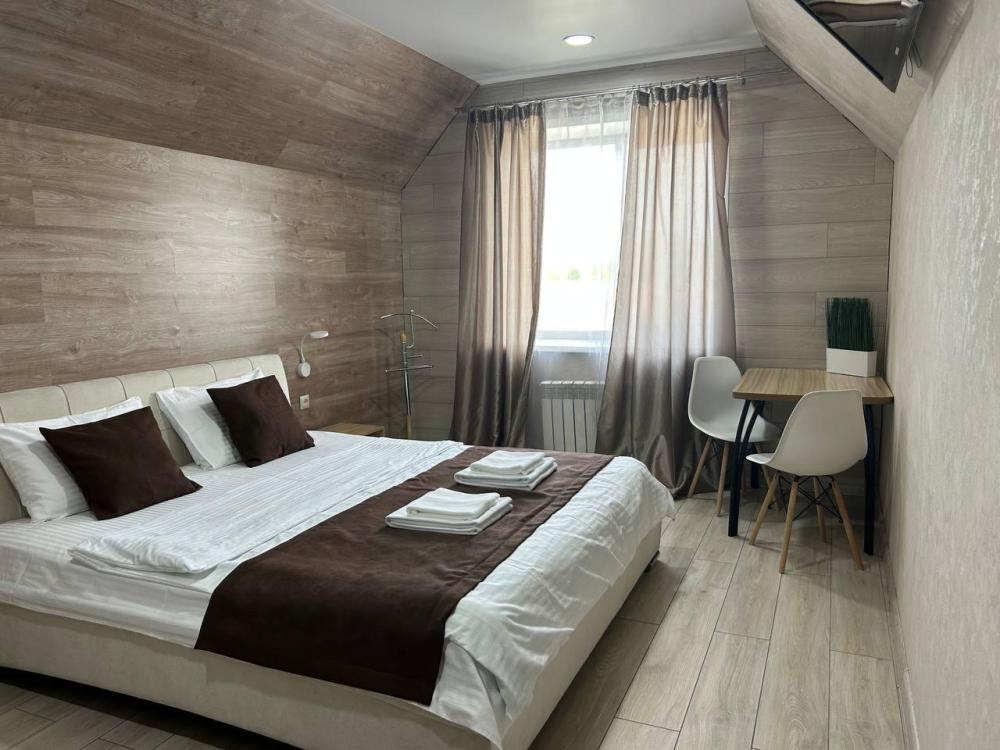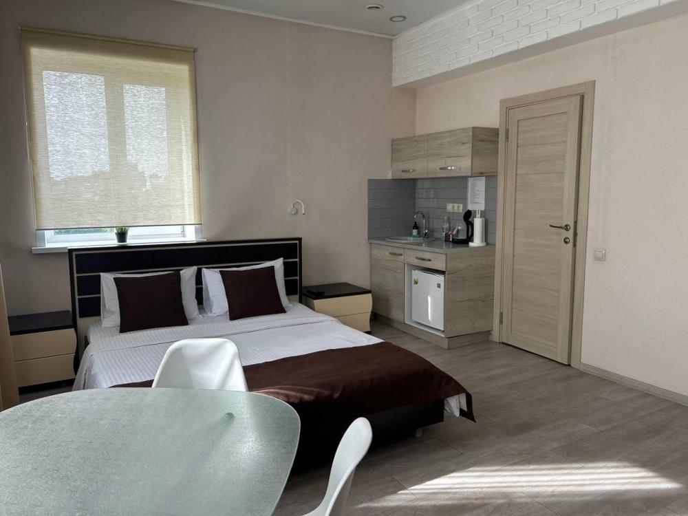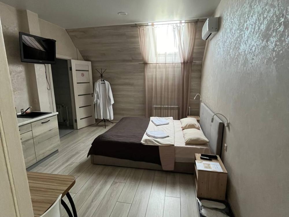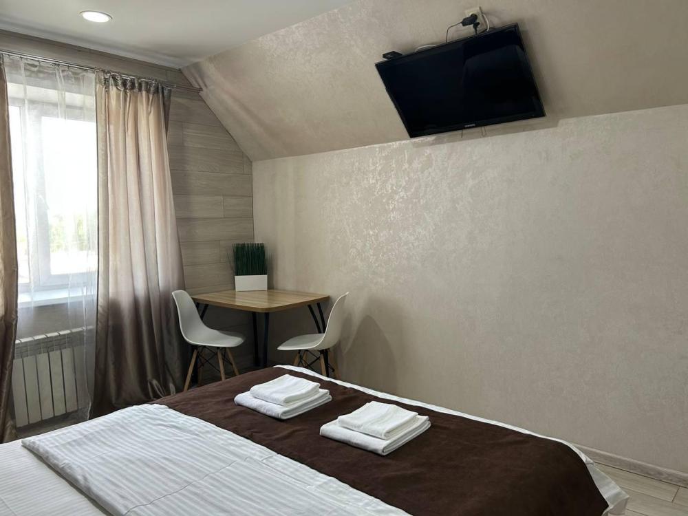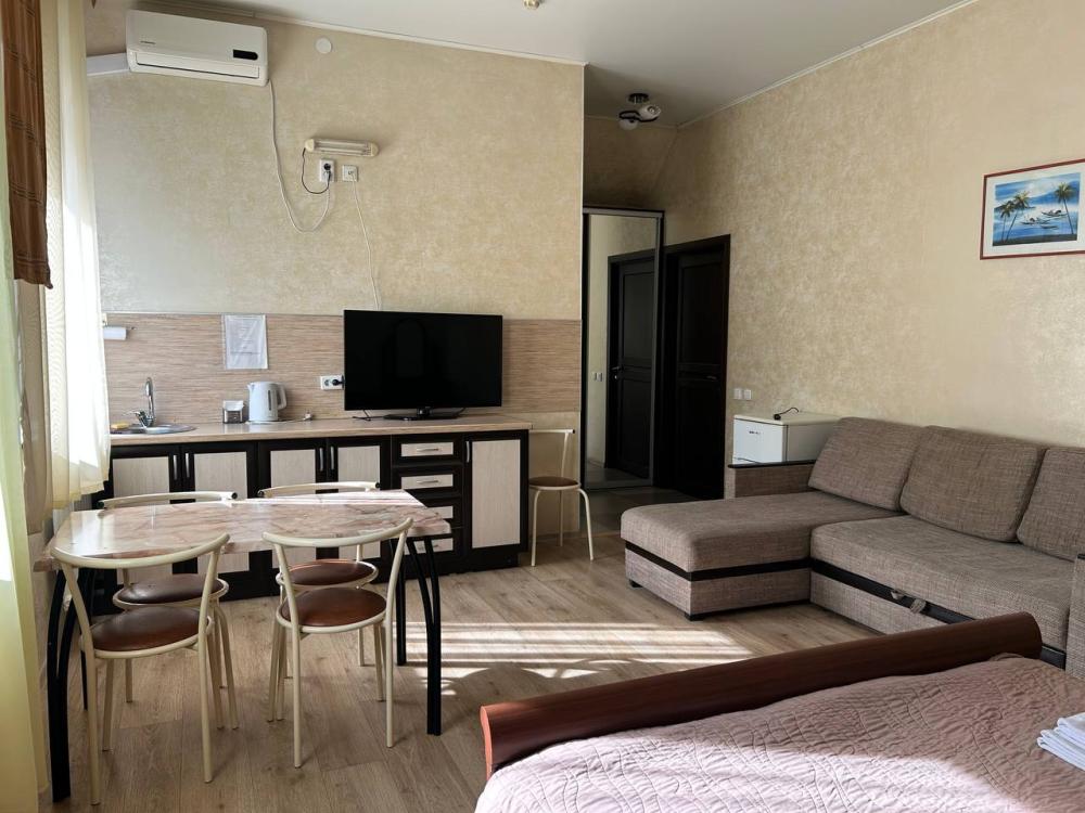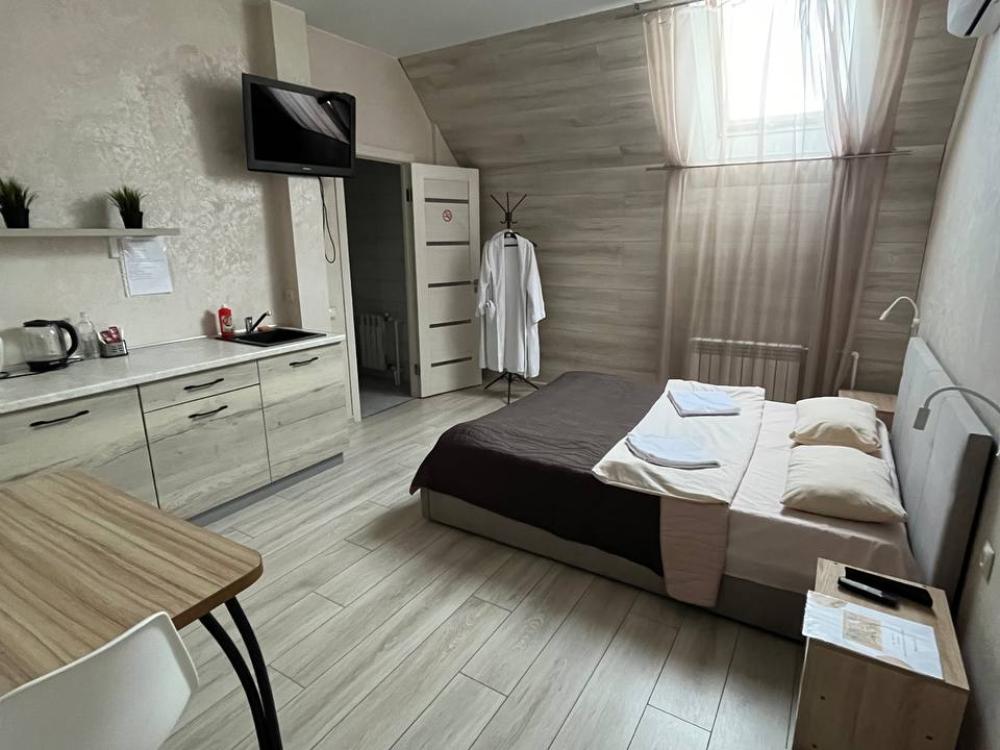 Улучшенный номер с собственной ванной комнатой и санузлом. В номере есть кухонная зона, посуда, телевизор, обеденный стол, двуспальная кровать и прикроватные тумбочки. Также в стоимость номера входят полотенца, халаты, чай, кофе и вода.