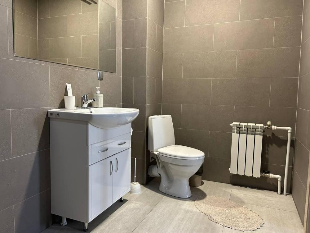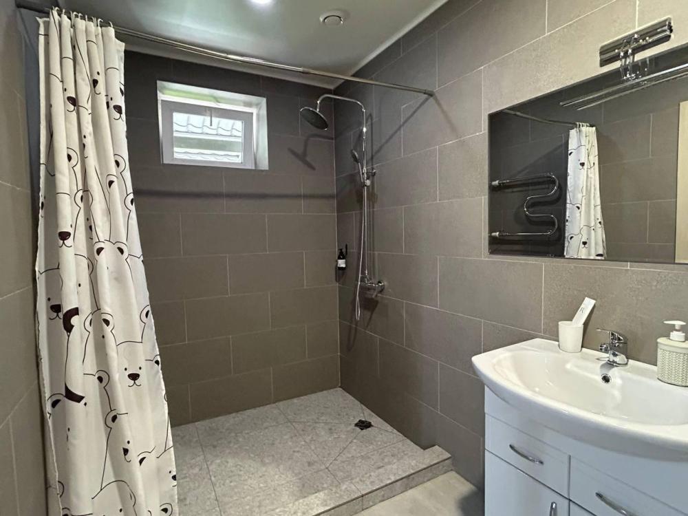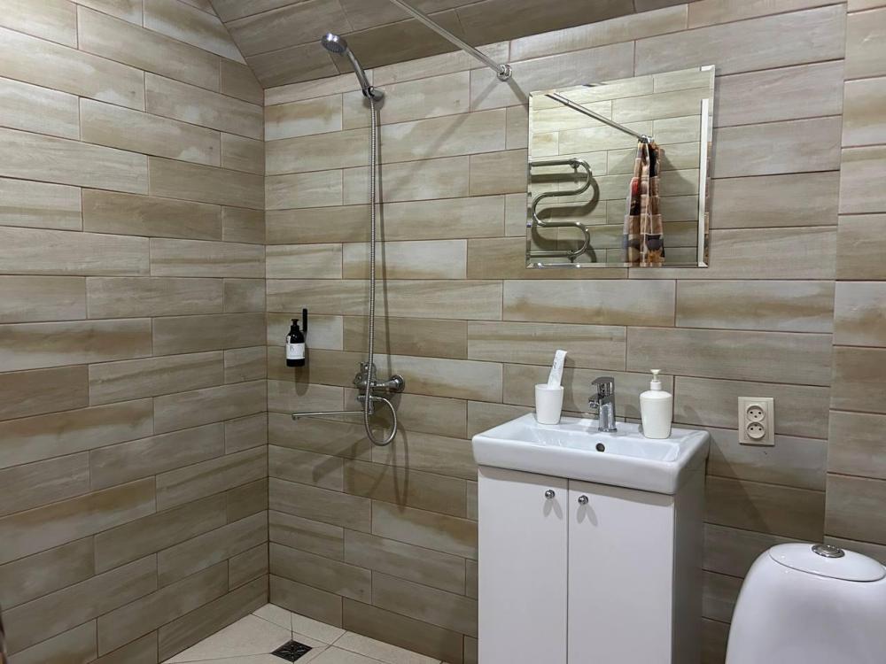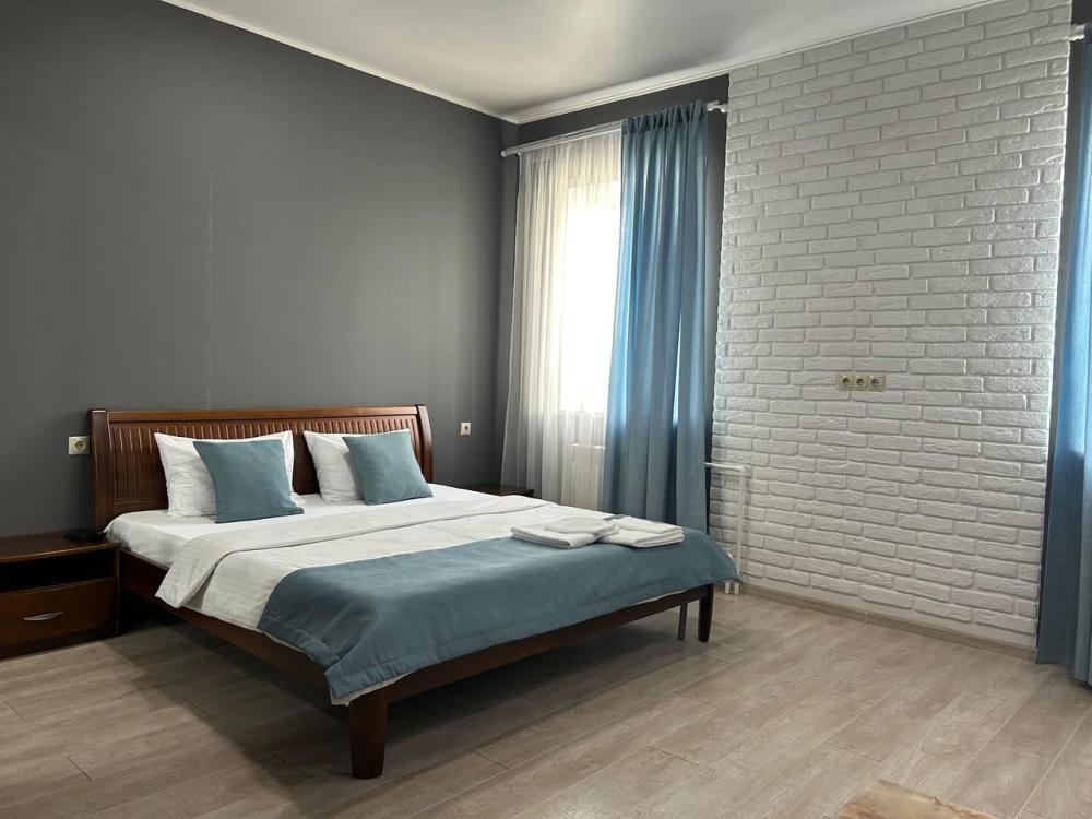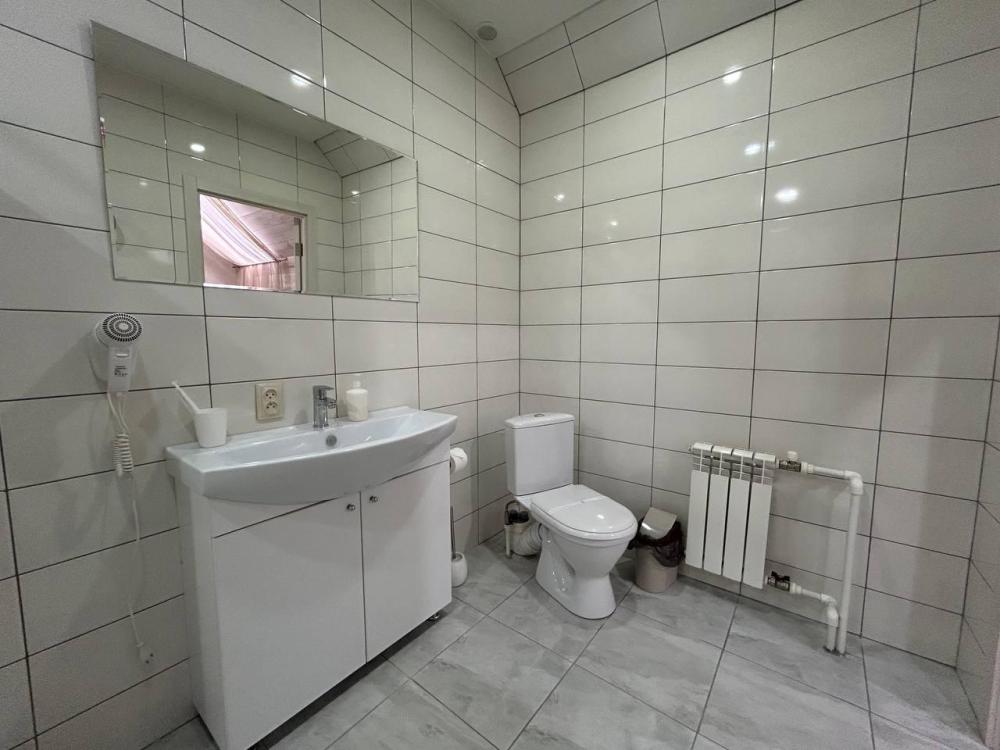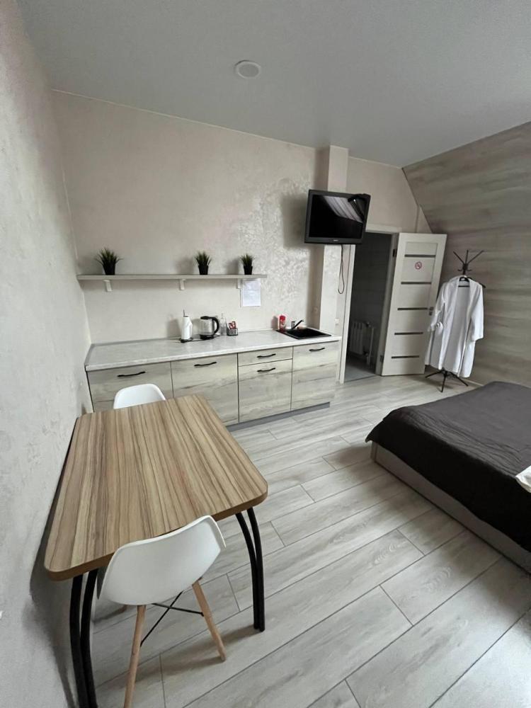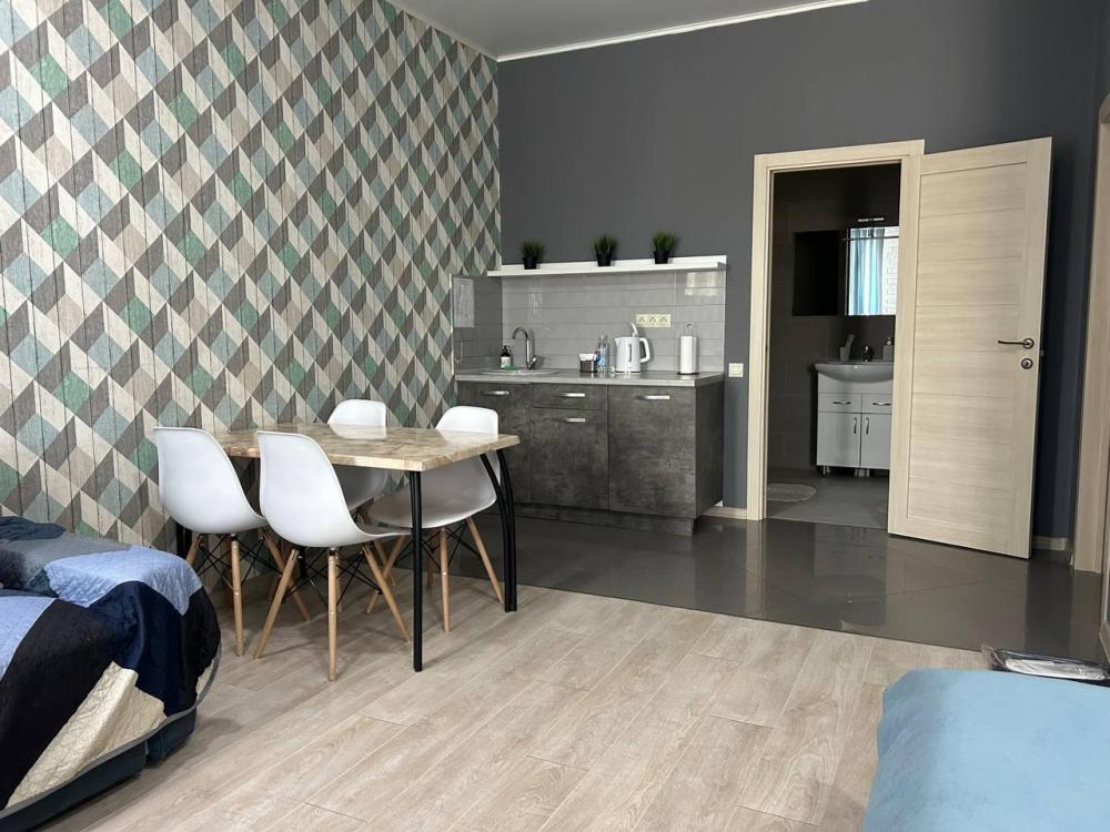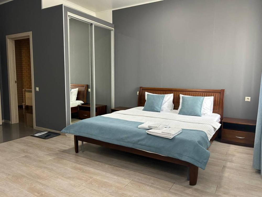 Улучшенный номер с собственной ванной комнатой и санузлом. В номере есть кухонная зона, посуда, телевизор, обеденный стол, двуспальная кровать и прикроватные тумбочки. Также в стоимость номера входят полотенца, халаты, чай, кофе и вода.