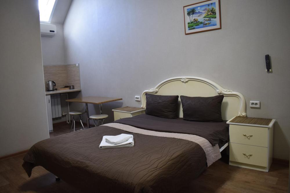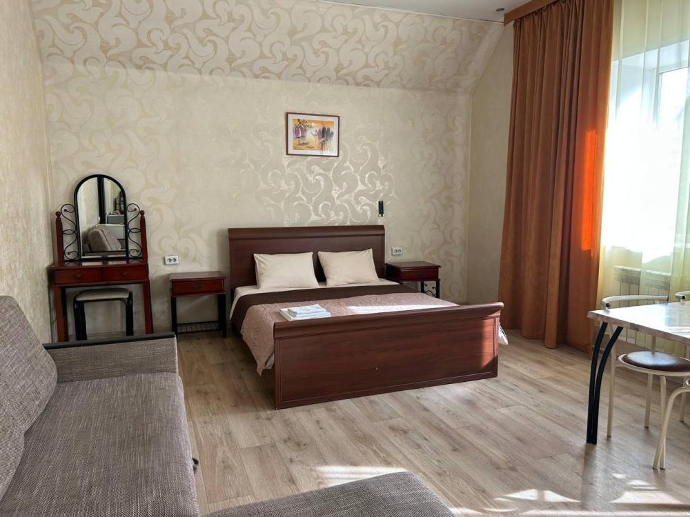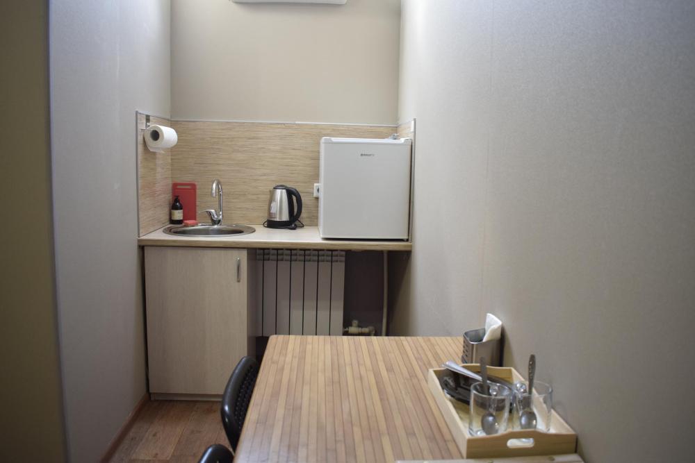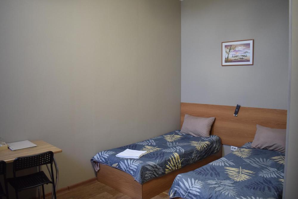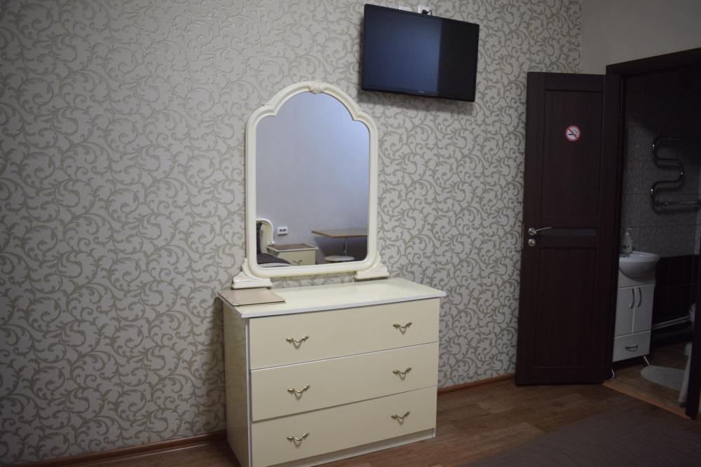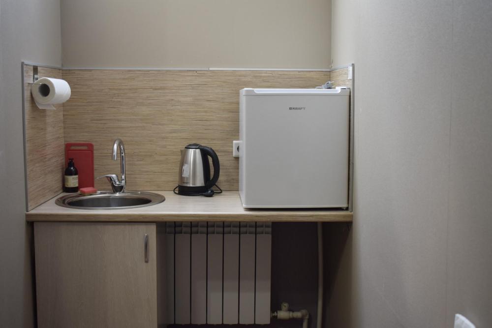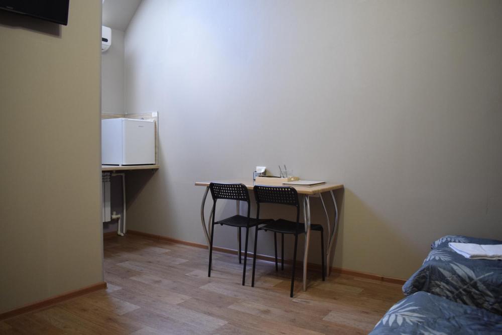 Комфортный номер с собственной ванной комнатой и туалетом. В номере есть телевизор, двухместная кровать, кухонная зона, посуда, чайник, холодильник. Возможен вариант размещения с двумя одноместными кроватями.