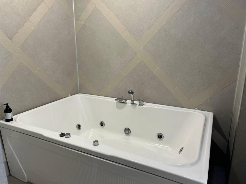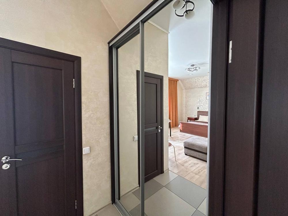 Номер Люкс с ванной джакузи (без гидромассажа), двухместной кроватью с белым постельным бельем, диваном (раскладывается), кухонной зоной, чайником, холодильником, микроволновой печью, посудой, обеденным столом и собственной ванной комнатой с санузлом, а также вместительным шкафом в прихожей и туалетным столиком.