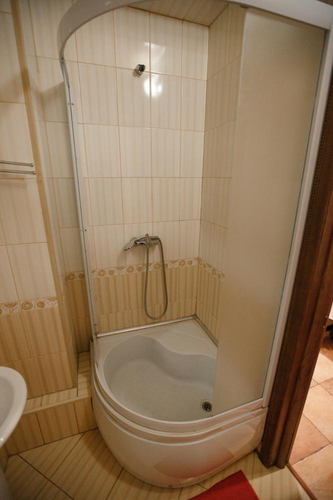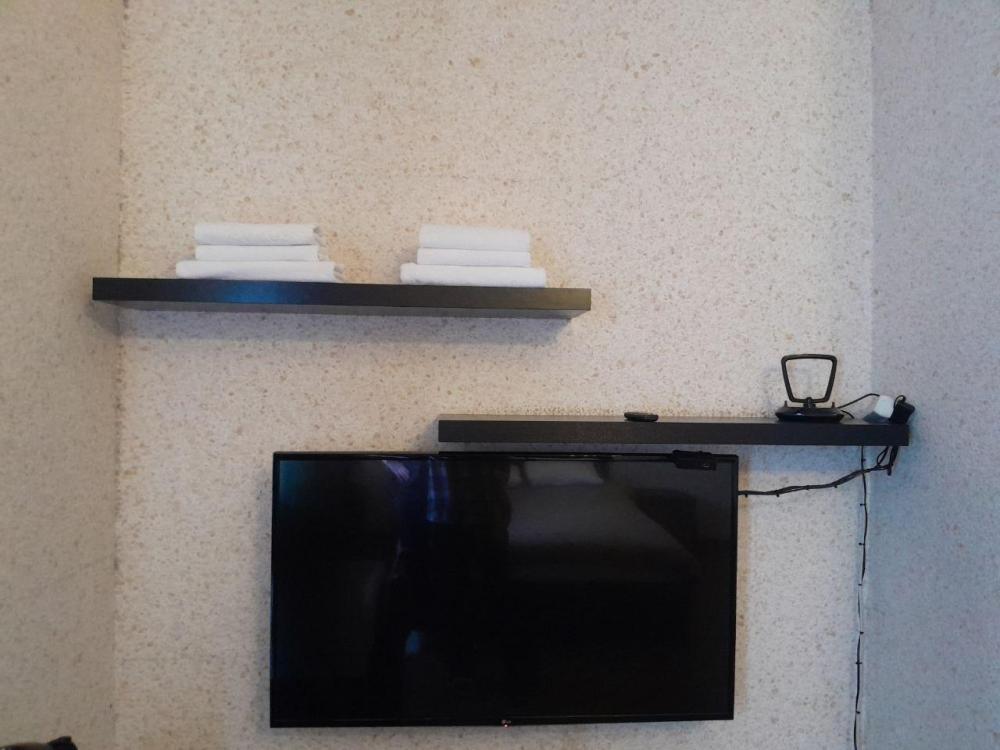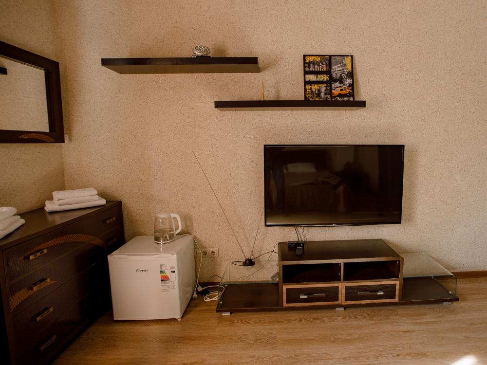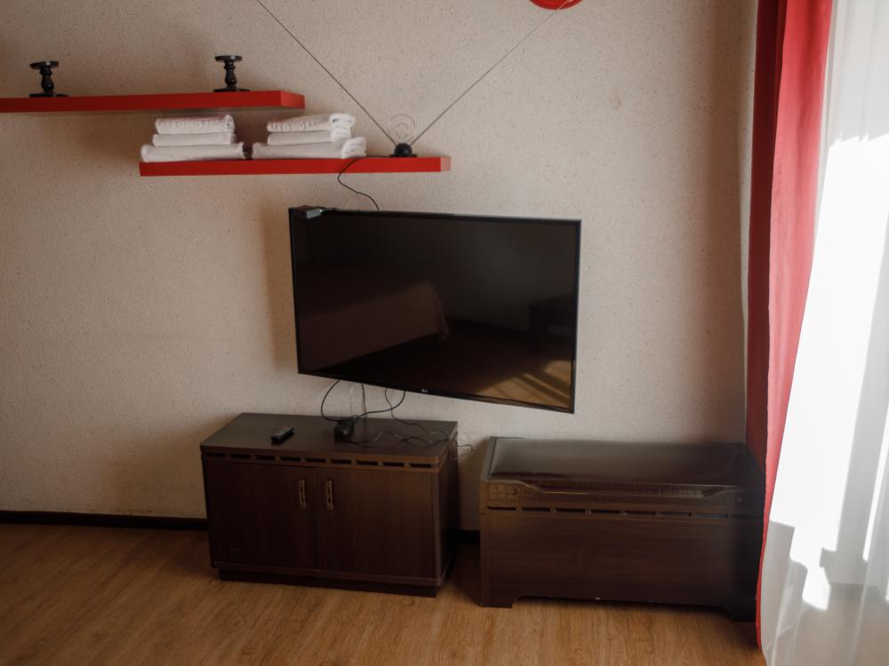 В номере: одна большая кровать, душ, санузел, телевизор.