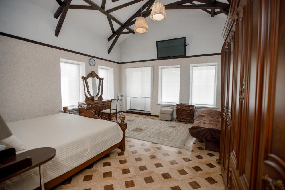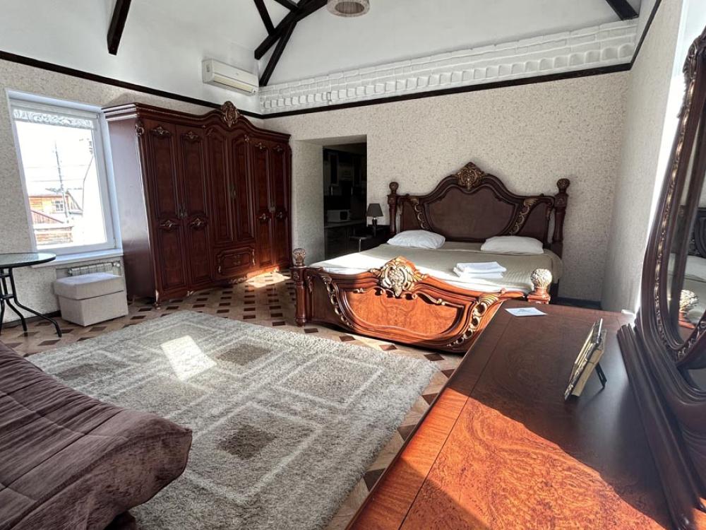Роскошный просторный номер с кондиционером, балконом и кухонной зоной. В номере двуспальная кровать и мебель под старину. Номер идеально подходит для молодожёнов и романтических уик-эндов.