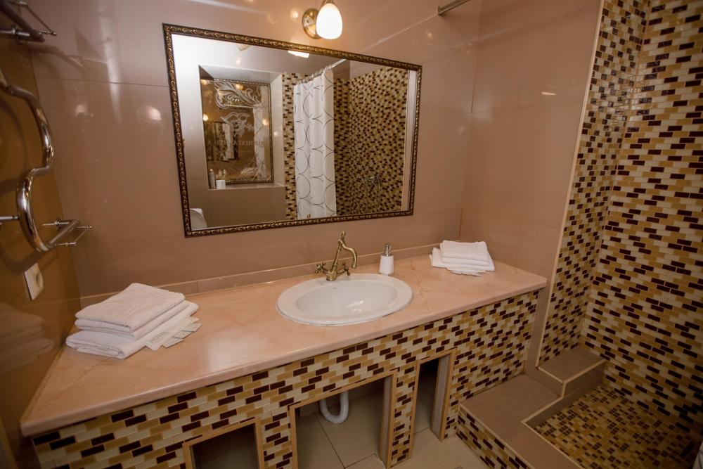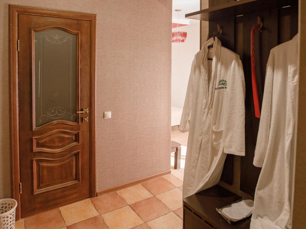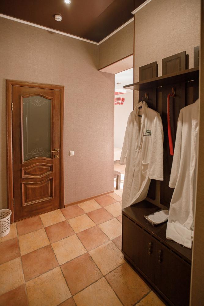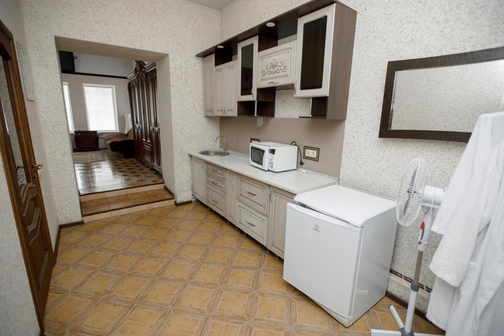 Двухкомнатный просторный номер с особенным расположением в здании, поэтому в номере нет окон. Подходит для многоместного размещения и семей с детьми. 2 смежных комнаты 12 и 25 кв. м. В комнате 25 кв. м. расположен вход в ванную комнату и вторую спальню, 3 односпальные кровати, телевизор. В комнате 12 кв. м. двуспальная кровать. В большой спальне возможно размещение дополнительного спального места - еврораскладушки. Номер расположен на 1 этаже, подходит для маломобильных групп граждан. В мини-отеле есть общая кухня, баня и беседка BBQ.