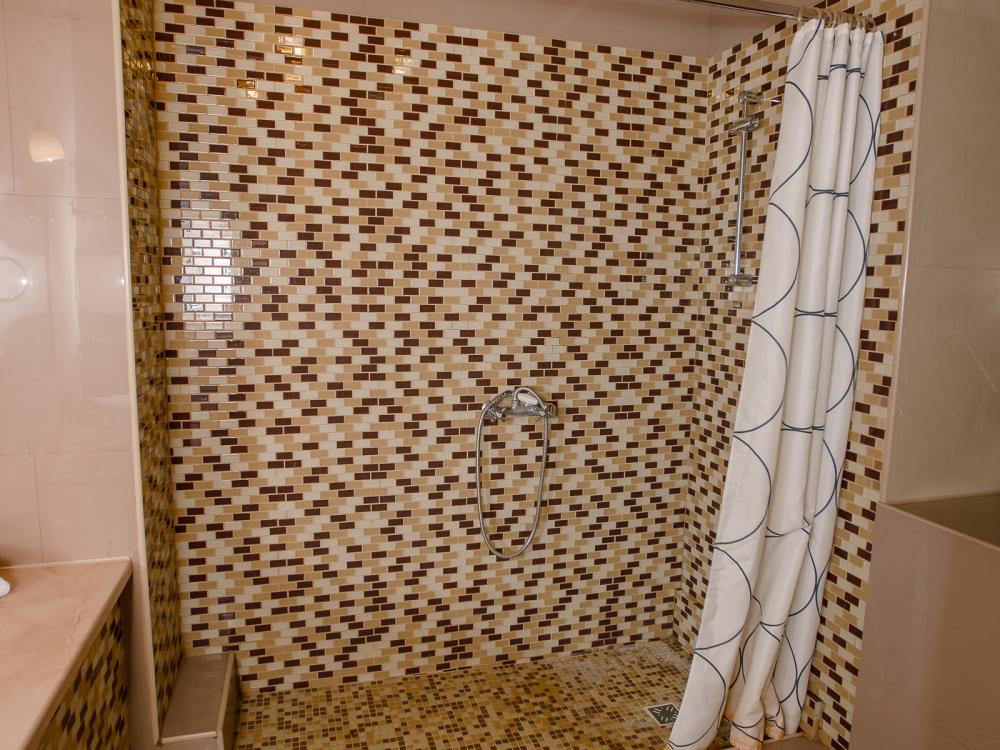 В номере: очень большая кровать, диван, кухня, душ, санузел, телевизор, терраса, шкаф для одежды, трюмо, кондиционер.