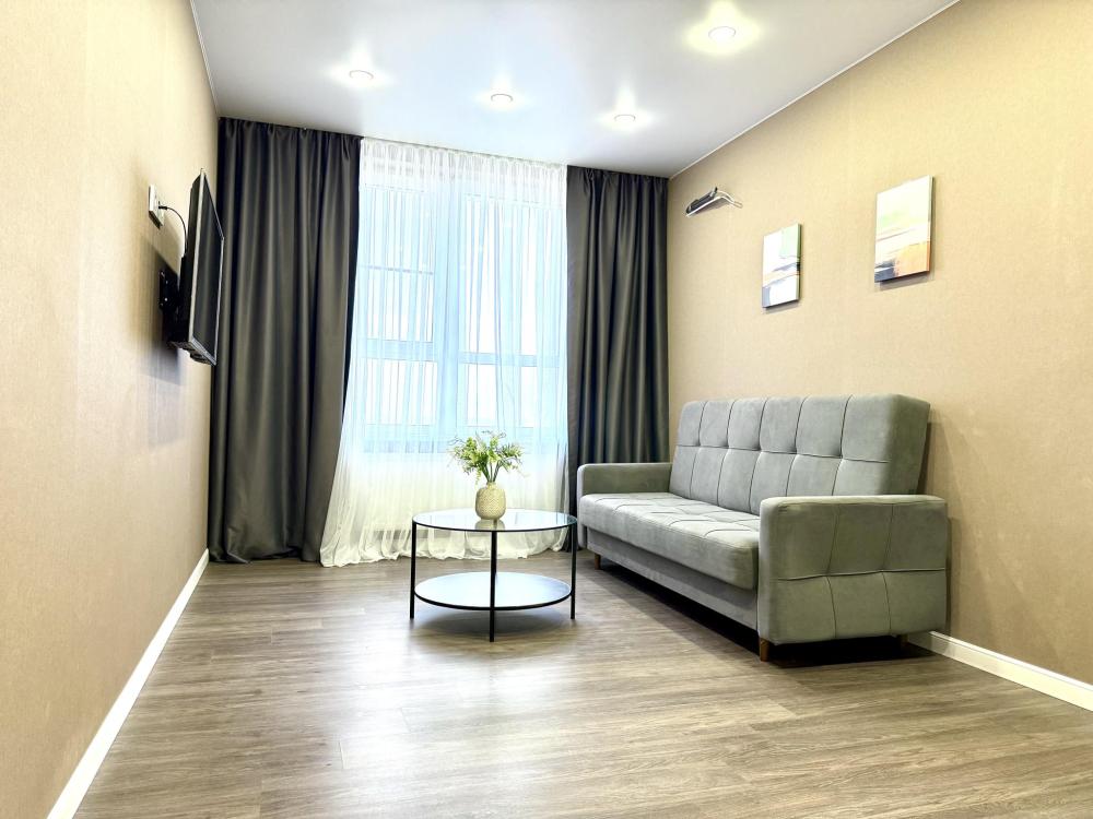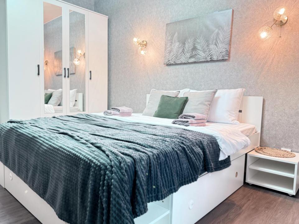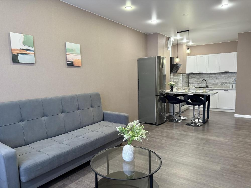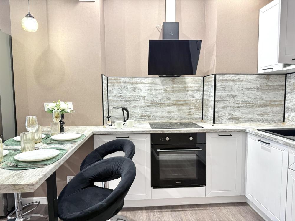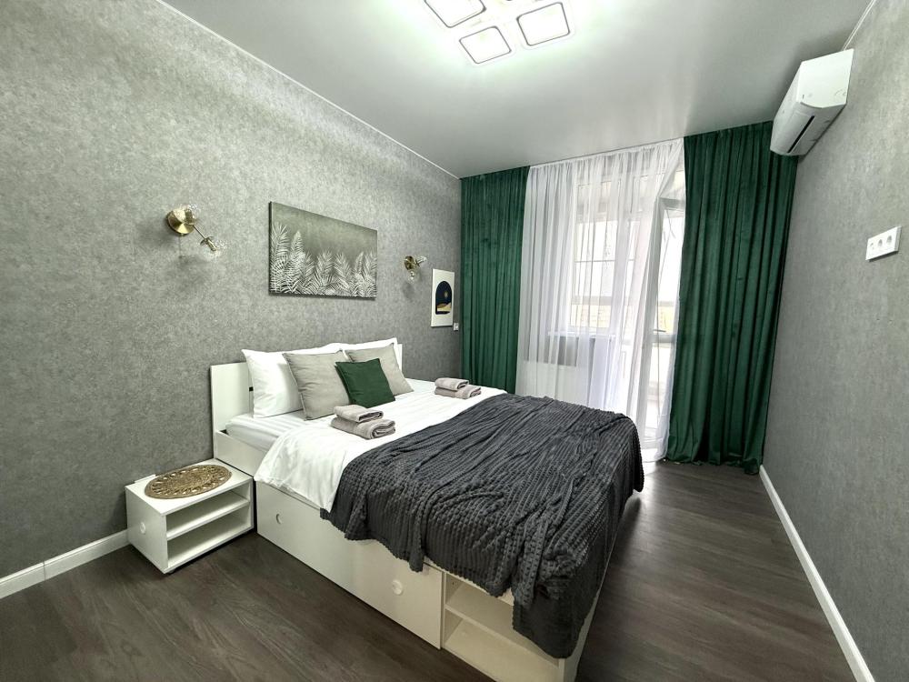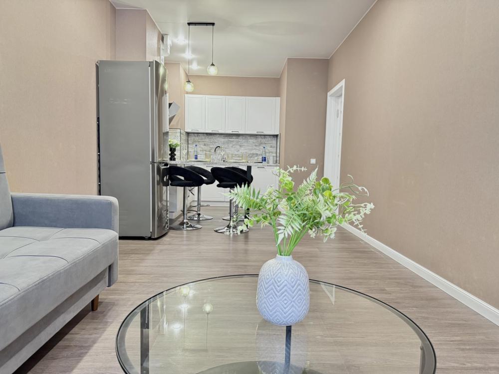 Полностью оборудованная квартира для комфортного проживания: двуспальная кровать и диван (4 спальных места), современная бытовая техника (телевизор, холодильник, плита, духовка, микроволновка), стиральная машина и утюг, кондиционер, полный комплект посуды, чайник, постельное белье и полотенца, комплекты личной гигиены (зубные щетки, паста, ватные диски), шампунь, гель для душа, бальзам, чай, кофе, сахар