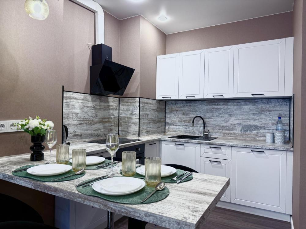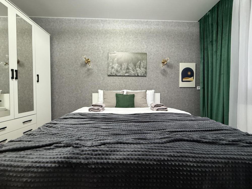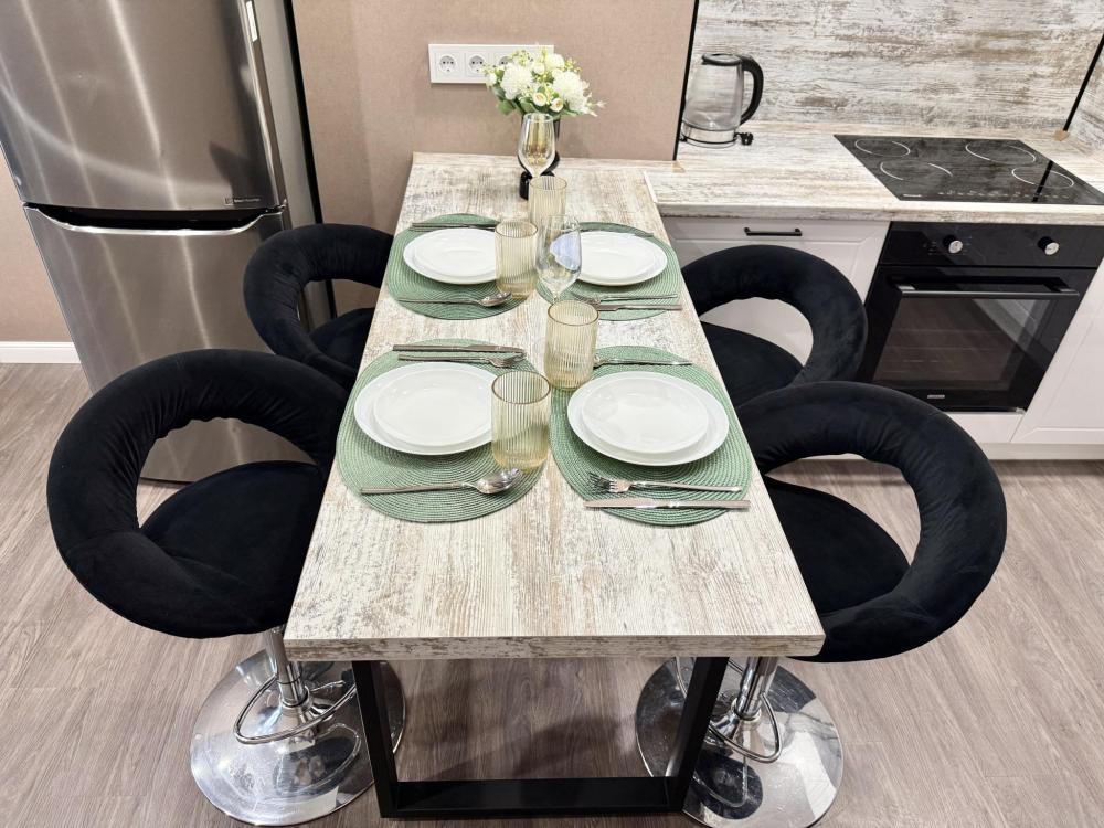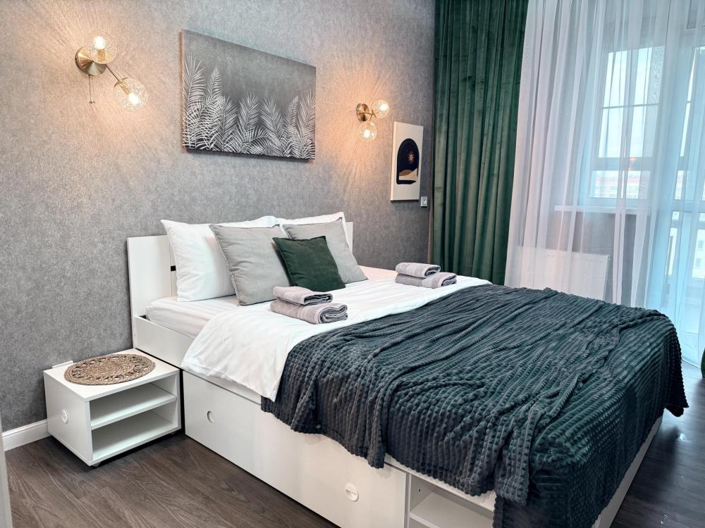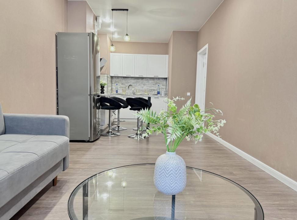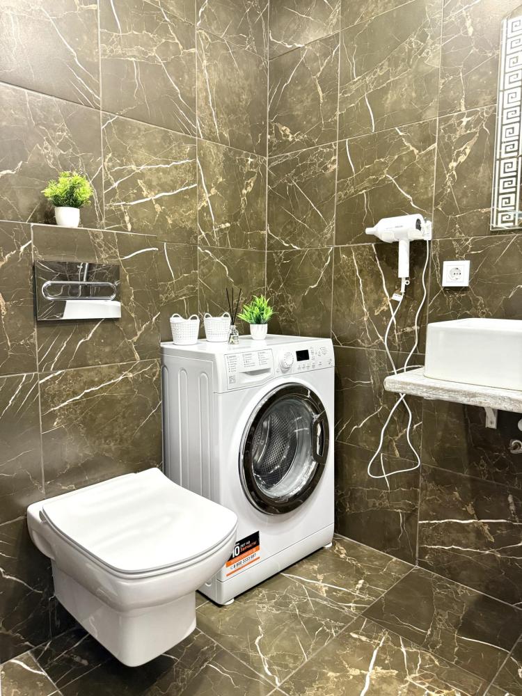 Полностью оборудованная квартира для комфортного проживания: двуспальная кровать и диван (4 спальных места), современная бытовая техника (телевизор, холодильник, плита, духовка, микроволновка), стиральная машина и утюг, кондиционер, полный комплект посуды, чайник, постельное белье и полотенца, комплекты личной гигиены (зубные щетки, паста, ватные диски), шампунь, гель для душа, бальзам, чай, кофе, сахар