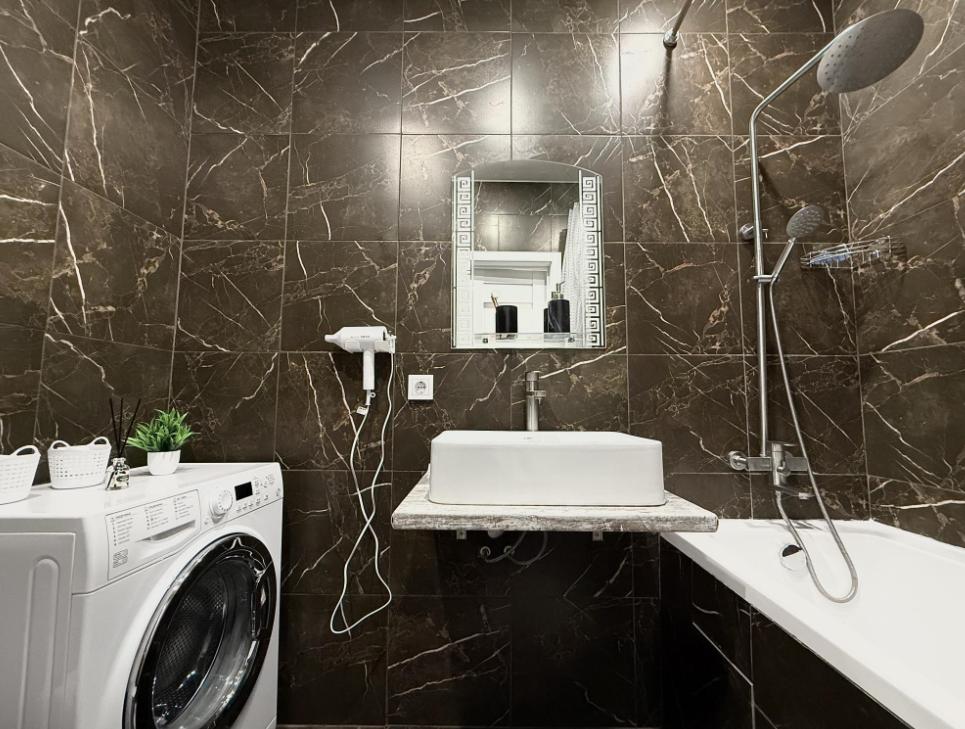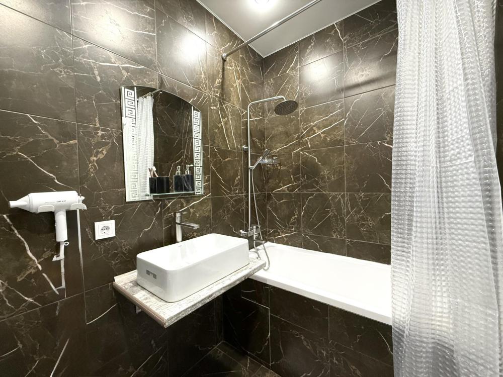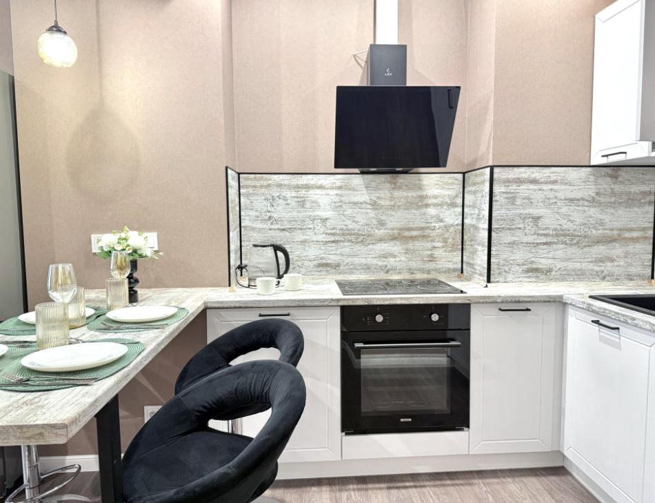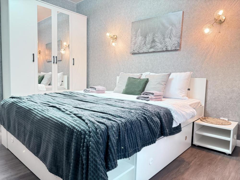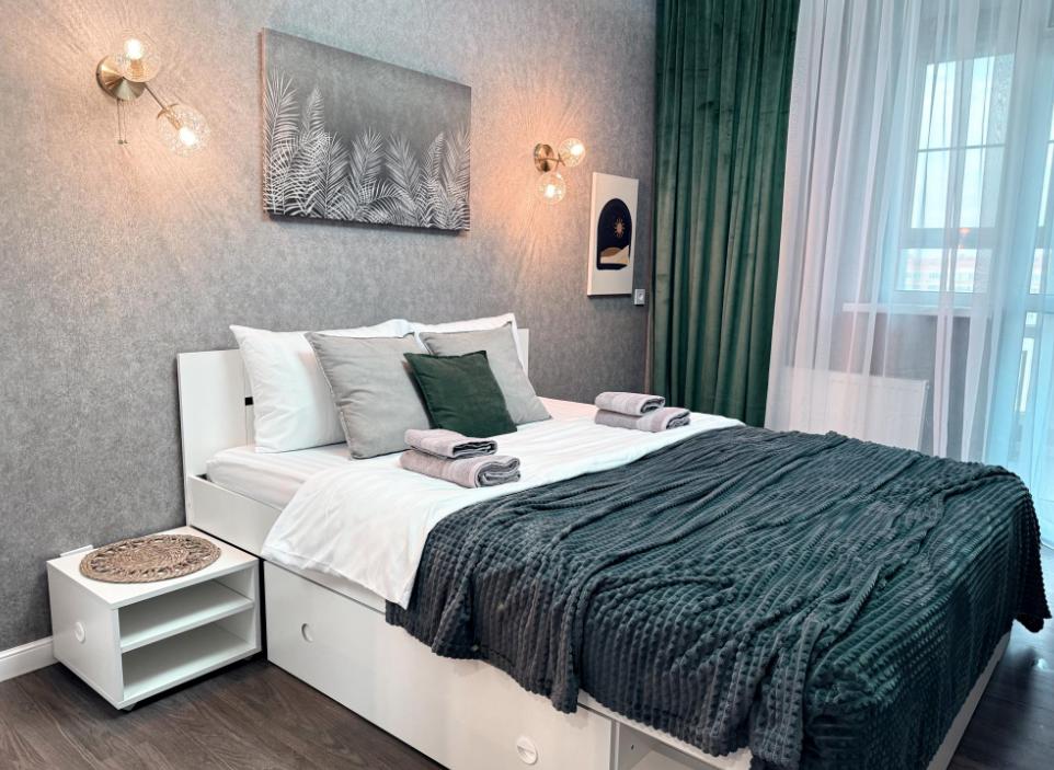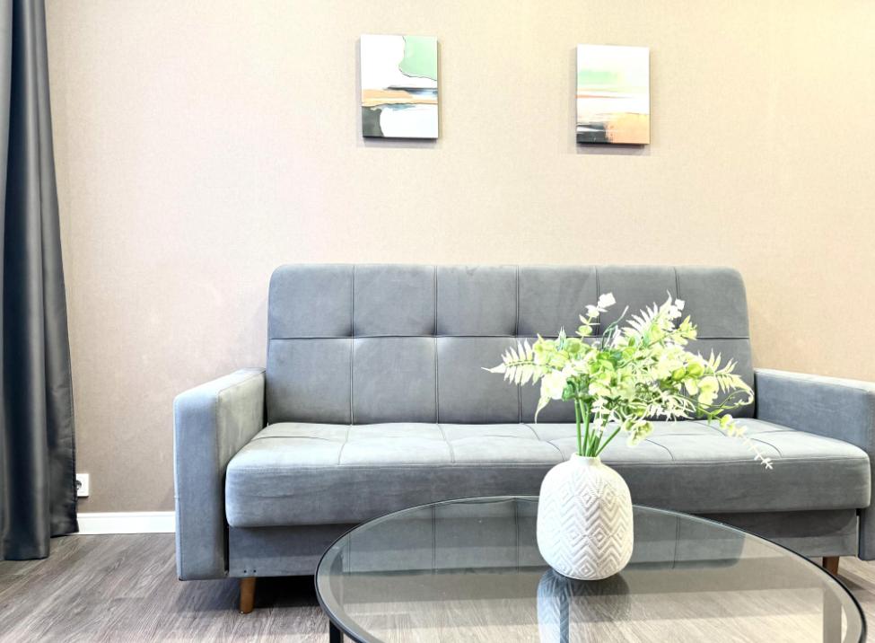 Полностью оборудованная квартира для комфортного проживания: двуспальная кровать и диван (4 спальных места), современная бытовая техника (телевизор, холодильник, плита, духовка, микроволновка), стиральная машина и утюг, кондиционер, полный комплект посуды, чайник, постельное белье и полотенца, комплекты личной гигиены (зубные щетки, паста, ватные диски), шампунь, гель для душа, бальзам, чай, кофе, сахар