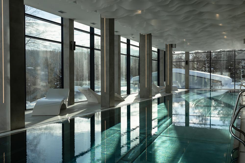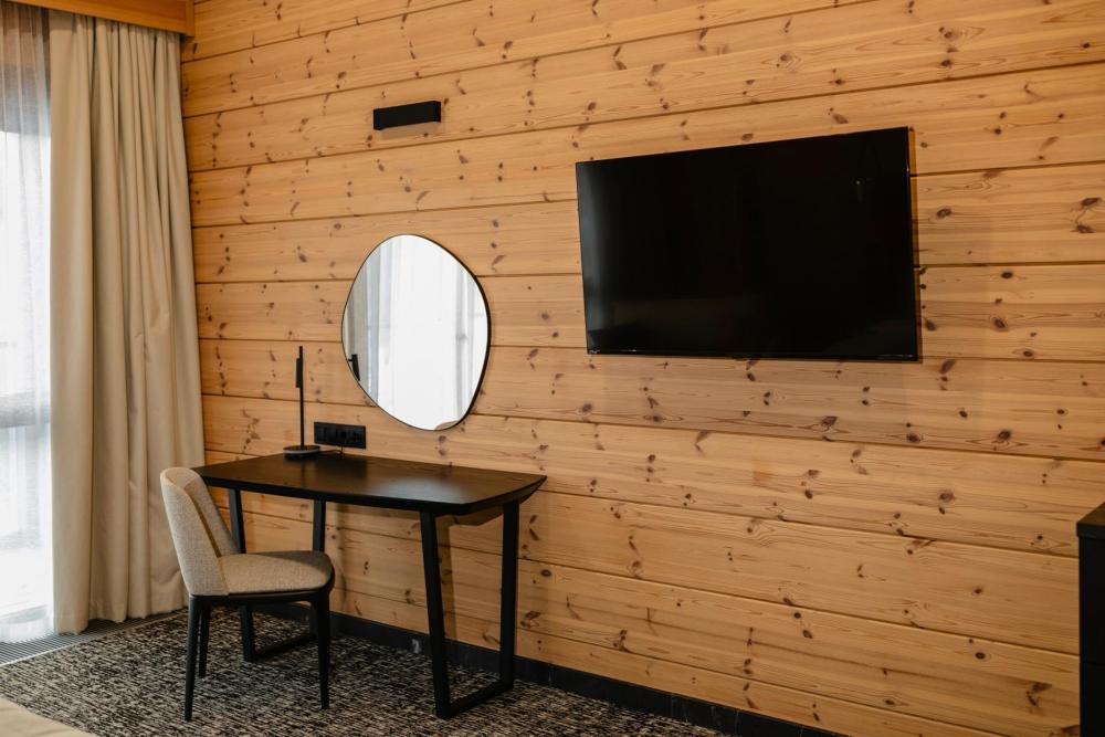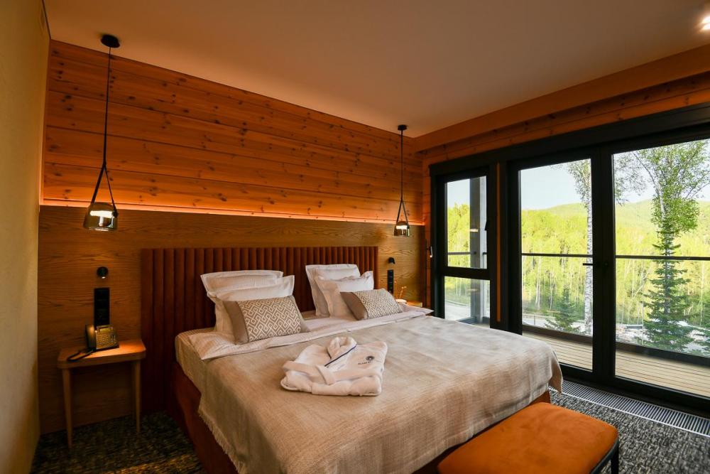 Номера категории «Полулюкс панорамный» в курорте «Алтай Рестарт» созданы для максимального комфорта и полноценного отдыха в атмосфере уюта и уединения. Просторный номер идеально подойдёт для друзей, коллег или гостей, предпочитающих раздельные спальные места без компромиссов в уровне сервиса. Интерьер выполнен в современной природной стилистике с использованием натуральных материалов и спокойных оттенков, способствующих расслаблению и восстановлению. Панорамные окна открывают живописные виды Алтая, наполняя пространство светом и ощущением свободы. В номере: двуспальная кровать с премиальным текстилем, увеличенная площадь и зонирование пространства, зона отдыха с мягкой мебелью, панорамные окна с видом на природу, современная ванная комната с расширенным набором косметики, Wi-Fi, телевизор, климат-контроль, сейф. Данная категория — это сочетание пространства, приватности и высокого уровня комфорта, позволяющее насладиться отдыхом в окружении силы и тишины Алтая.