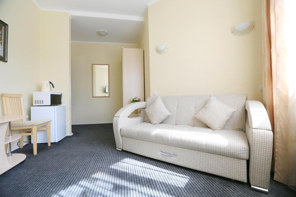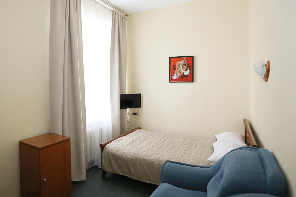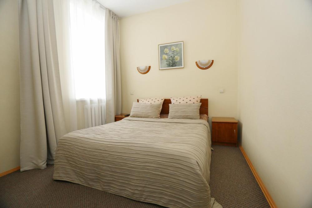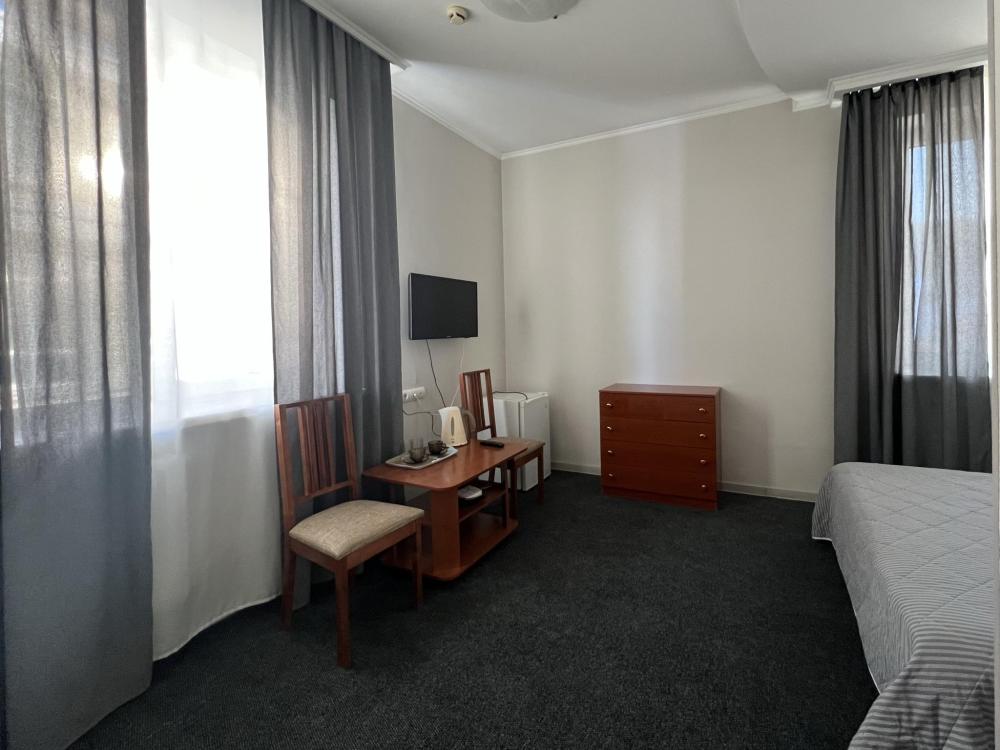 Однокомнатные номера с 1,5-спальной кроватью, прекрасно сочетающих современные гостиничные тенденции и домашний уют. В номерах все необходимое: телевизор (более 30 каналов различного жанра), холодильник, чайник, прикроватная тумба, журнальный столик, шкаф для одежды. Имеется отдельная ванная комната с феном, индивидуальными косметическими и банными принадлежностями.
