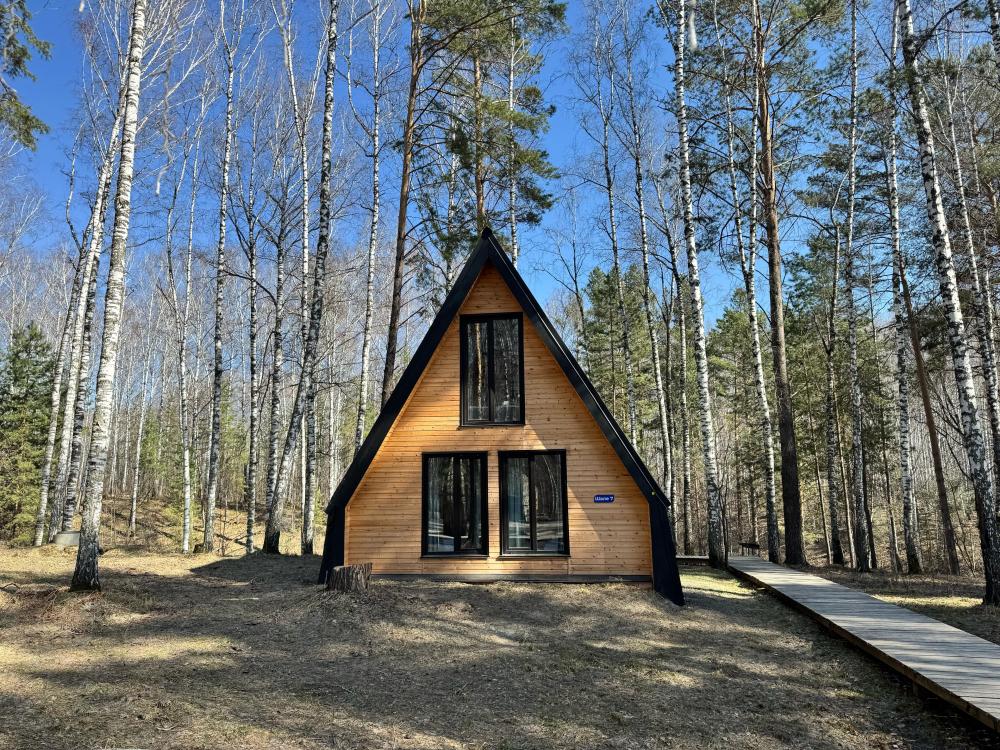 2х-этажный дом с панорамными окнами, 3 спальни и кухня-гостиная. В кухне-гостиной обеденная зона, шкаф, раскладной диван, телевизор, холодильник, чайник, кухонные принадлежности, варочная панель, микроволновая печь, раковина, кондиционер. Санузел с душевой кабиной и всеми необходимыми принадлежностями (фен, зубной набор, гель для душа, шампунь, халаты, тапочки). В спальнях двуспальные кровати и полки для хранения вещей. Большая терраса с мебелью и видом на лес. Отдельная зона барбекю. Вместимость до 8 человек .