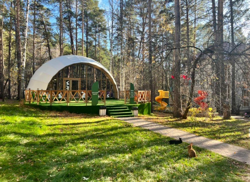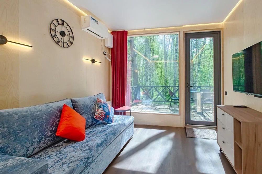 Полусферический дом с панорамной стеклянной стеной и выходом на собственную террасу. В зоне спальни двуспальная кровать, телевизор. В гостиной раскладной диван и кресло-кровать, отдельная кухонная зона, чайник, микроволновая печь, набор посуды, кондиционер. Санузел с душевой кабиной и всеми необходимыми принадлежностями (фен, зубной набор, гель для душа, шампунь, халаты, тапочки). Отдельная зона барбекю.