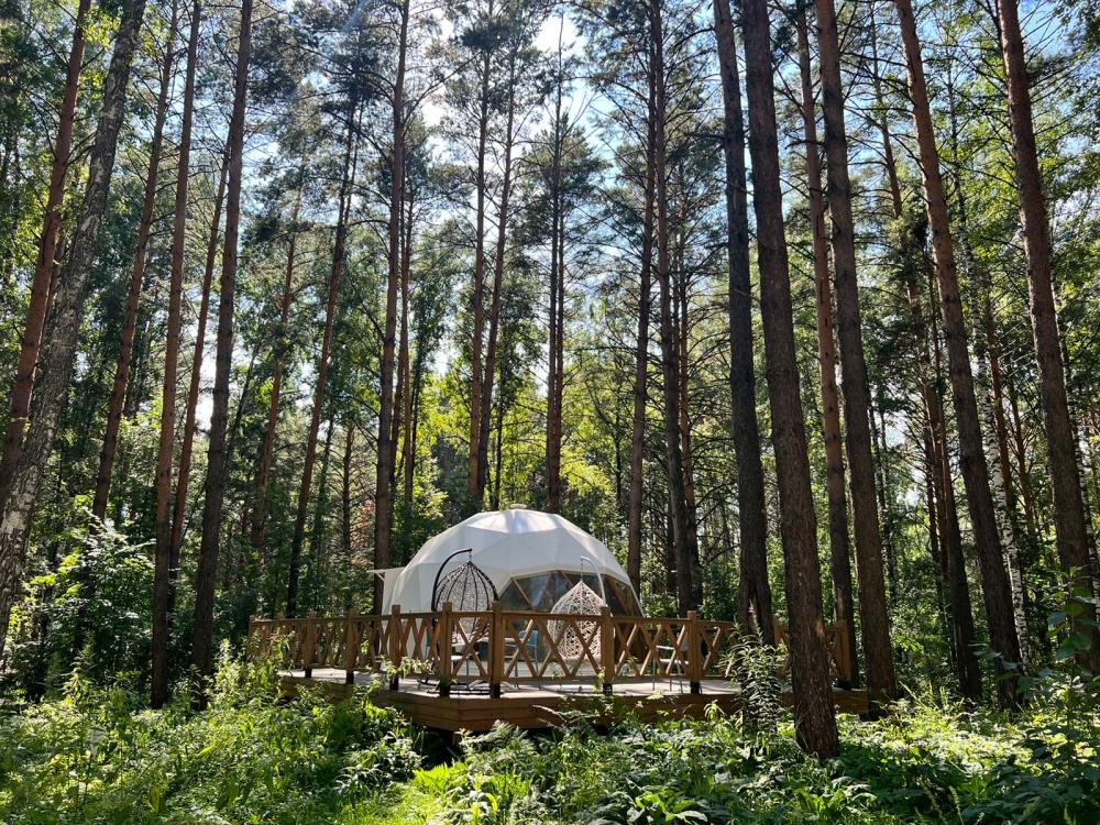 Купольный дом с панорамными окнами. Двуспальная кровать на первом этаже, 2 спальных места на втором полуэтаже, телевизор. Кухонная зона: чайник, микроволновая печь или варочная панель, набор посуды, мини-холодильник. Кондиционер, санузел с душевой кабиной и всеми необходимыми принадлежностями (фен, зубной набор, гель для душа, шампунь, халаты, тапочки). Собственная терраса с мебелью и мангальной зоной.