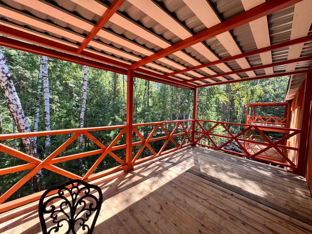 Однокомнатный номер с двуспальной кроватью, холодильник, санузел с душевой кабиной и всеми необходимыми принадлежностями (фен, зубной набор, гель для душа, шампунь, тапочки), чайник, набор посуды, просторный балкон с видом на лес.