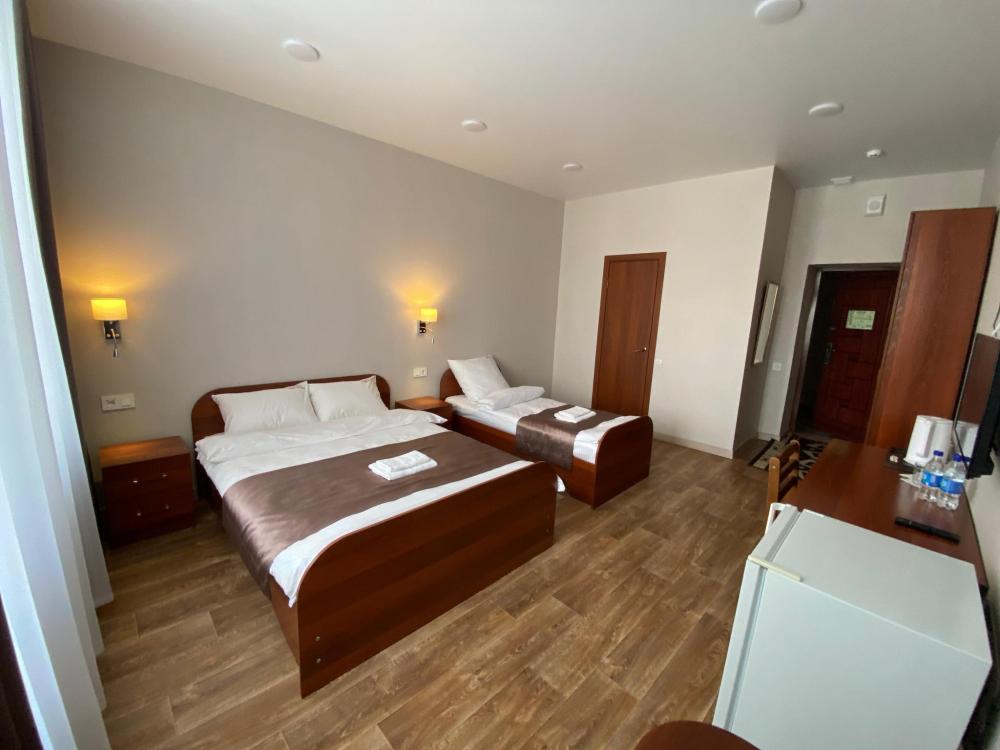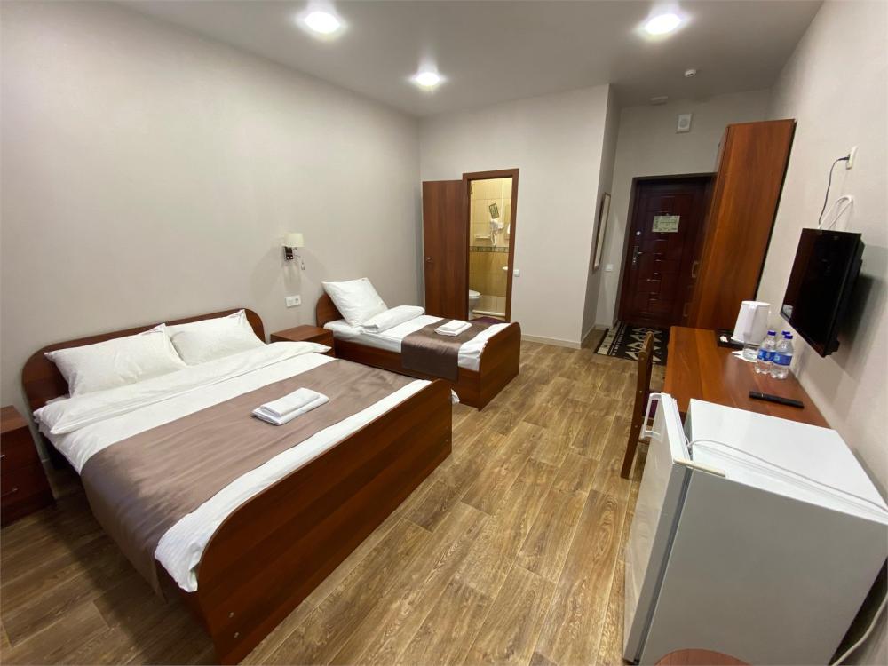 Семейный номер «Стандарт». В номере : просторная двуспальная кровать, односпальная кровать кровать, полноценная ванная комната с душем, всё необходимое для комфортного совместного отдыха.