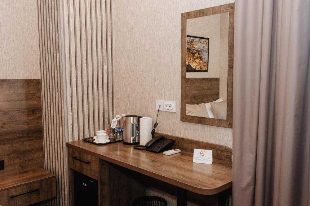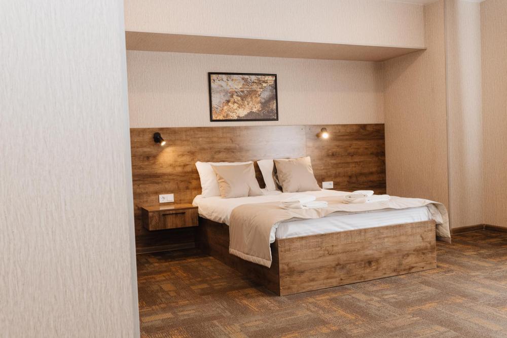 Стандартный номер с двуспальной кроватью. Кровать оснащена ортопедическим матрасом, шторы black-out из светонепроницаемого материала создадут в номере уютный полумрак. Сигнал Wi-Fi достаточно мощный для загрузки программ или просмотра фильмов онлайн на плазменном 42 дюймовом телевизоре. Централизованная система кондиционирования отеля поддерживает комфортную температуру в номерах круглый год.