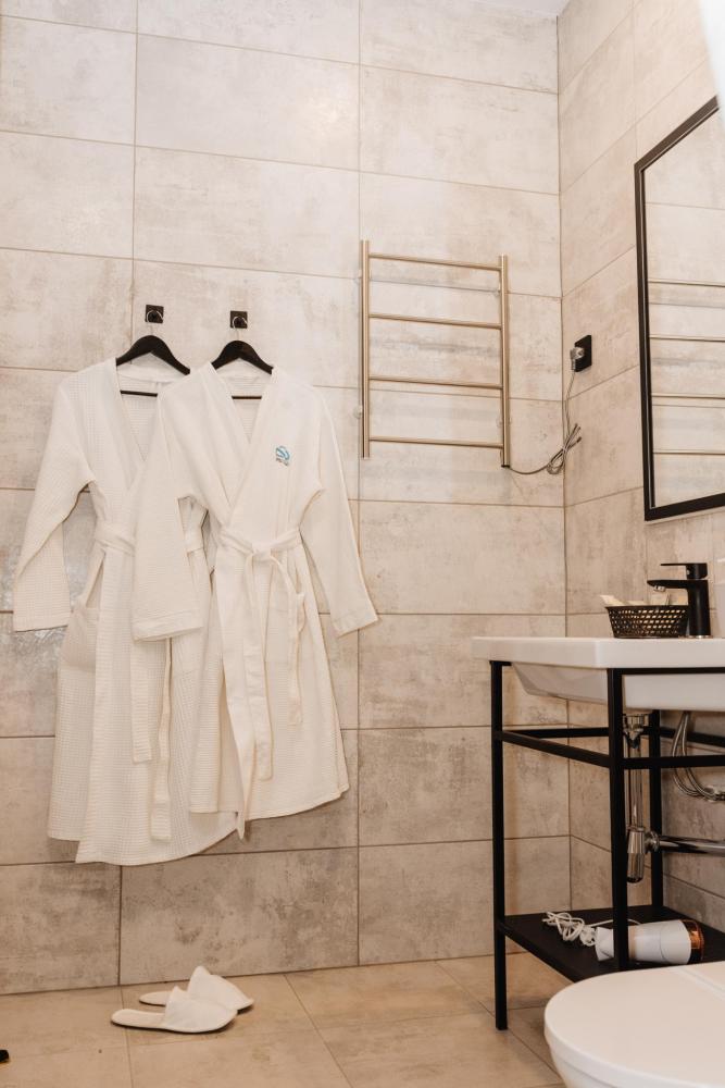Просторный, светлый номера (35 кв.м) с высокими потолками, большим плазменным телевизором 55 дюймов. В номере одна двуспальная кровать (кресло кровать, журнальный столик). В гостиной выделена кухонная зона со всей необходимой встроенной техникой и набором посуды. Высокие удобные кровати с ортопедическим матрасом и белье из шелковистого сатина обеспечат вам прекрасный сон.
