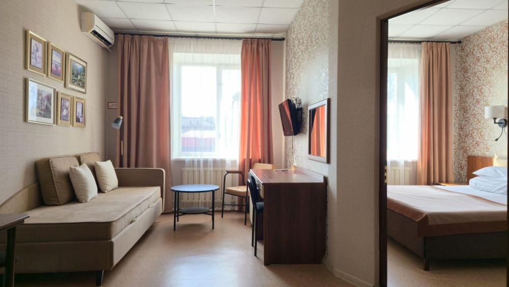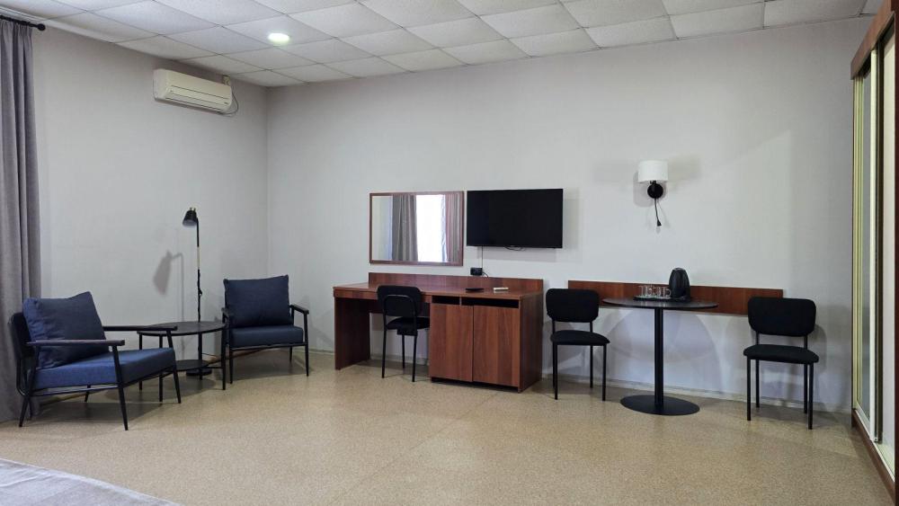 Современный уютный номер для проживания одного или двух человек или семьи с детьми; отдельная ванная комната, холодильник, телевизор, чайник, кондиционер. Проведено кабельное телевидение, установлено оборудование беспроводного доступа в Интернет (Wi-Fi).