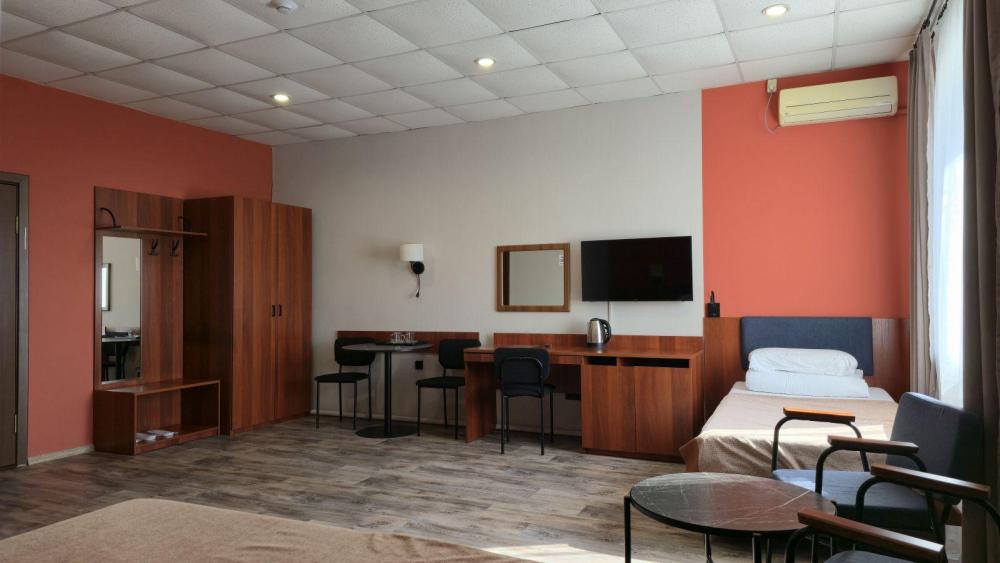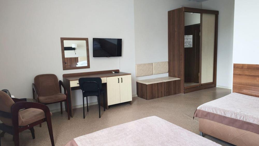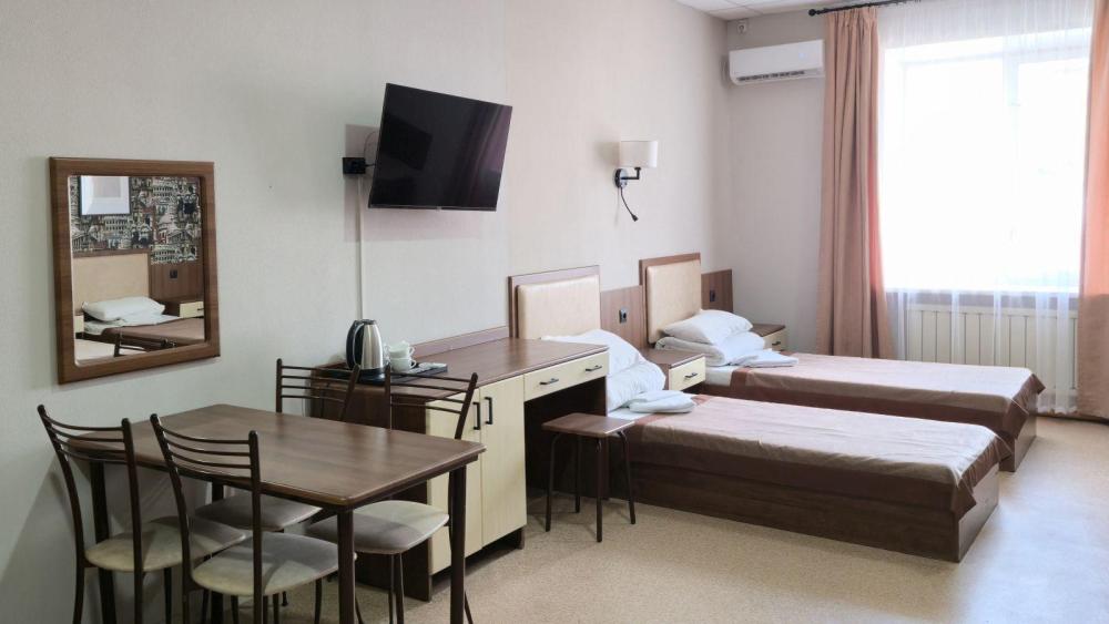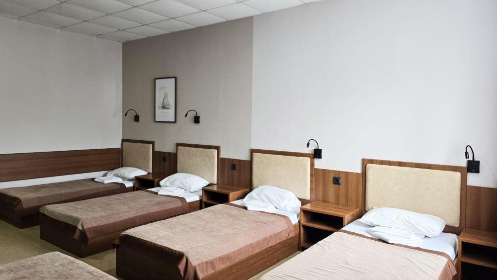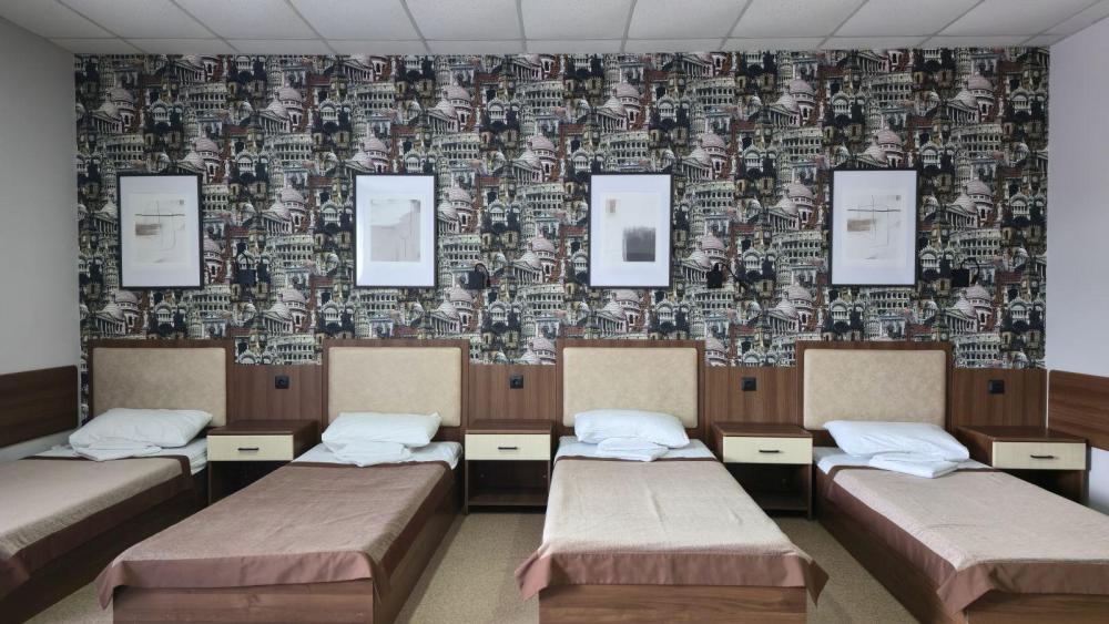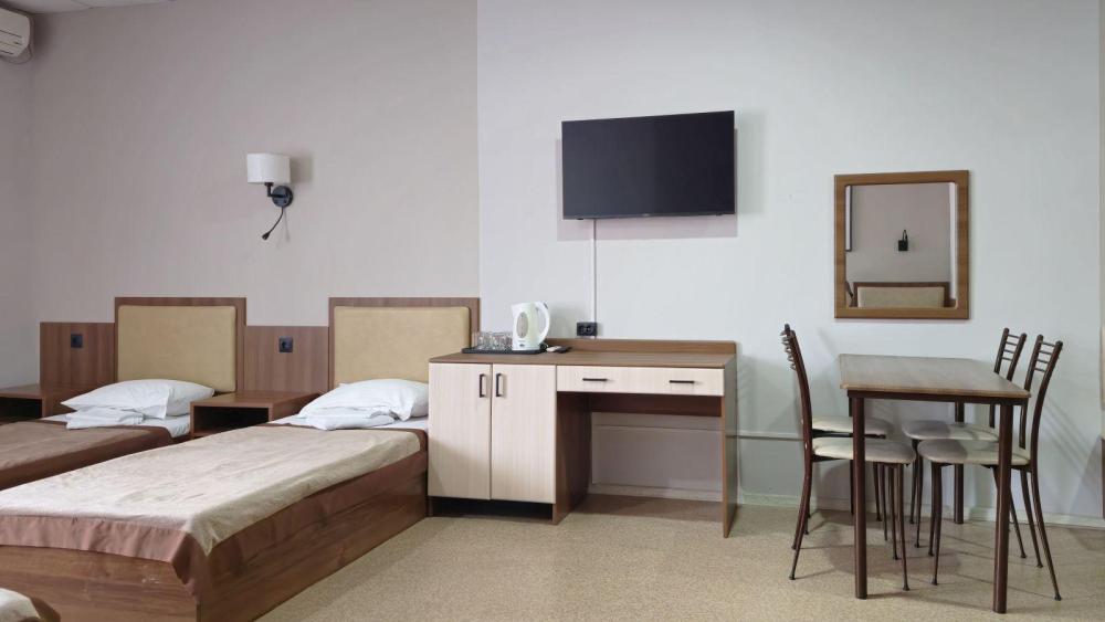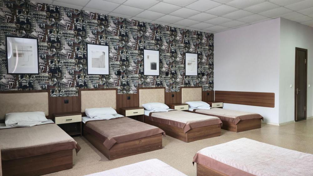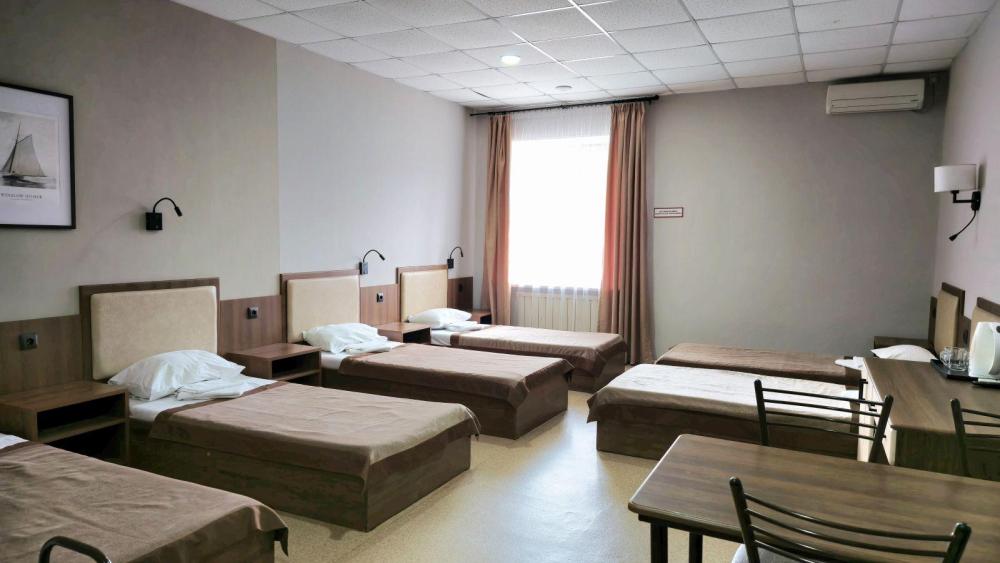 Номер с подселением. Во всех номерах есть отдельная ванная комната, телевизор, чайник, чайные наборы. В гостиницу проведено кабельное телевидение, установлено оборудование беспроводного Интернета (Wi-Fi). Обязательна ежедневная уборка во всех номерах. В номере: пять односпальных кроватей, телевизор, холодильник.