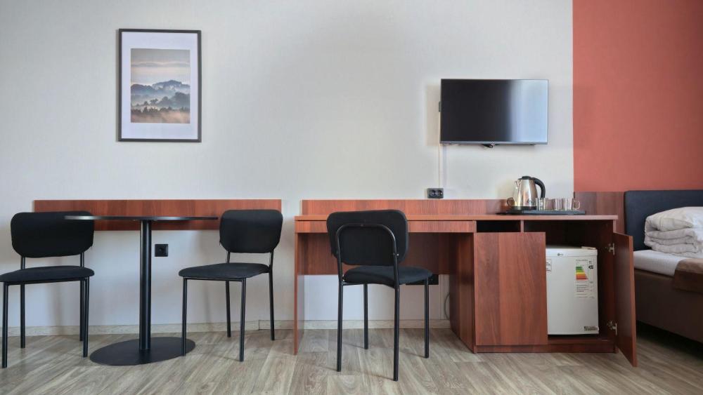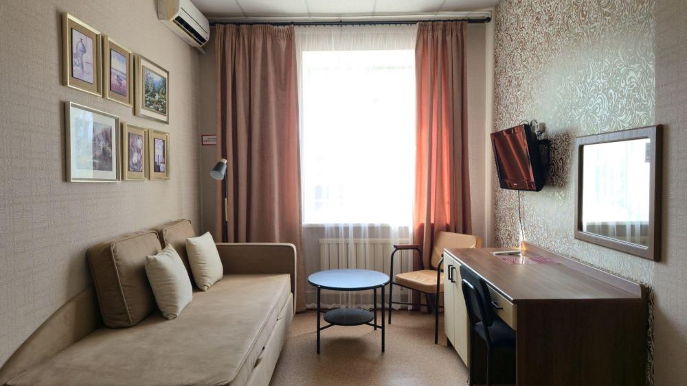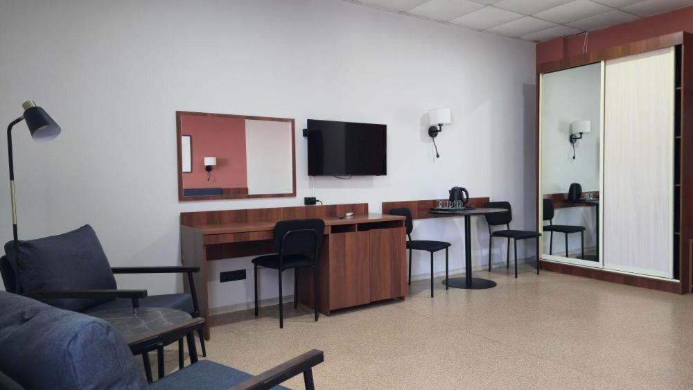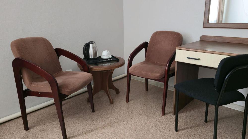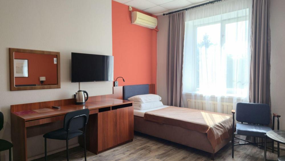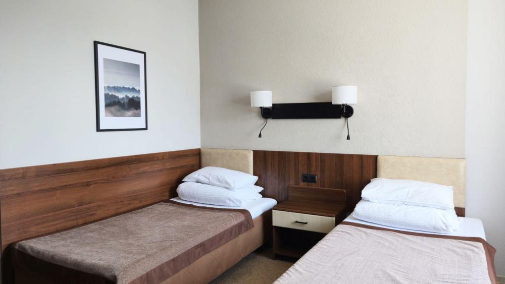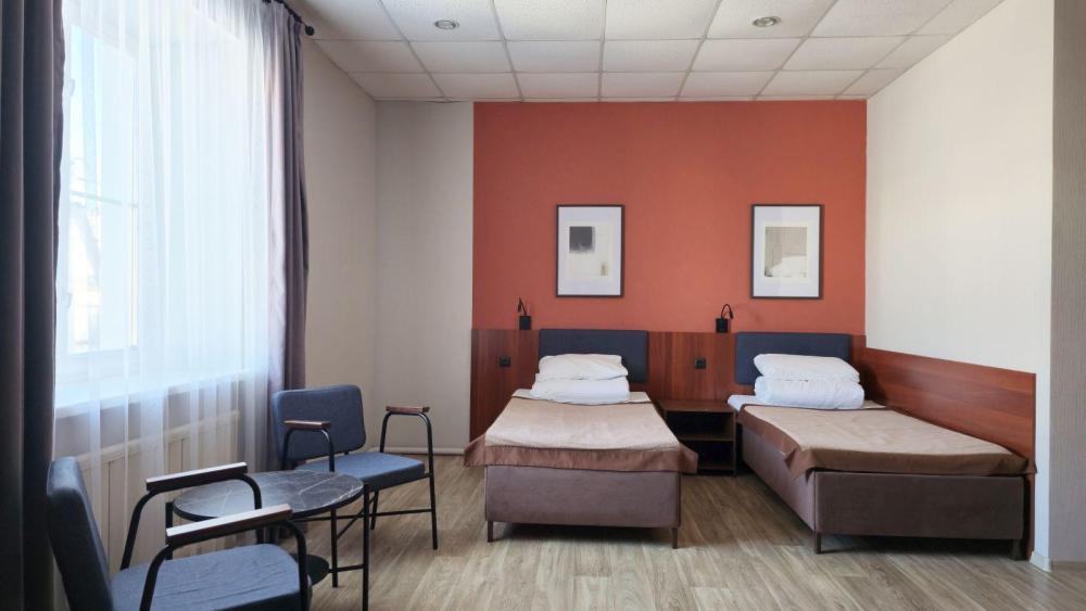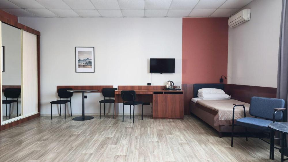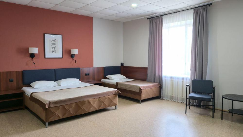 Номер с подселением. Во всех номерах есть отдельная ванная комната, телевизор, чайник, чайные наборы. В гостиницу проведено кабельное телевидение, установлено оборудование беспроводного Интернета (Wi-Fi). Обязательна ежедневная уборка во всех номерах. В номере: пять односпальных кроватей, телевизор, холодильник.