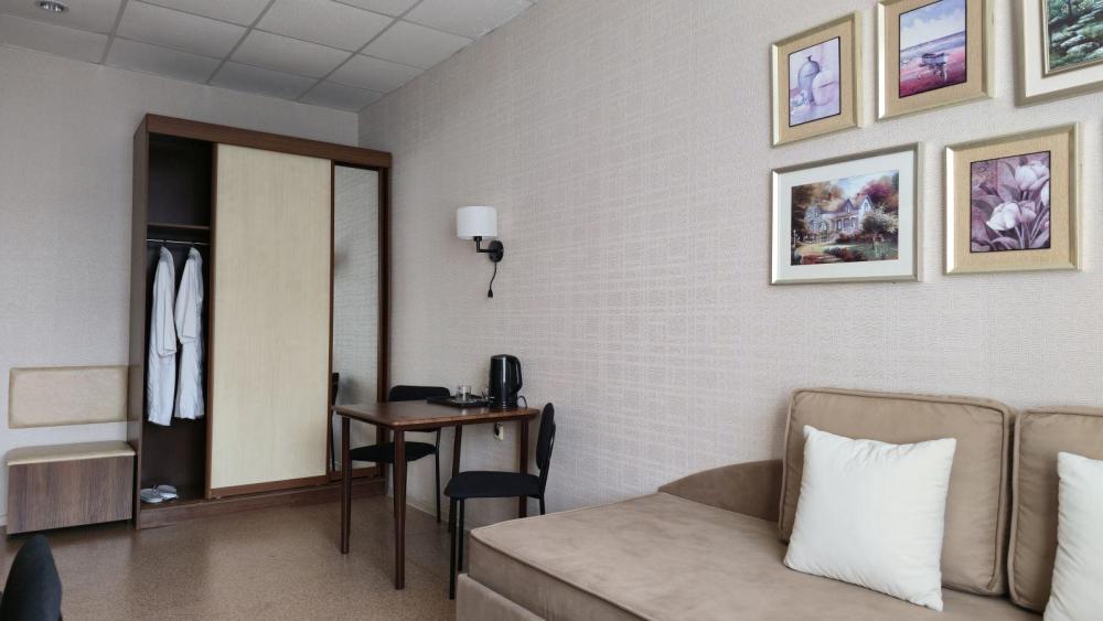 Во всех номерах есть отдельная ванная комната, телевизор, чайник, чайные наборы. В гостиницу проведено кабельное телевидение, установлено оборудование беспроводного Интернета (Wi-Fi). Обязательна ежедневная уборка во всех номерах. В номере: двуспальная кровать, телевизор, холодильник, шкаф, диван.