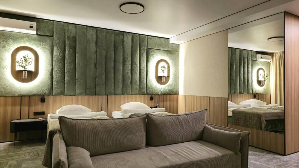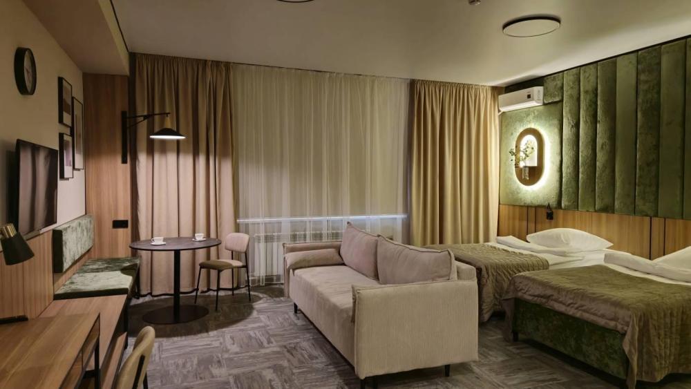 Комфортабельные номера с улучшенной планировкой и красивым интерьером с двуспальной кроватью и диваном. В номере созданы все условия для проживания. Вид на парк. Комплектация номера: Кондиционер Шкаф Электрический чайник и холодильник Телевизор с плоским экраном Телефон Рабочий стол Диван Ванная комната/туалет Гигиенические принадлежности, тапочки Ковровое покрытие Сейф Фен