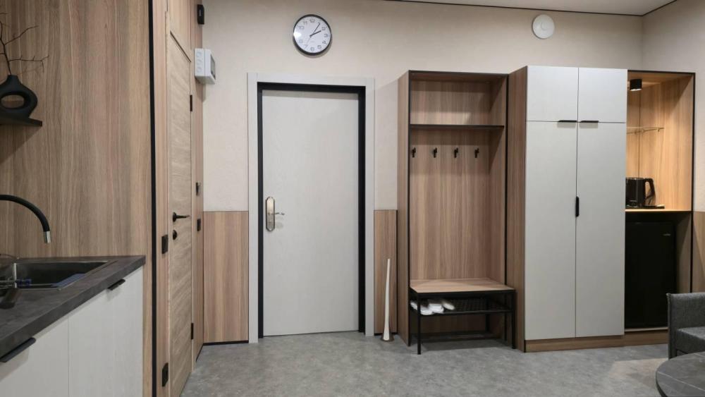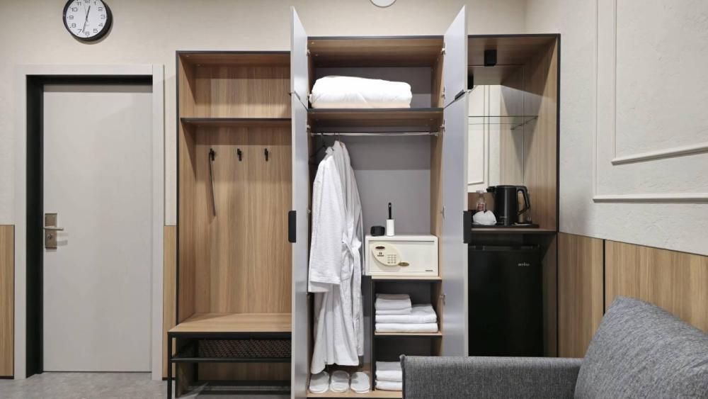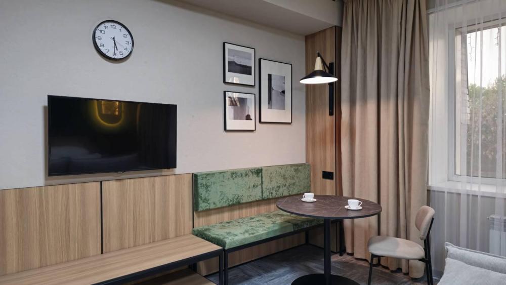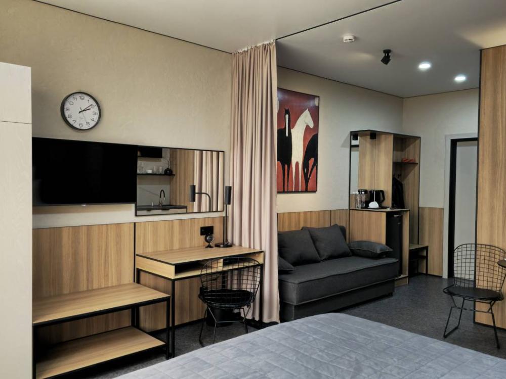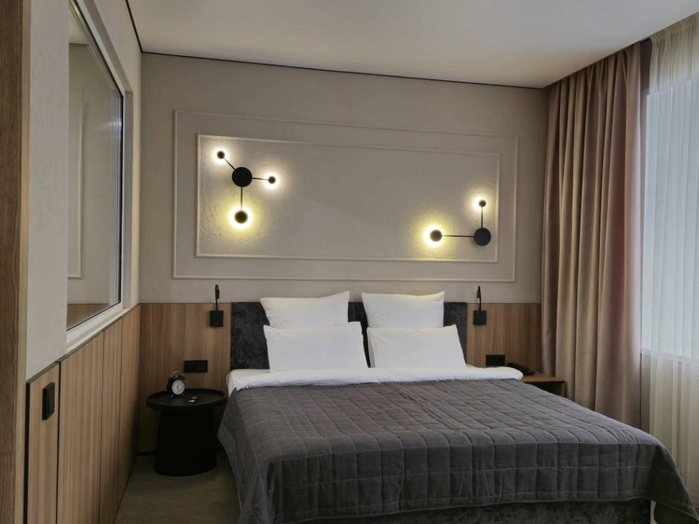 Номера с улучшенной комплектацией первой категории (комфорт) с двуспальной кроватью. Площадь номеров: 21 кв. м. Комплектация номера: Кондиционер. Диван. Телевизор с плоским экраном. Холодильник. Электрический чайник. Фен. Шкаф. Телефон. Рабочий стол. Ванная комната/туалет. Сейф. Ламинат. Тапочки. Рожок для обуви.