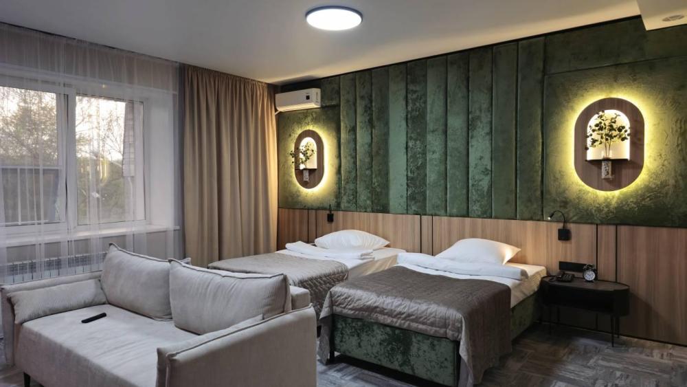 Комфортабельный номер с двумя полутороспальными кроватями. В номере созданы все условия для проживания. Вид во двор. Комплектация номера: Кондиционер Шкаф Электрический чайник и холодильник Телевизор с плоским экраном Телефон Рабочий стол Диван Ванная комната/туалет Гигиенические принадлежности, тапочки Ковровое покрытие Сейф Фен