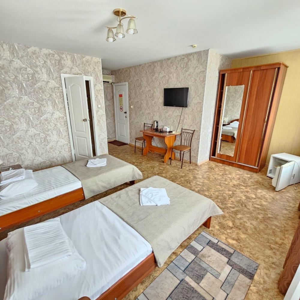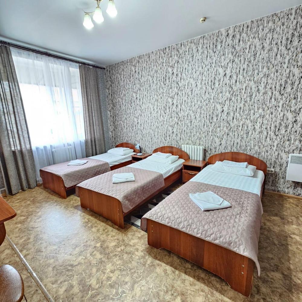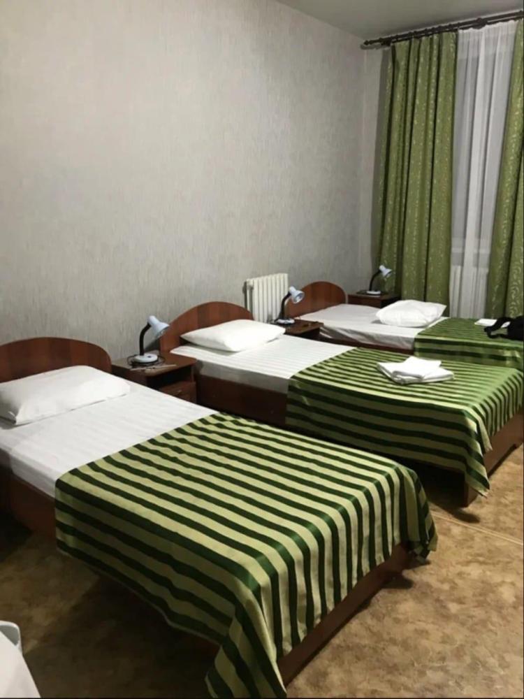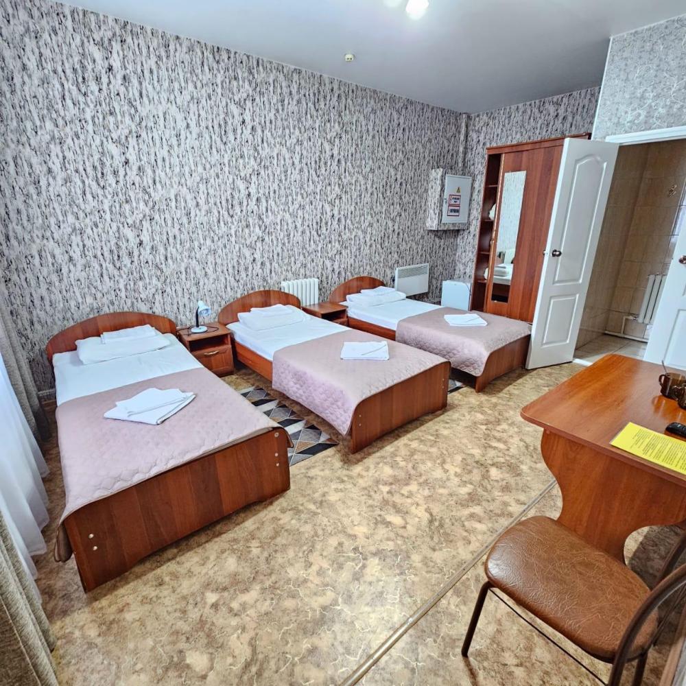 Трехместный номер с тремя односпальными кроватями, душ туалет в номере, кондиционер, чайник холодильник телевизор, кабельное телевидение. Номера расположены на первом этаже. свежее постельное белье полотенца. В душевой шампунь, гель для душа, зуб щетки. Тапочки по запросу.