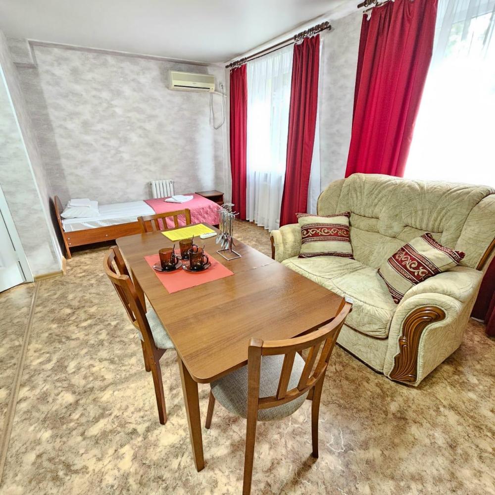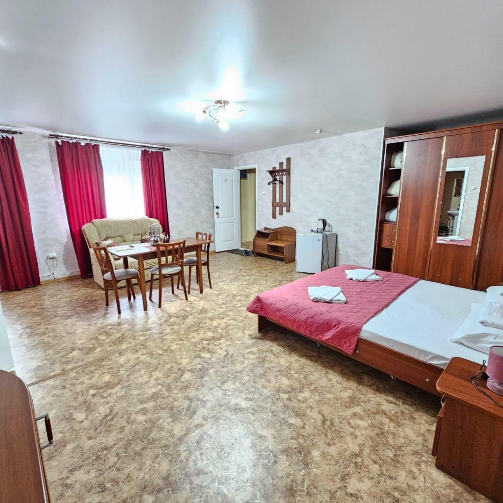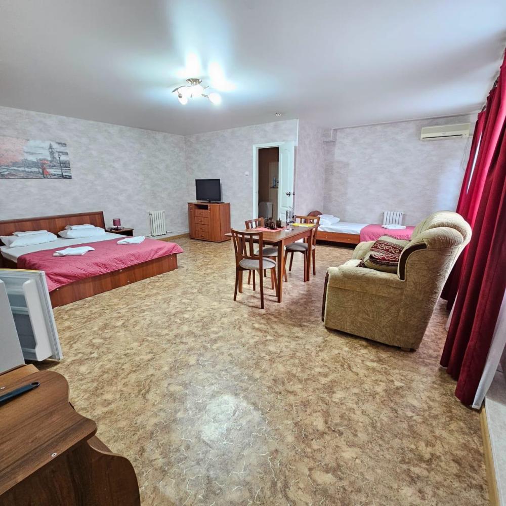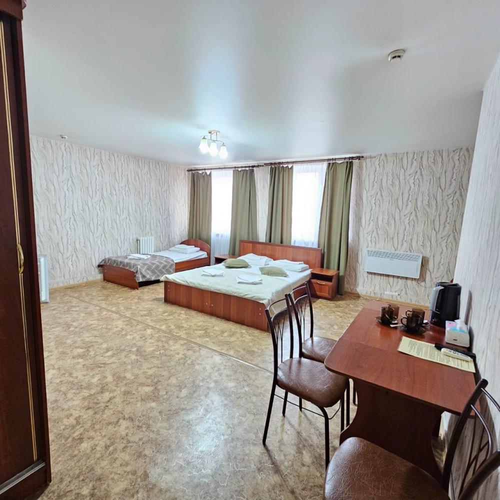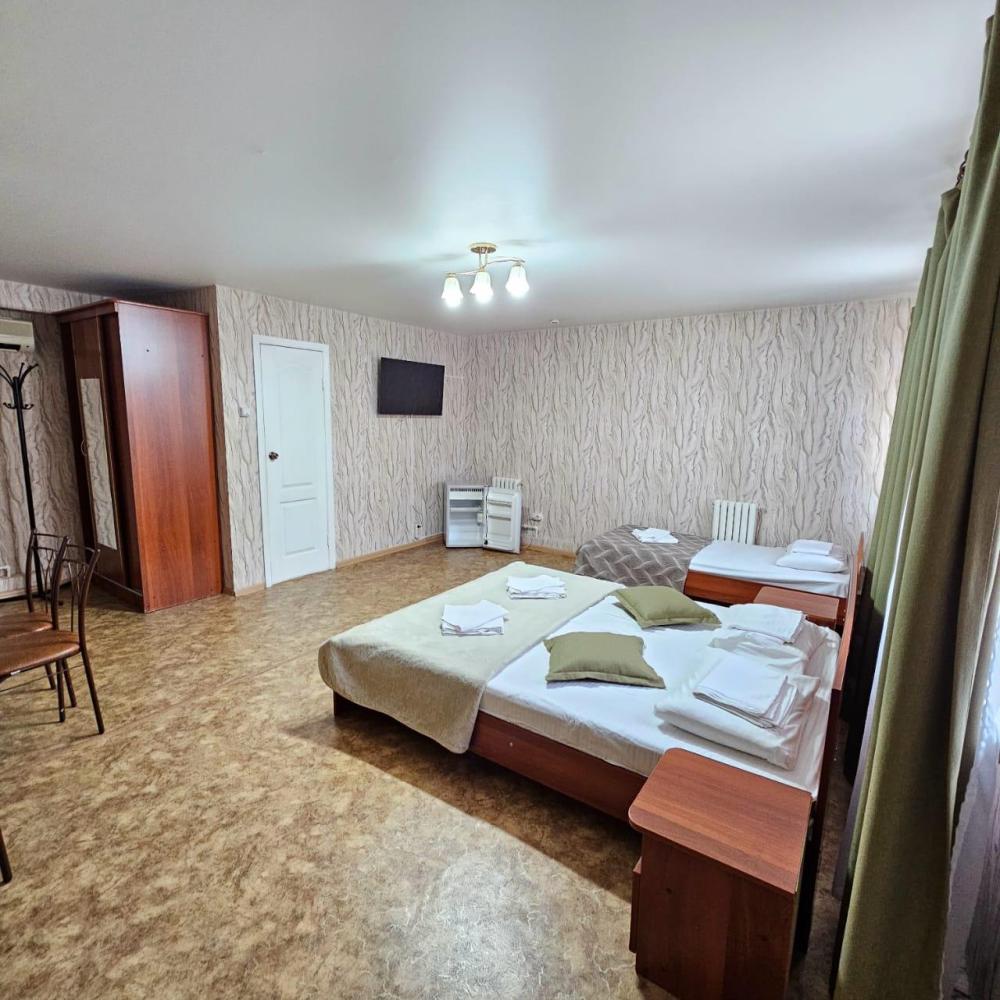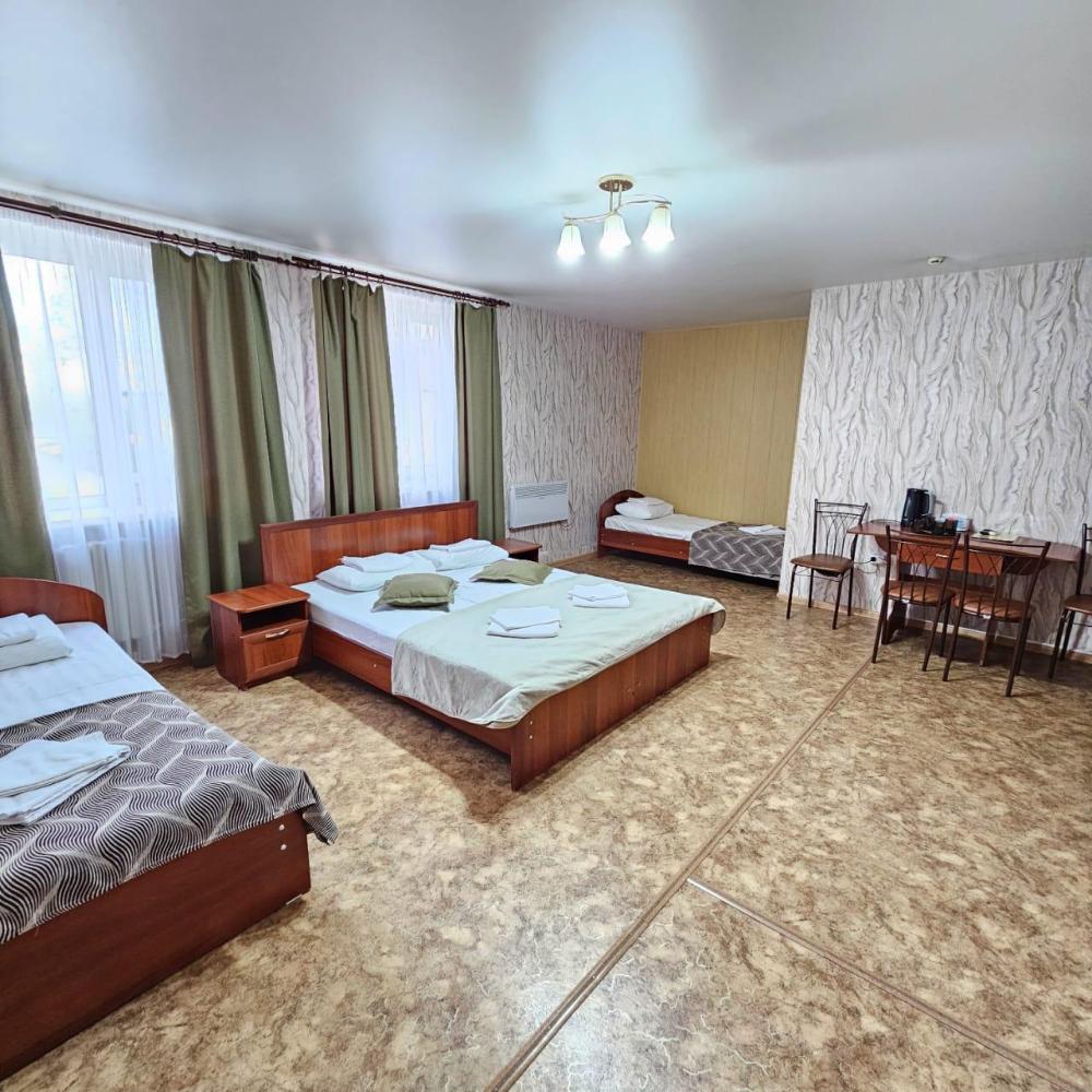 Четырехместный номер с одной двуспальной кроватью и двумя односпальными кроватями , душ туалет в номере , кондиционер, чайник холодильник телевизор, кабельное телевидение . Номер расположен на 2 этаже. свежее постельное белье полотенца. В душевой шампунь, гель для душа, зуб щетки. Тапочки по запросу.