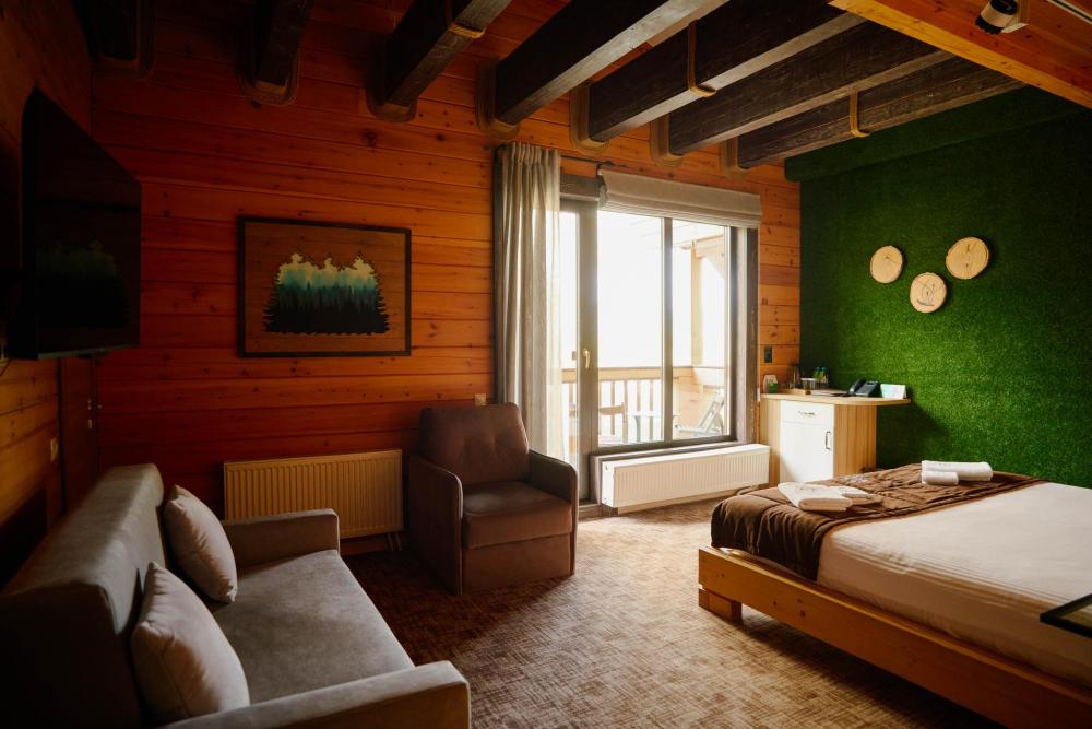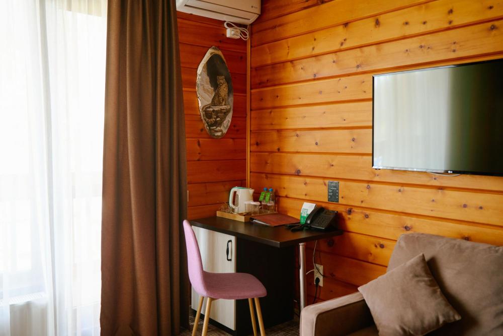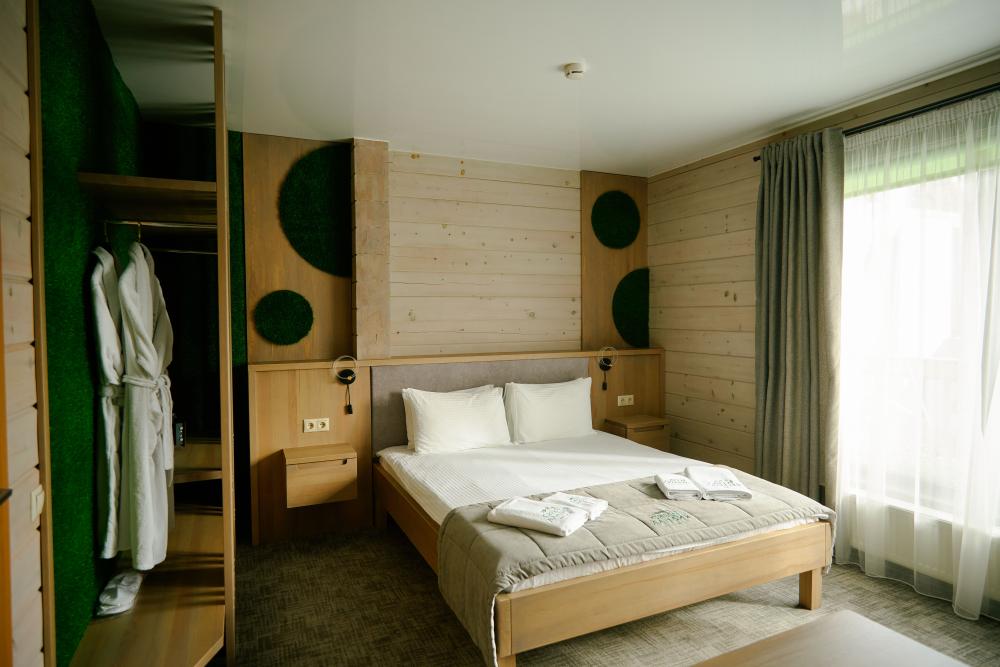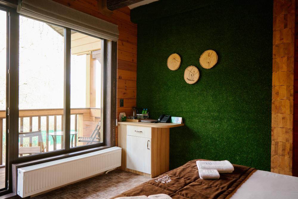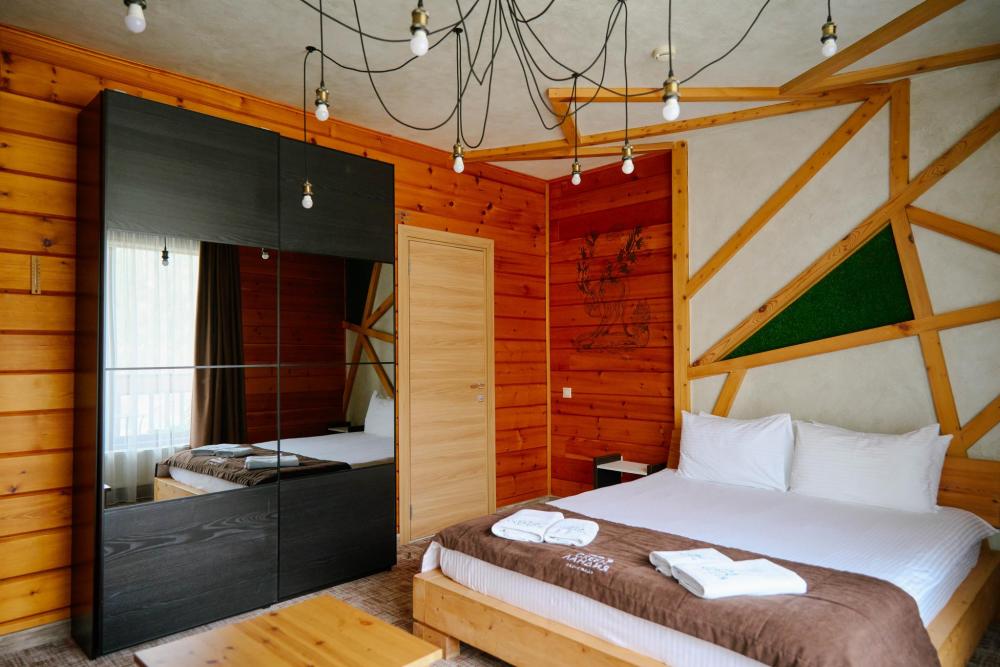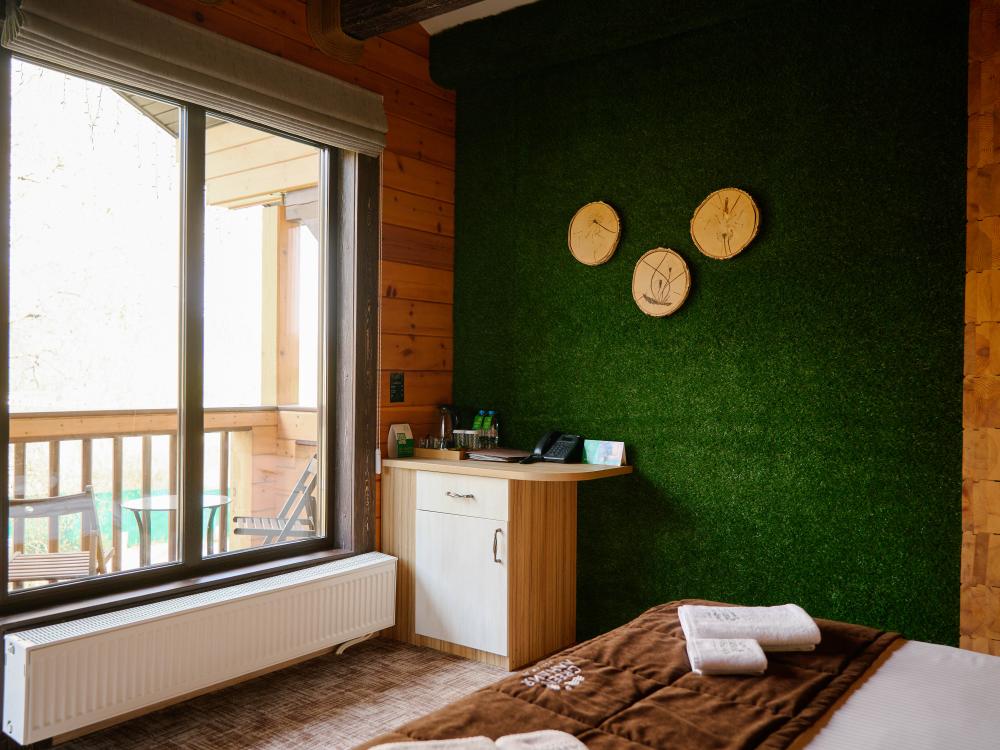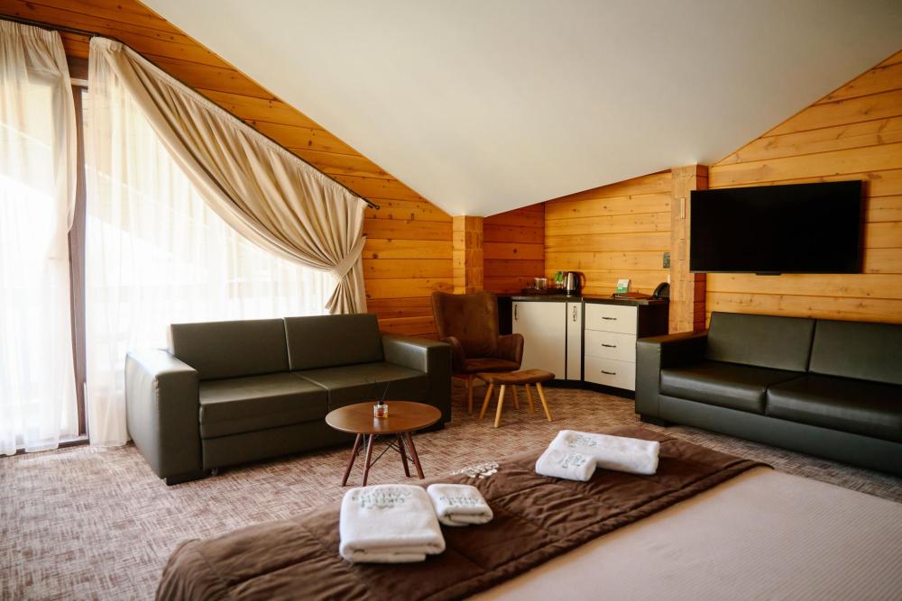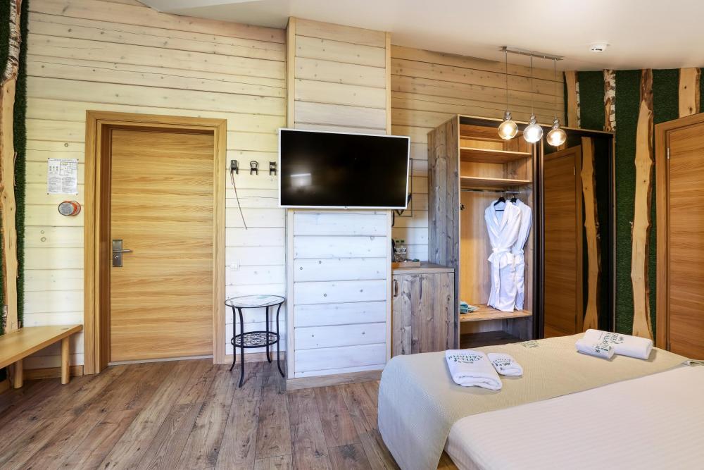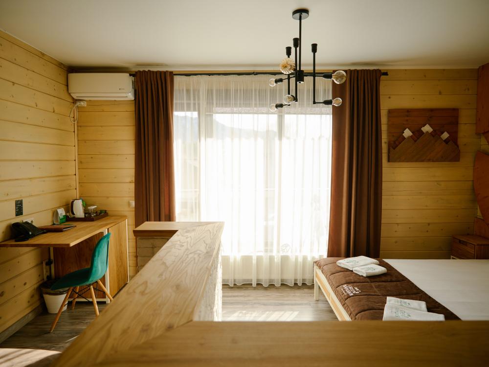 В номере: двуспальная кровать, вместительный шкаф, холодильник, чайник, телевизор. Панорамные окна с видом на лес и горы. Барная стойка для романтических ужинов. Туалетная комната оснащена всем необходимым по количеству гостей: халаты, тапочки, полотенца, наборы для душа, фен.