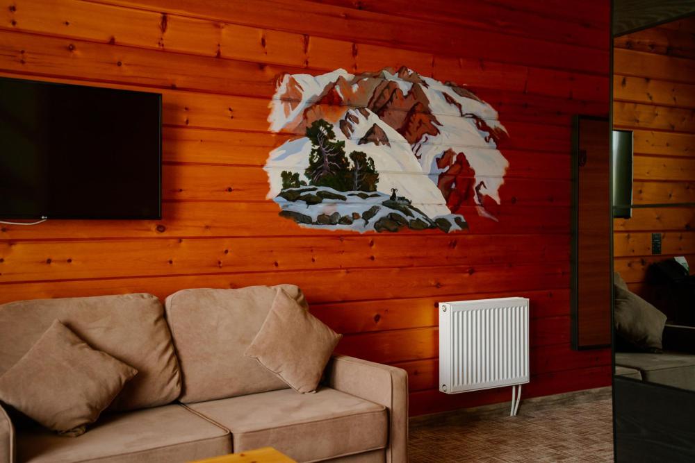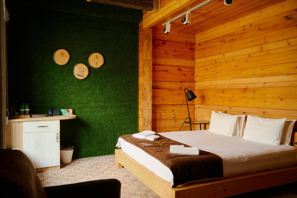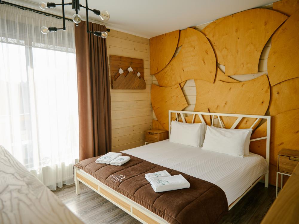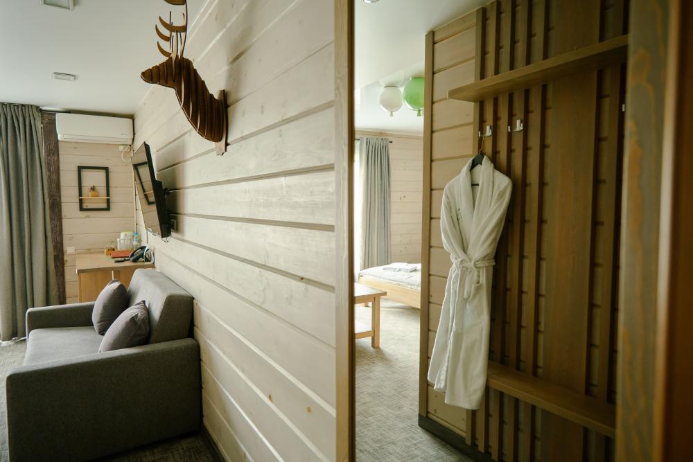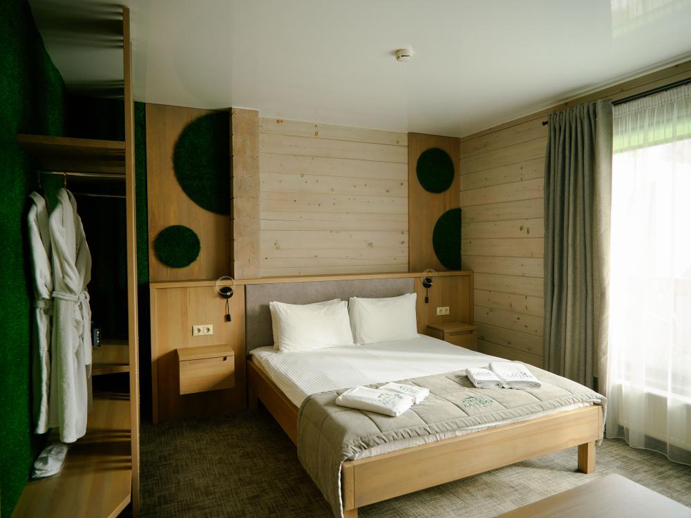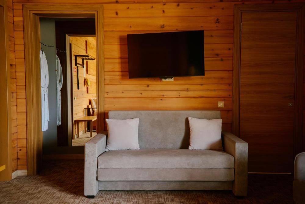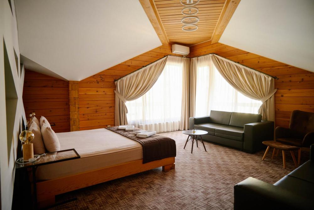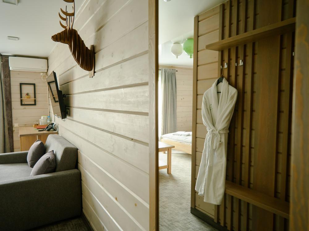 В номере: двуспальная кровать, вместительный шкаф, холодильник, чайник, телевизор. Панорамные окна с видом на лес и горы. Барная стойка для романтических ужинов. Туалетная комната оснащена всем необходимым по количеству гостей: халаты, тапочки, полотенца, наборы для душа, фен.