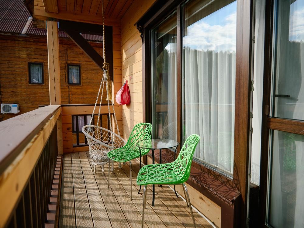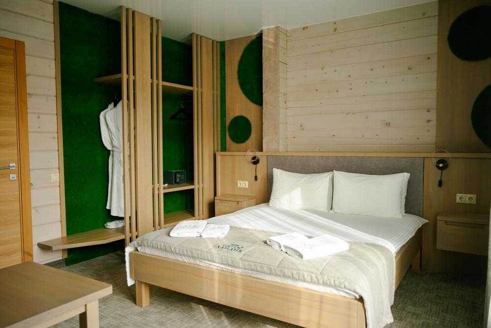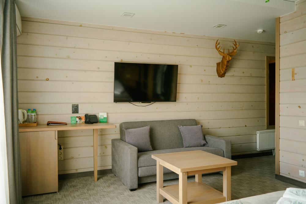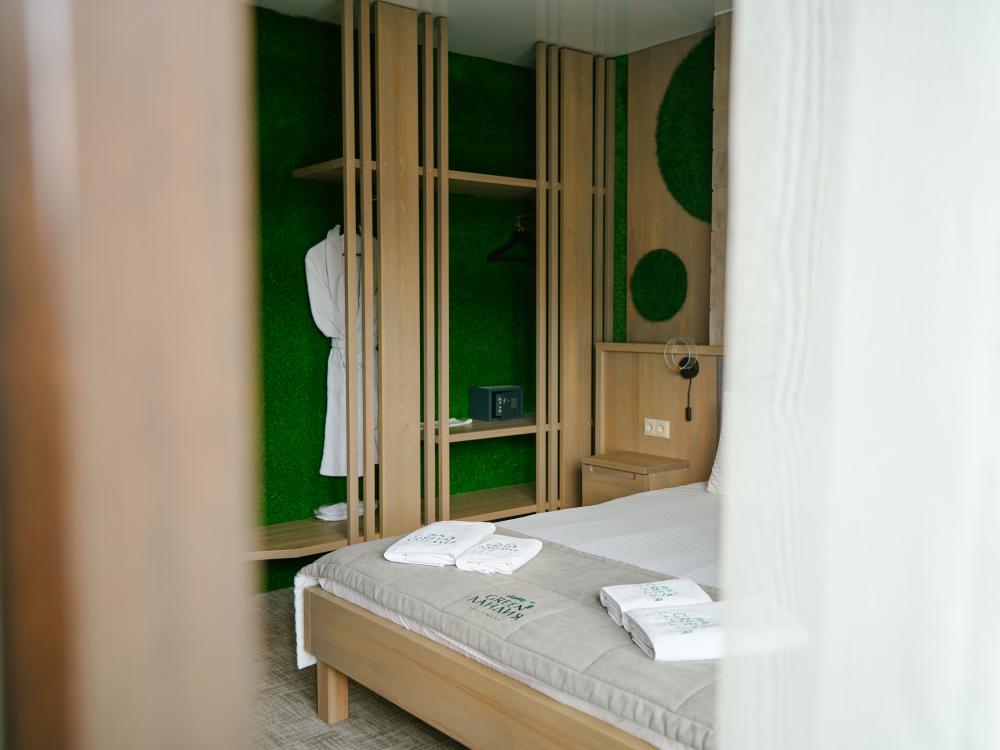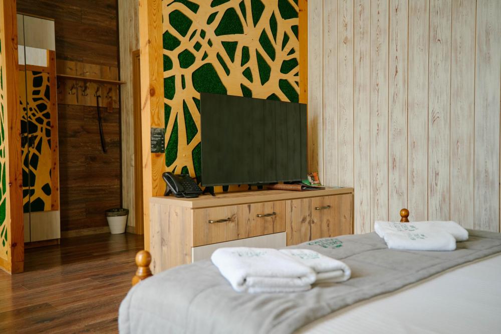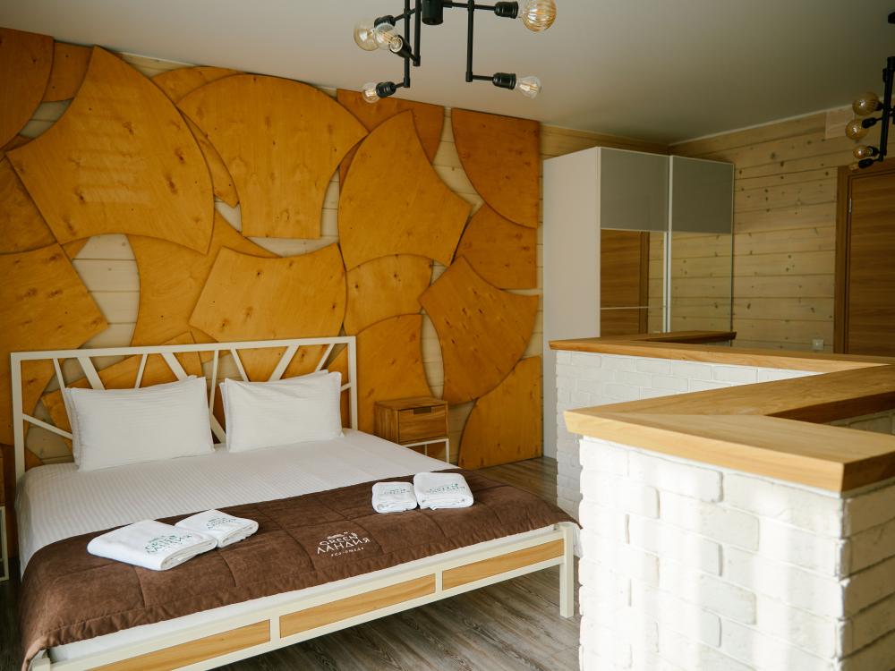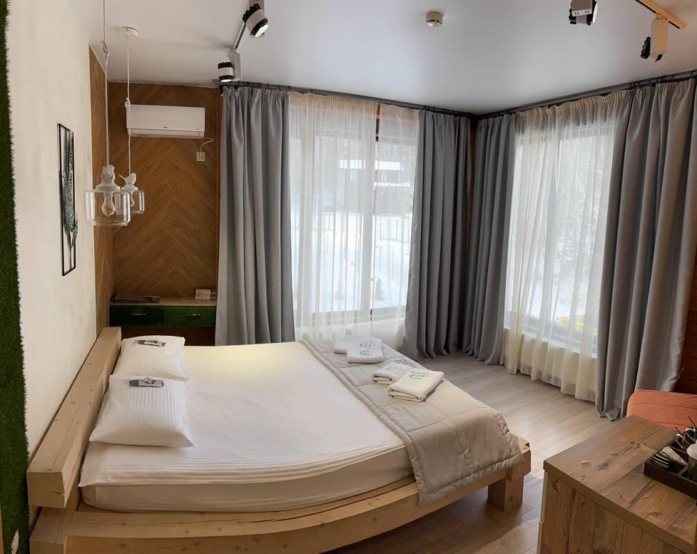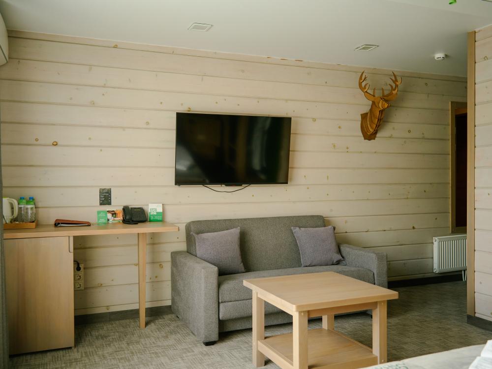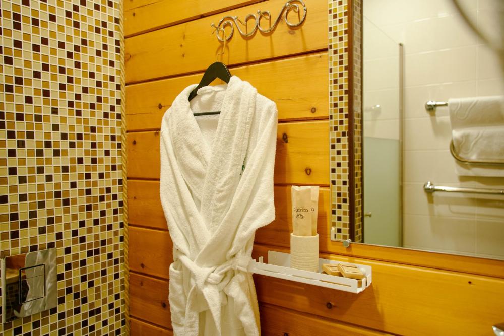 В номере: двуспальная кровать, вместительный шкаф, холодильник, чайник, телевизор. Панорамные окна с видом на лес и горы. Барная стойка для романтических ужинов. Туалетная комната оснащена всем необходимым по количеству гостей: халаты, тапочки, полотенца, наборы для душа, фен.