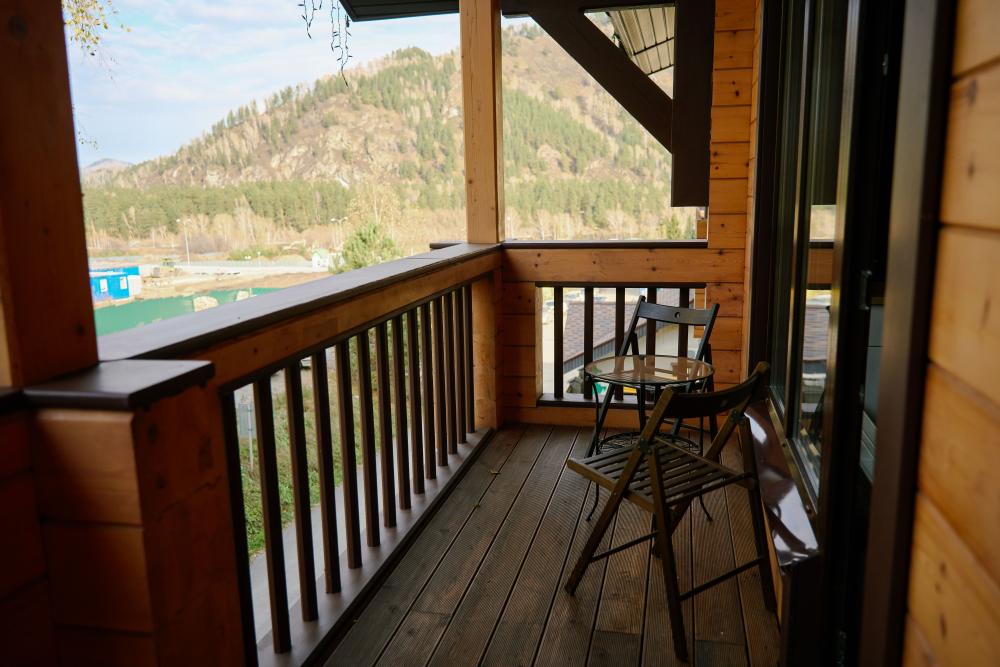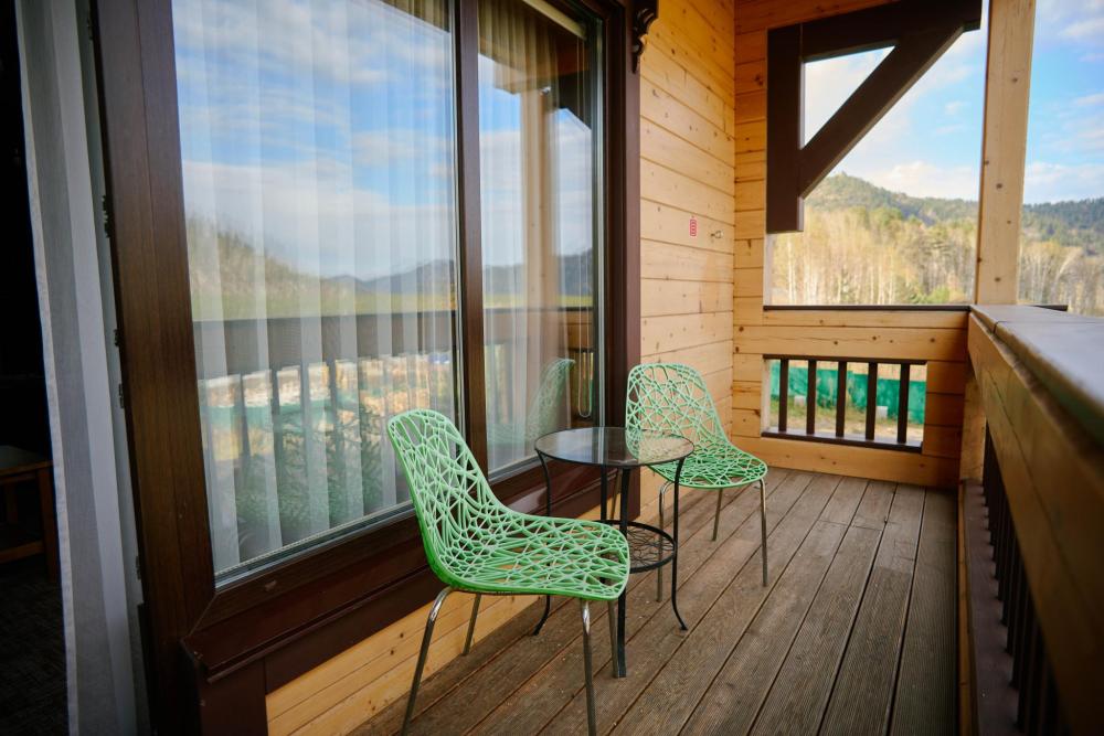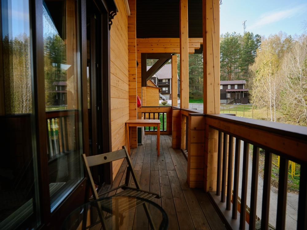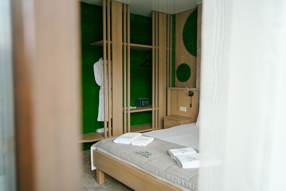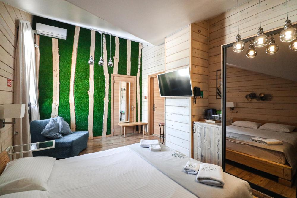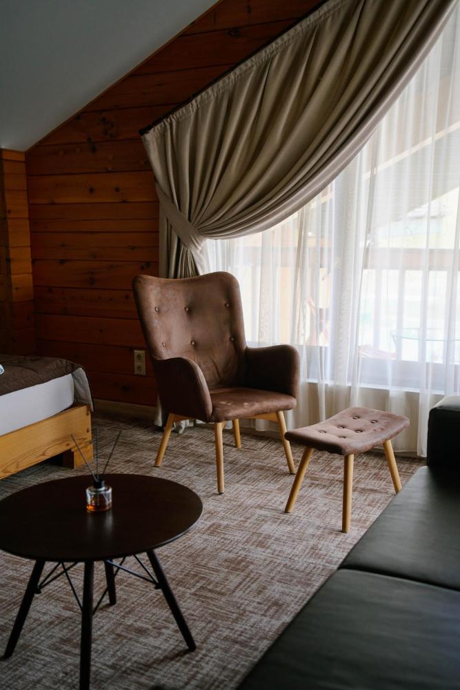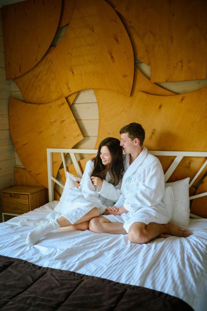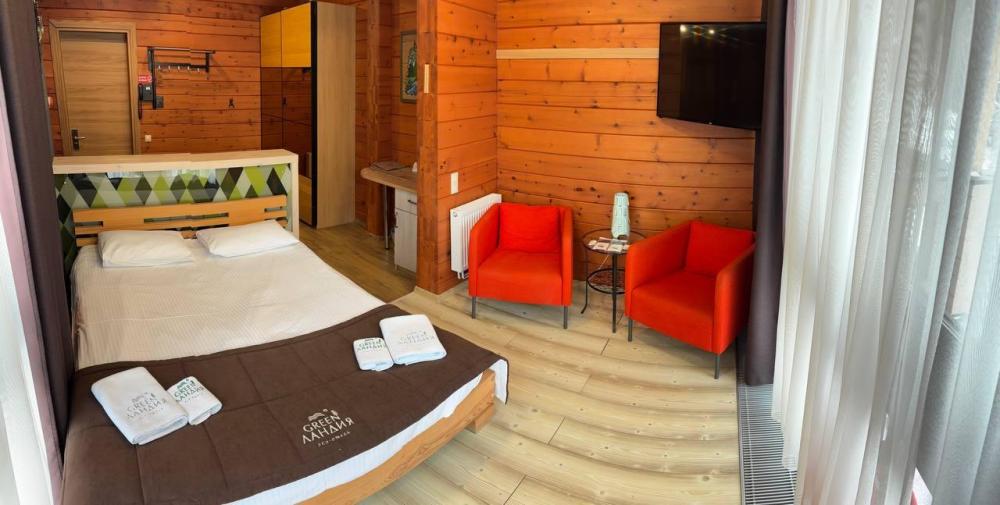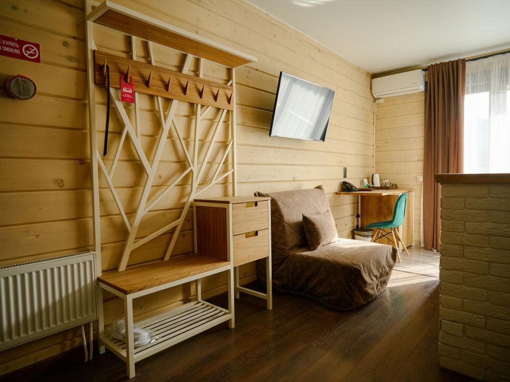 В номере: двуспальная кровать, вместительный шкаф, холодильник, чайник, телевизор. Панорамные окна с видом на лес и горы. Барная стойка для романтических ужинов. Туалетная комната оснащена всем необходимым по количеству гостей: халаты, тапочки, полотенца, наборы для душа, фен.
