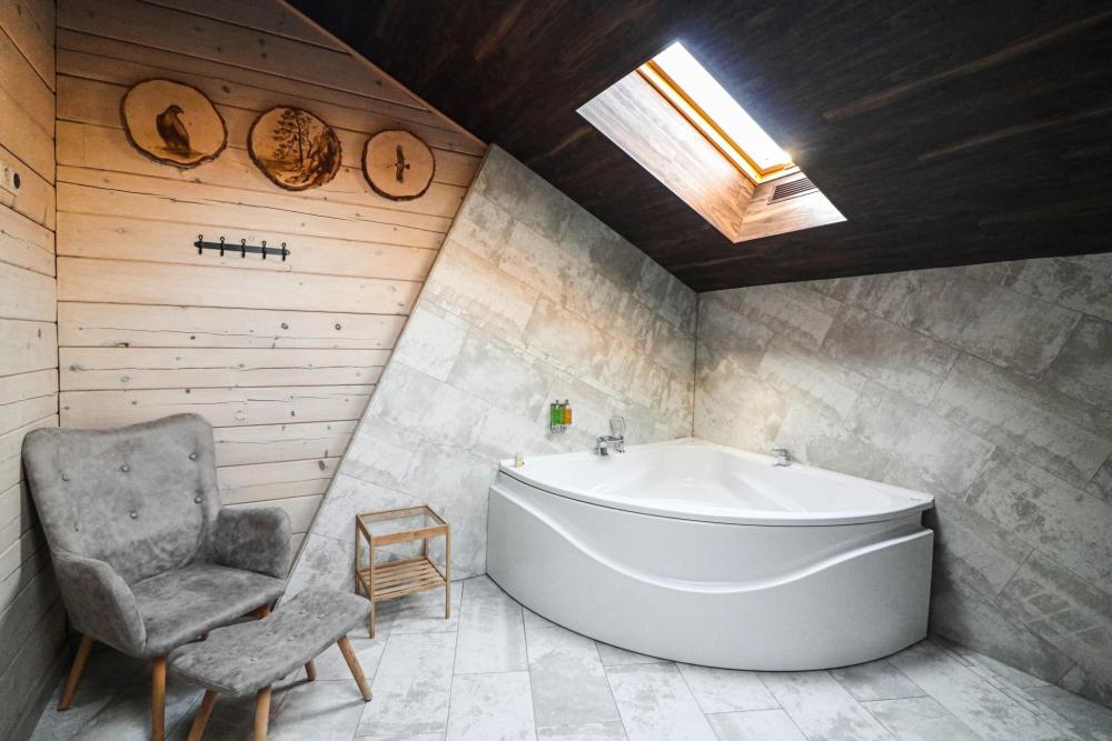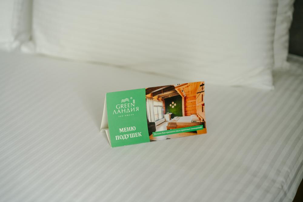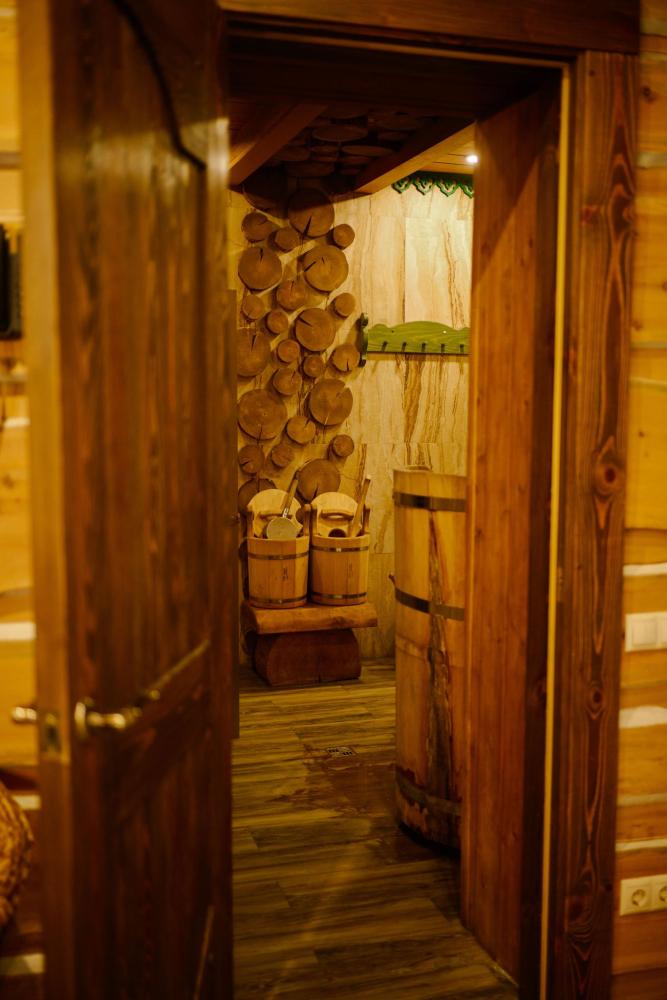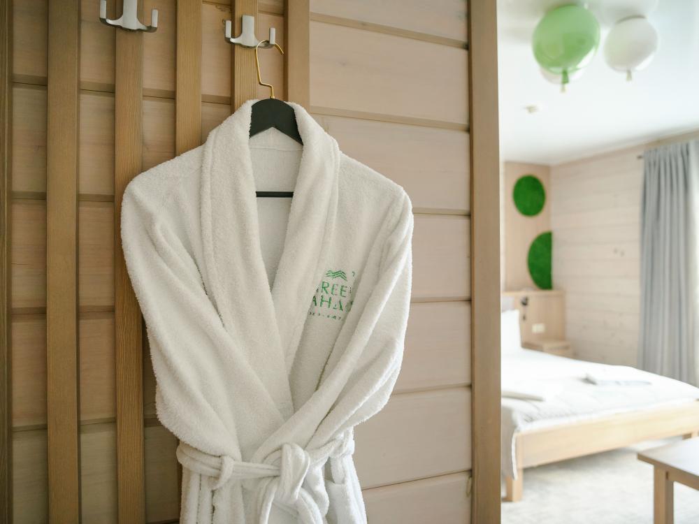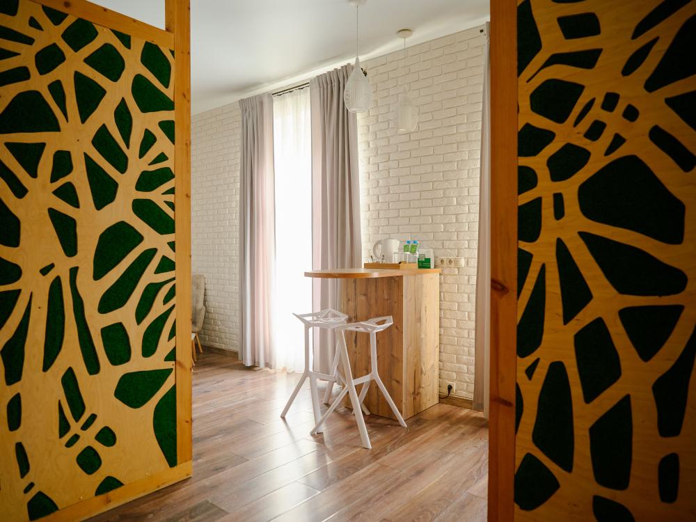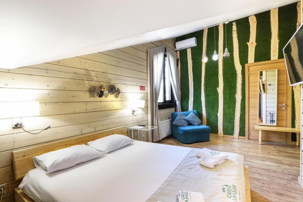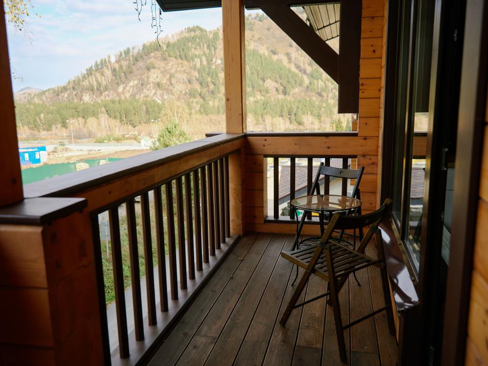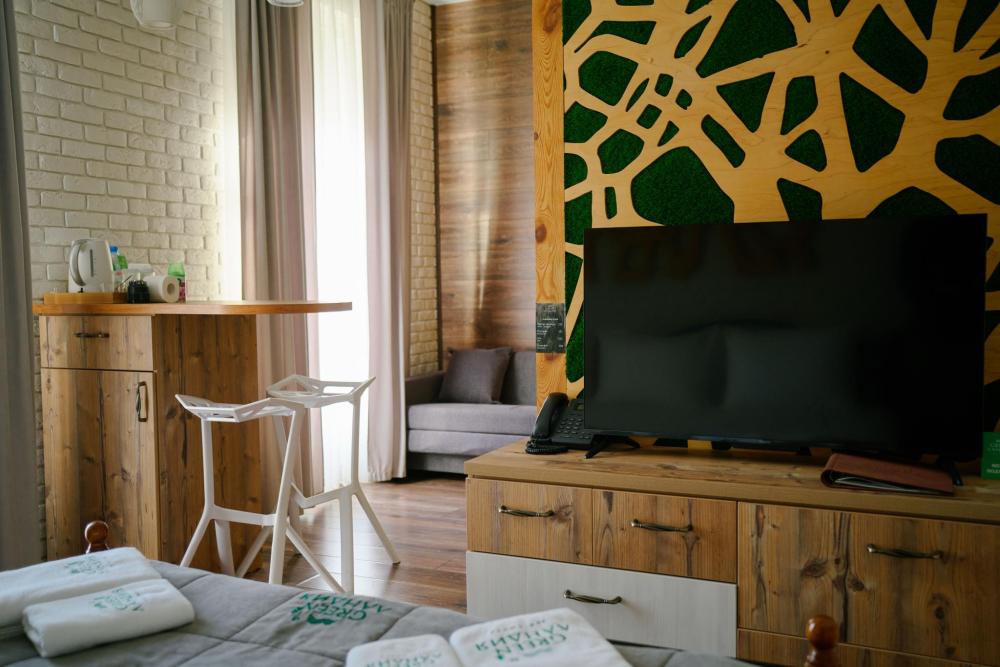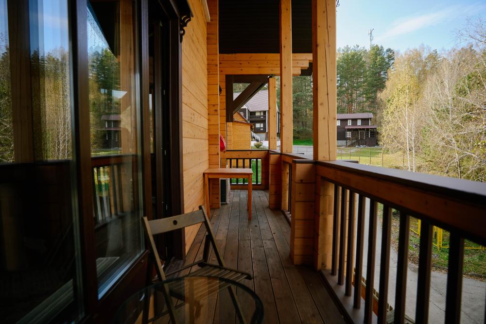 В номере: двуспальная кровать, вместительный шкаф, холодильник, чайник, телевизор. Панорамные окна с видом на лес и горы. Барная стойка для романтических ужинов. Туалетная комната оснащена всем необходимым по количеству гостей: халаты, тапочки, полотенца, наборы для душа, фен.