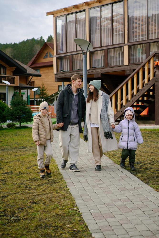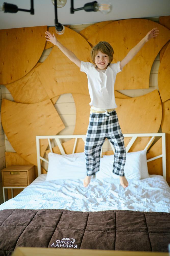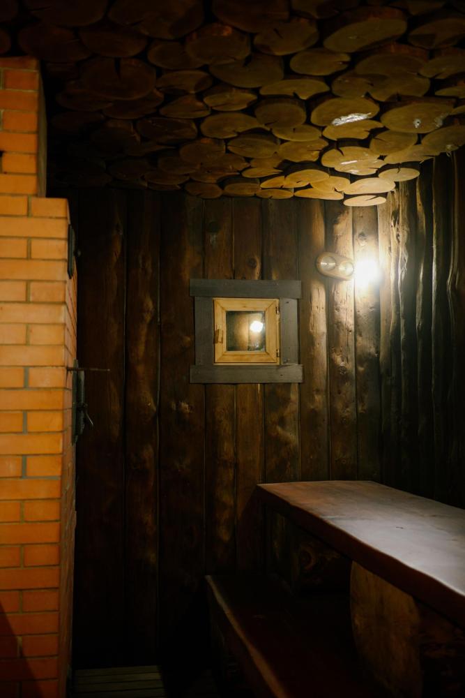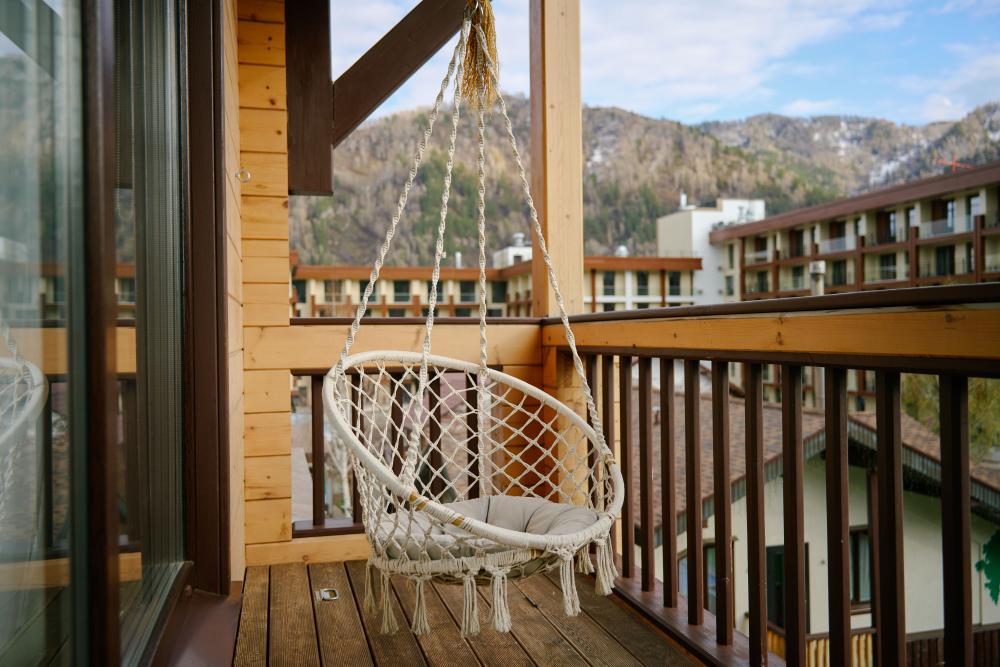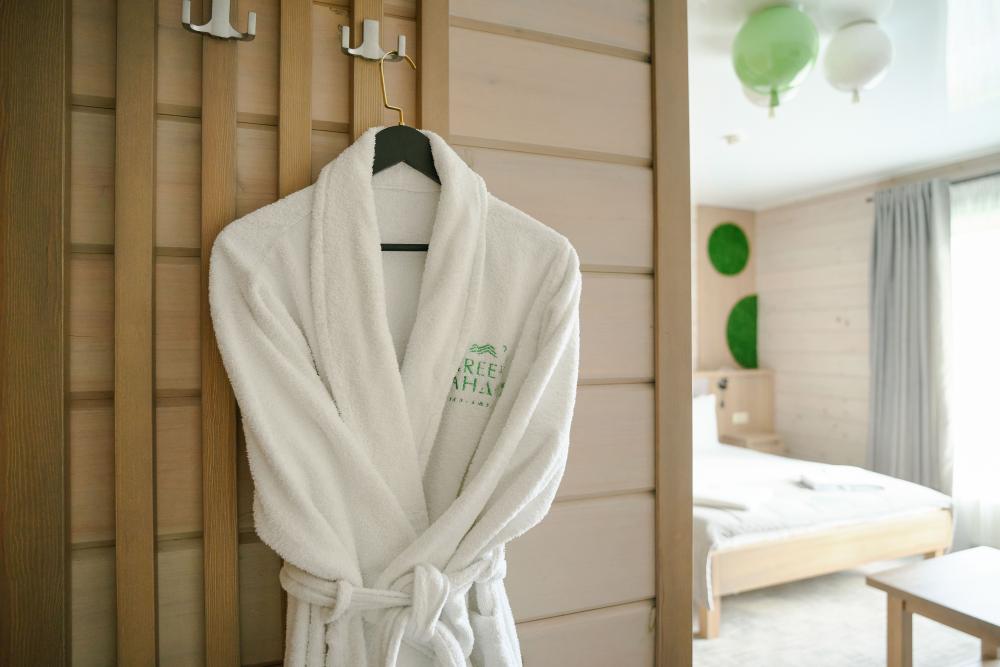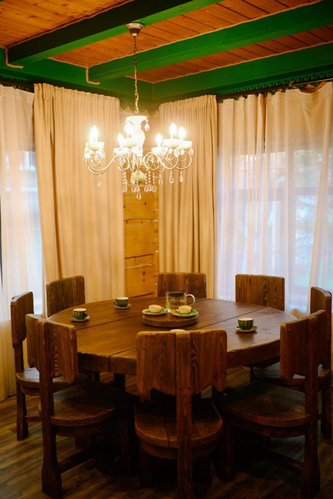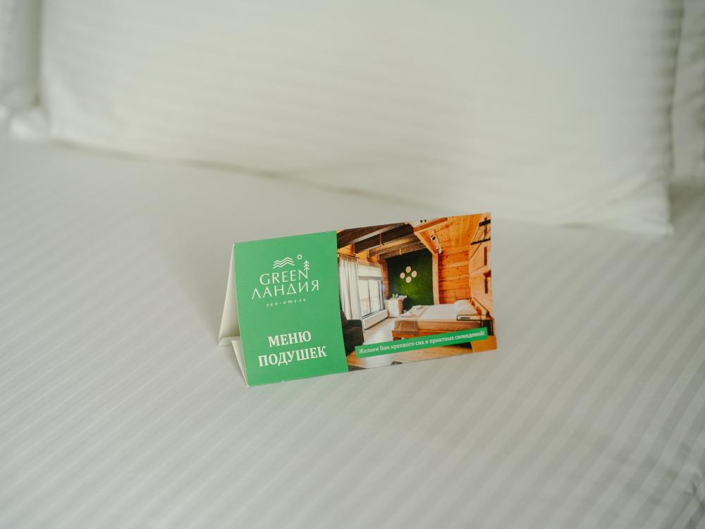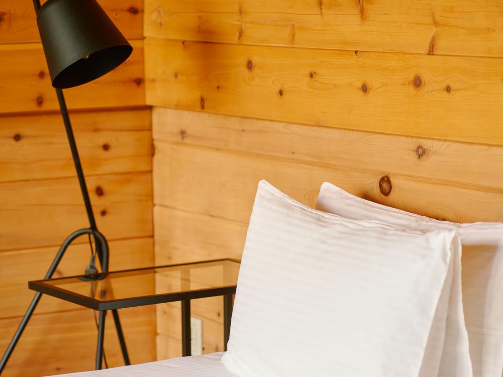 В номере: двуспальная кровать, вместительный шкаф, холодильник, чайник, телевизор. Панорамные окна с видом на лес и горы. Барная стойка для романтических ужинов. Туалетная комната оснащена всем необходимым по количеству гостей: халаты, тапочки, полотенца, наборы для душа, фен.