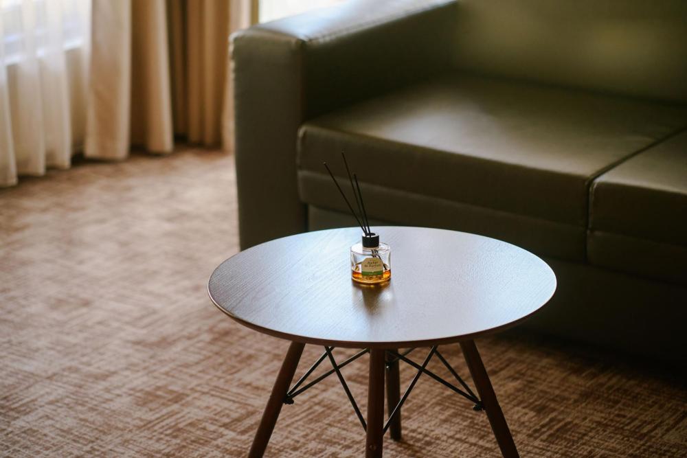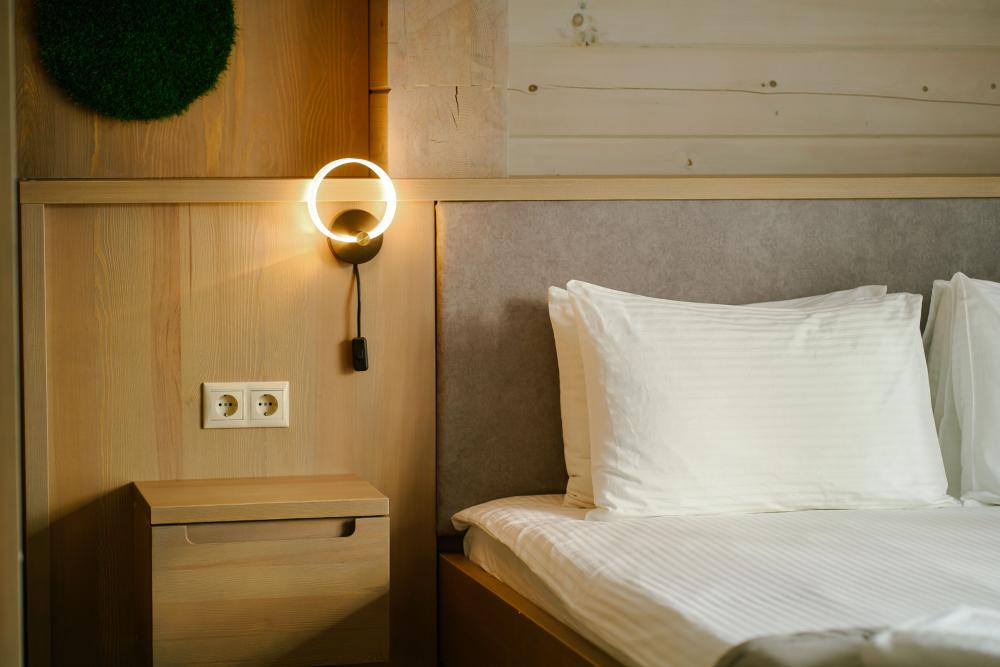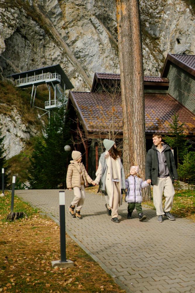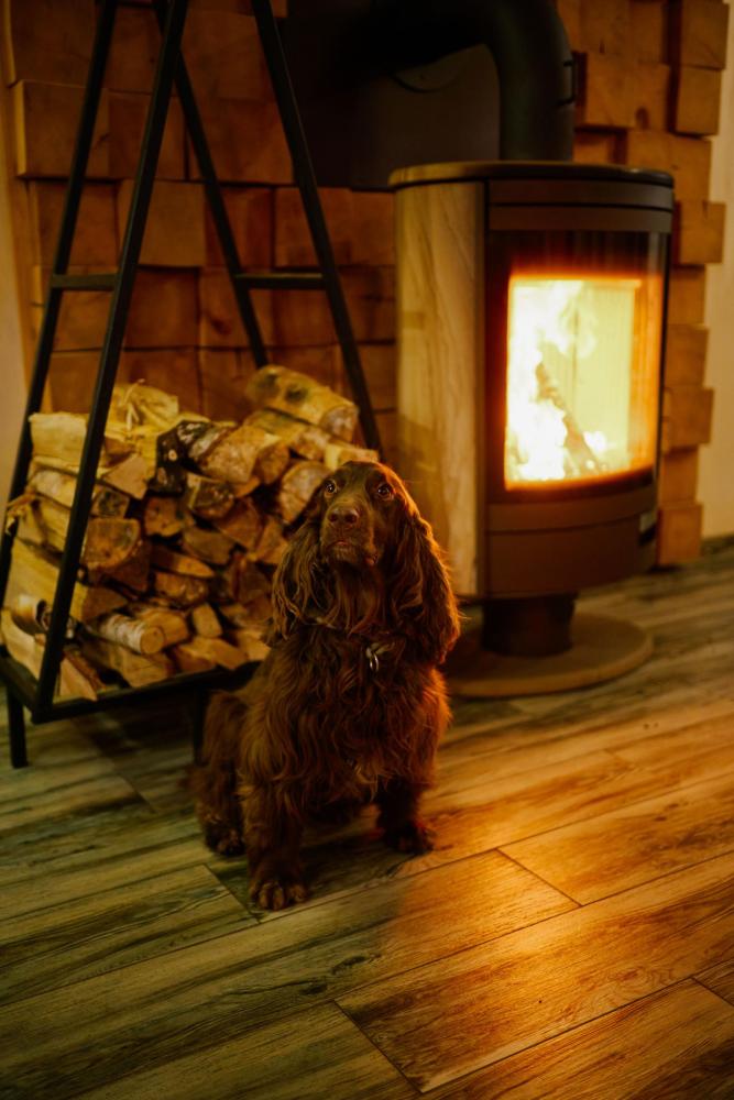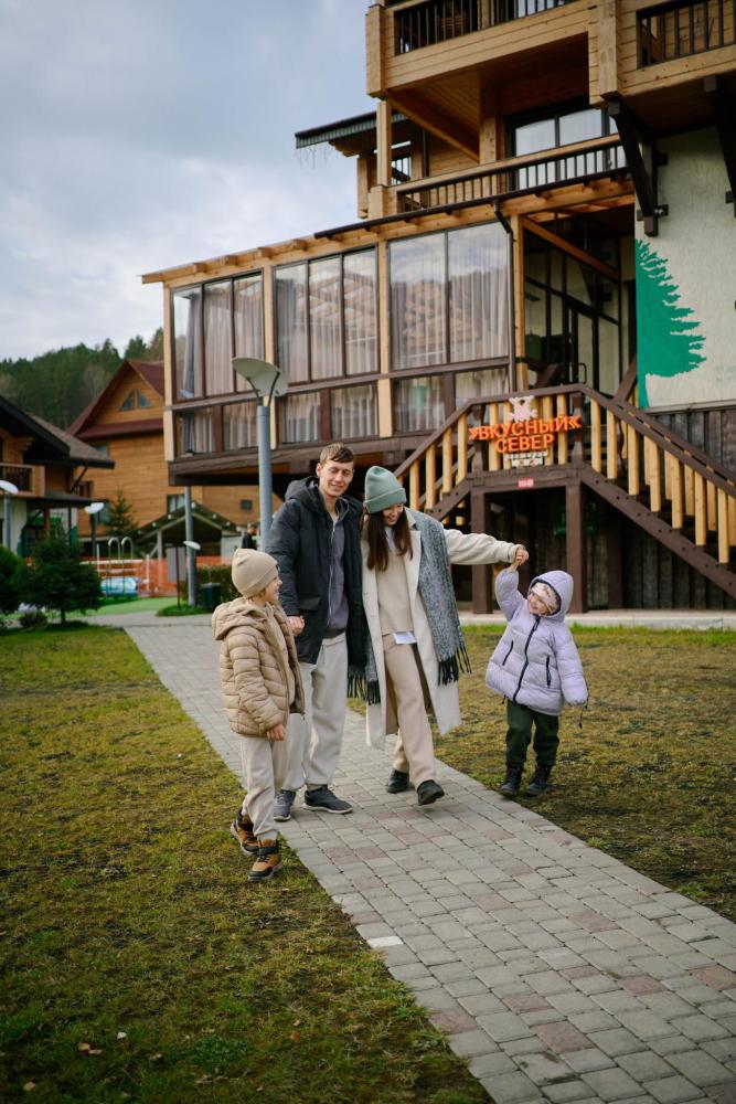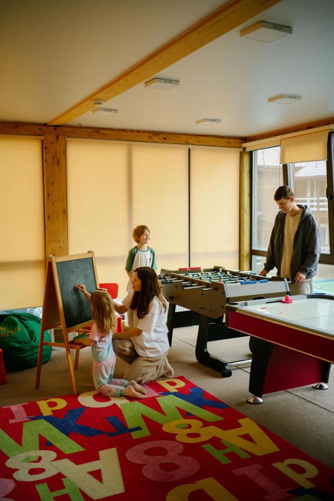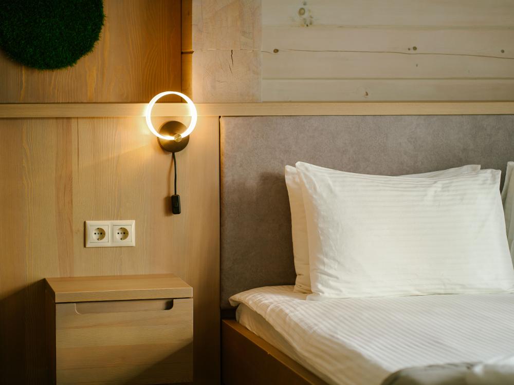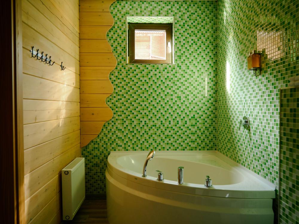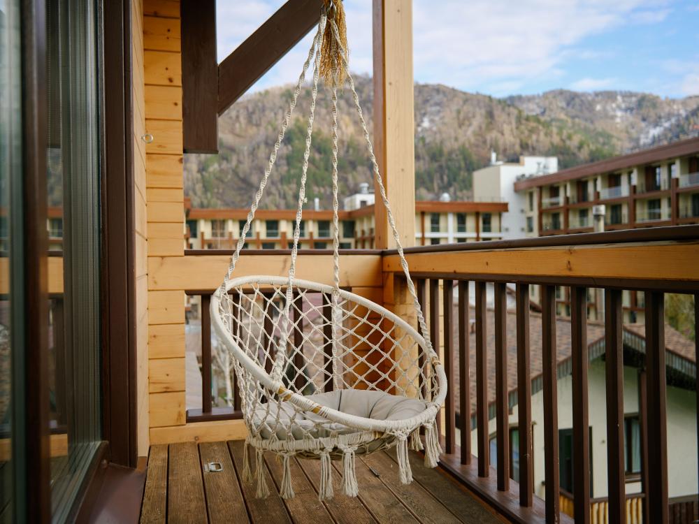 В номере: двуспальная кровать, вместительный шкаф, холодильник, чайник, телевизор. Панорамные окна с видом на лес и горы. Барная стойка для романтических ужинов. Туалетная комната оснащена всем необходимым по количеству гостей: халаты, тапочки, полотенца, наборы для душа, фен.